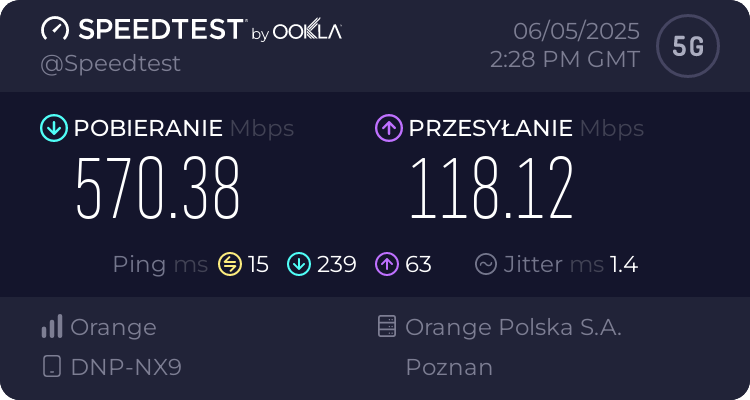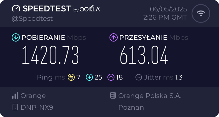 W zasięgu pasma C (3,6 GHz) transfery danych do użytkownika bez problemu sięgały 550-600 Mbps w godzinach komunikacyjnego szczytu. Nie mam też zastrzeżeń do pracy Wi-Fi, choć niestety z braku odpowiedniego AP testy Wi-Fi 7 są z konieczności niepełne. Podczas połączenia WiFi 6E smartfon łączył się z routerem w paśmie 6 GHz, z prędkością 2402 Mbps, co pozwoliło na osiągnięcie rzeczywistych transferów rzędu 1,4-1,5 Gbps.