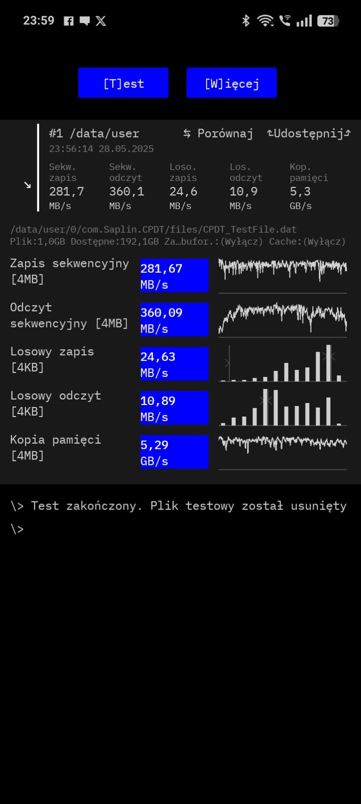 - szybkość ciągłego zapisu danych: 281 MB/s,