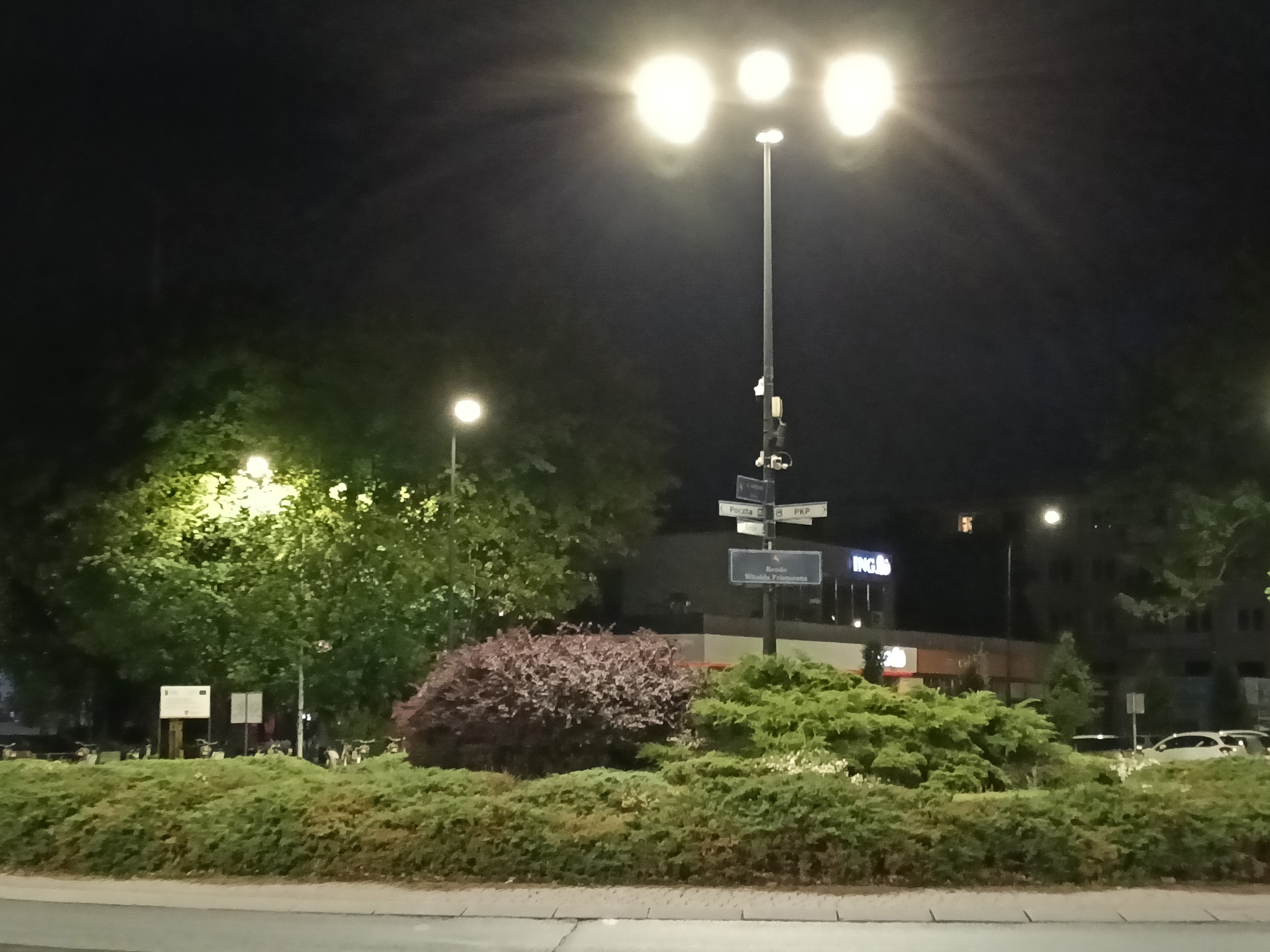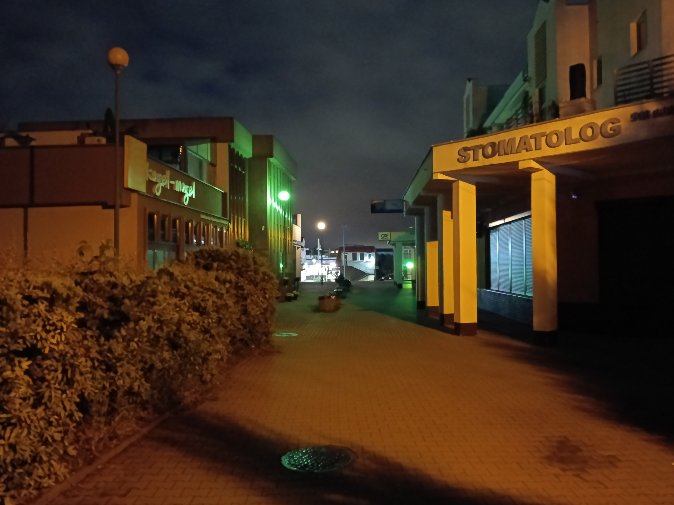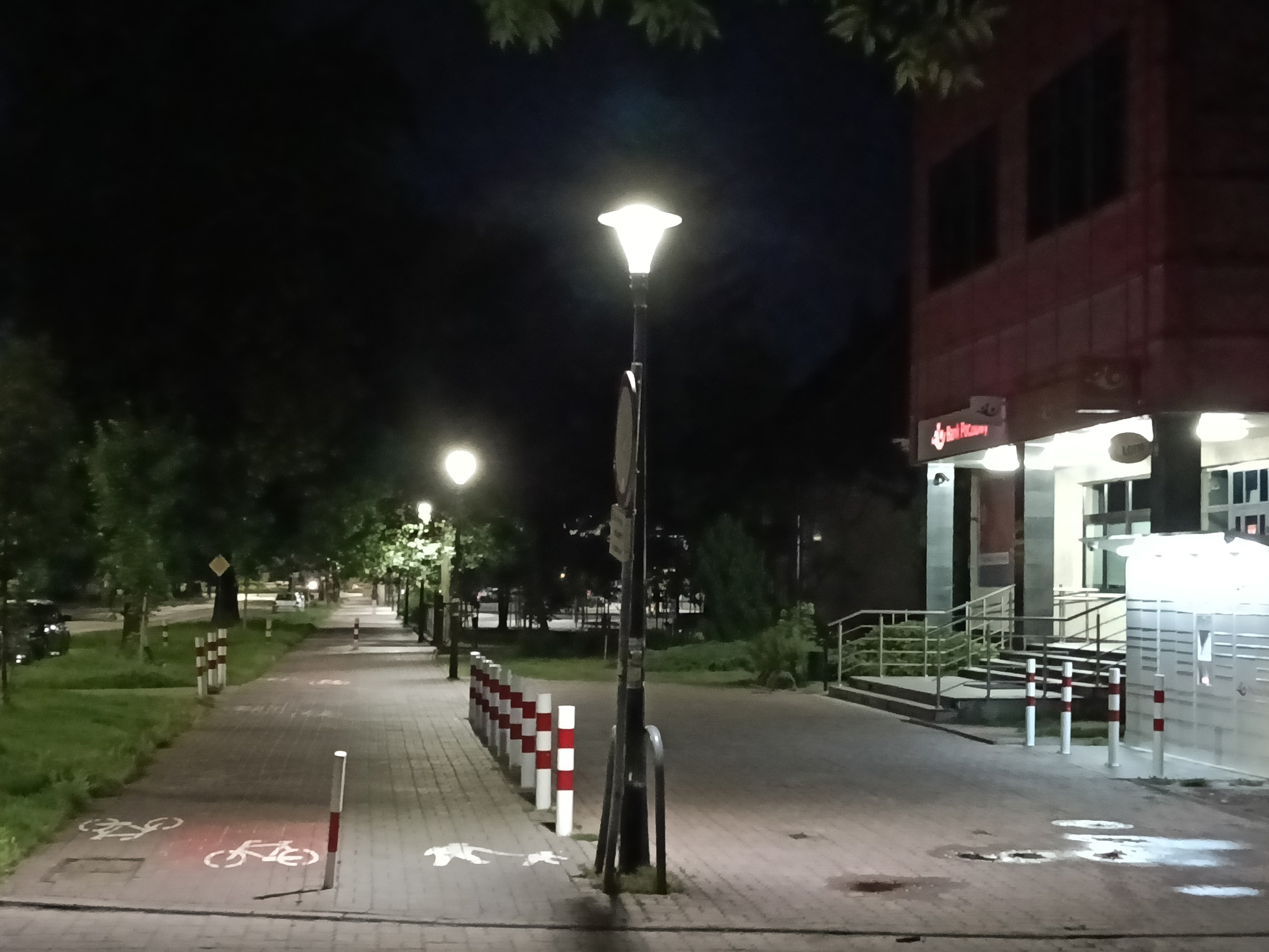Jakość trybu nocnego jest nieakceptowalna. W A5 Pro 5G trzeba go włączyć ręcznie, zdjęcia wyglądają słabo, nawet gdy zrobione są przy takiej ilości sztucznego światła, że Pixel czy iPhone w ogóle nie uznają potrzeby przełączania się na nocne zdjęcia. Przy skąpym świetle jest zupełnie źle – zdjęcia są pełne artefaktów, wynikających z jednocześnie z agresywnego odszumiania i wyostrzania, brak im szczegółów i ostrości. Powiększenie ×2 nie nadaje się do użytku.