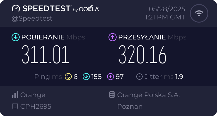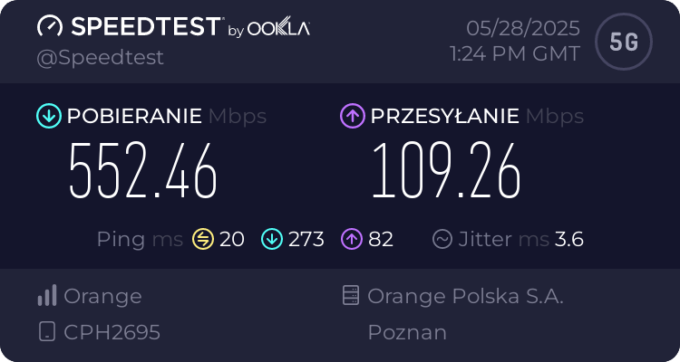 Znacznie lepiej prezentowała się wydajność 5G. Z kartą Orange Flex w sieci 3,6 GHz można było liczyć na wyniki rzędu 550 Mbps przy pobieraniu i około 100 Mbps przy wysyłaniu, co jest w mojej lokalizacji wynikiem porównywalnym z flagowcami.