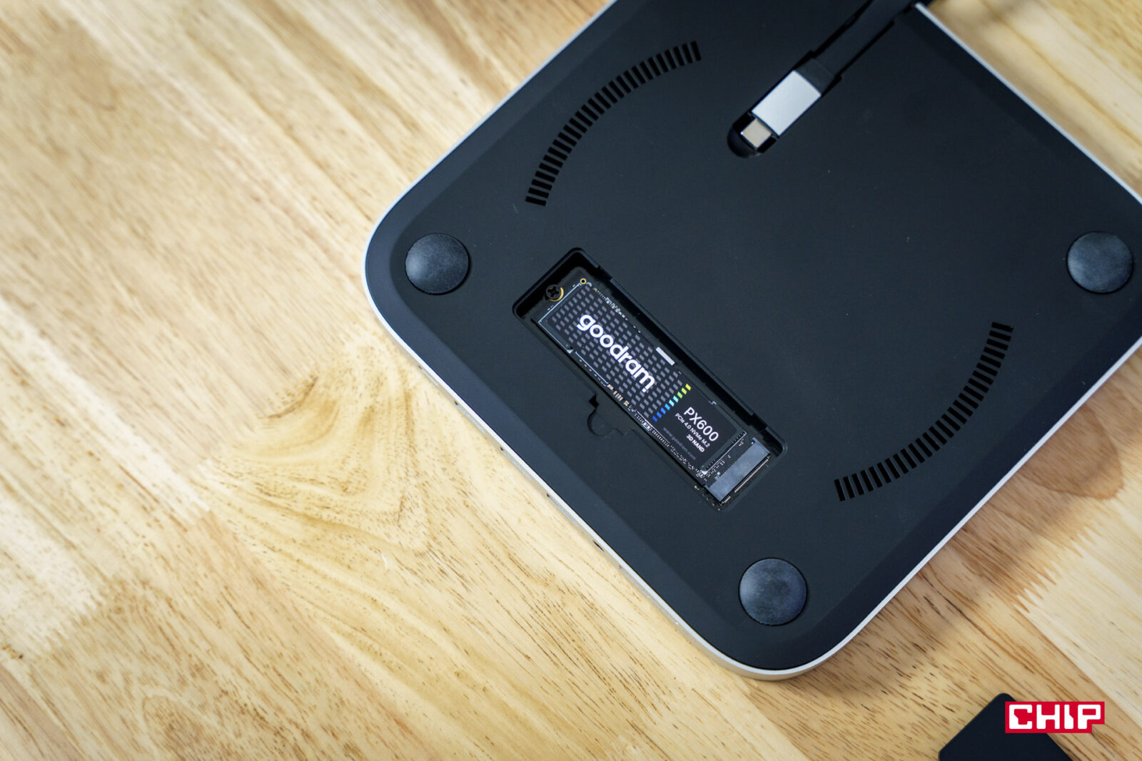 Montaż dysku SSD to kwestia kilku minut. W zestawie znajdziemy śrubokręt i odpowiednie śruby, więc nie trzeba szukać dodatkowych narzędzi. Wystarczy odkręcić dolną pokrywę, wsunąć dysk M.2 i zabezpieczyć śrubką. Użyty przez nas GOODRAM PX600 w rozmiarze 2280 pasuje idealnie – żadnych problemów z montażem czy kompatybilnością. Proste jak konstrukcja cepa.
