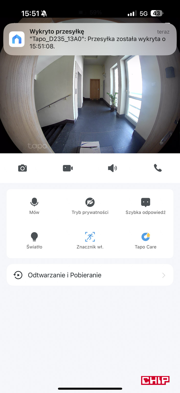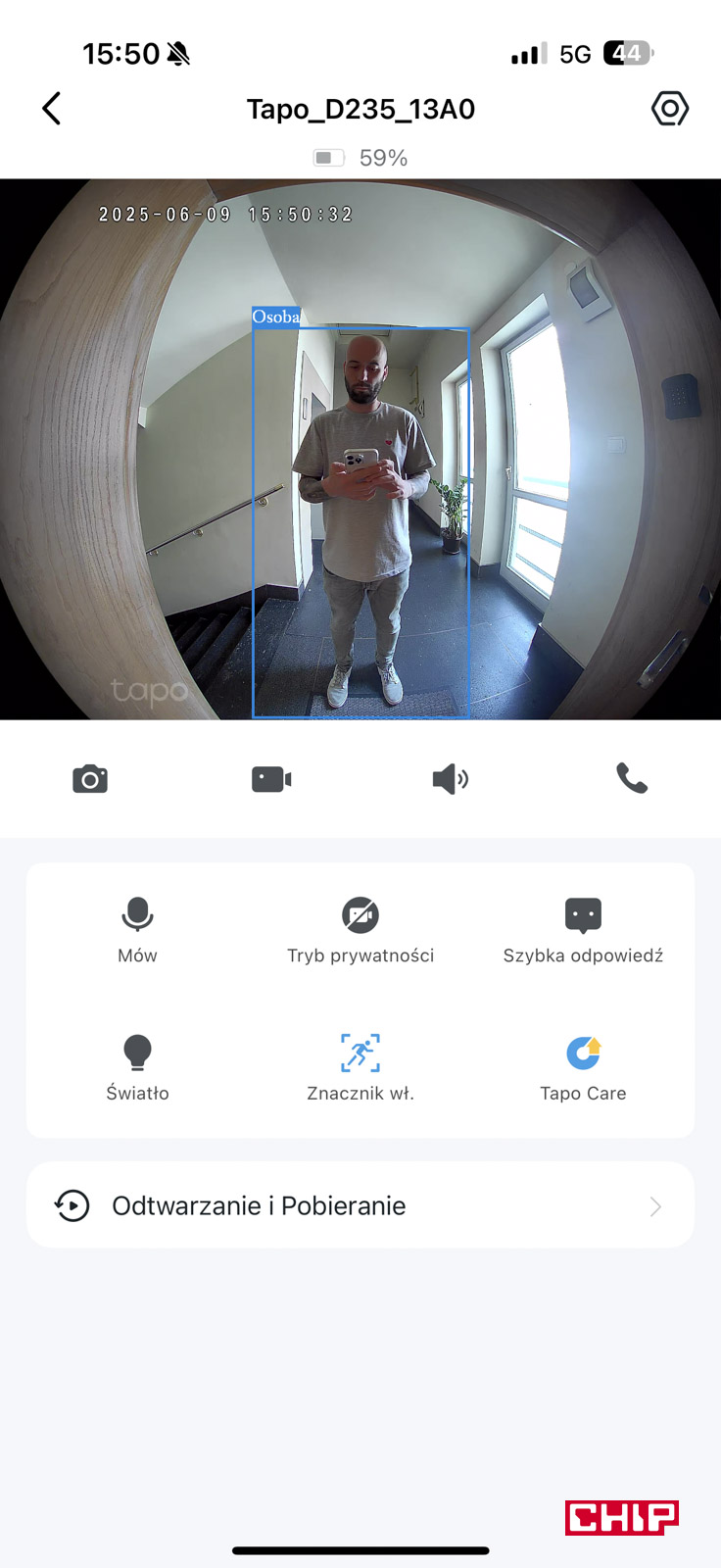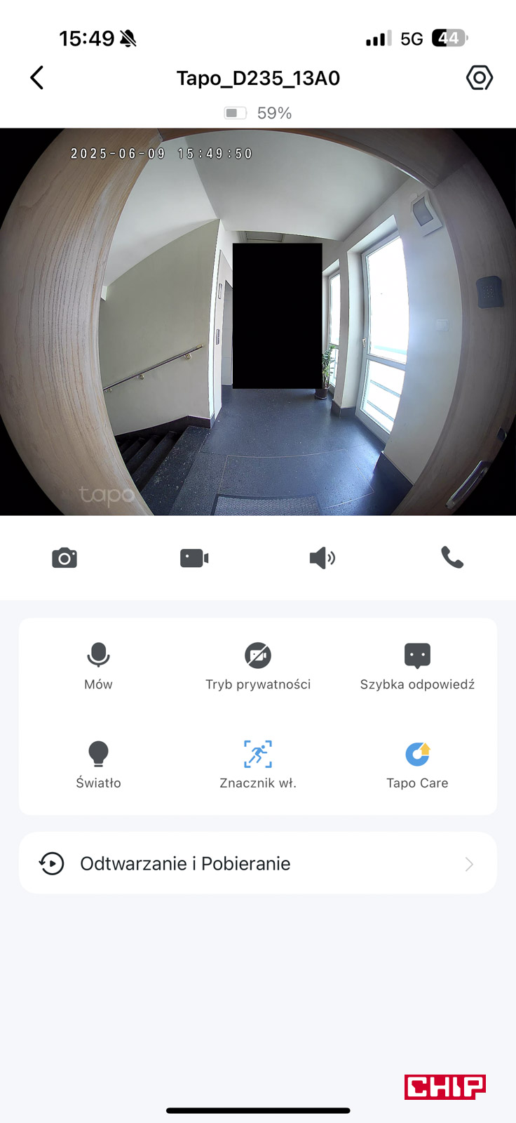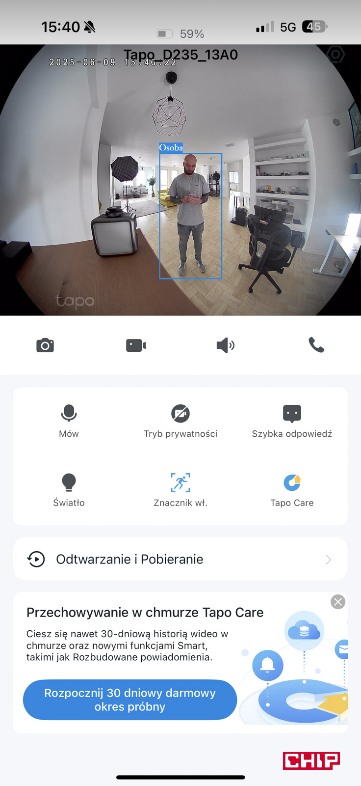 Obraz z kamery możemy rejestrować w formie zdjęcia lub wideo. Możemy to robić ręcznie przyciskiem w aplikacji lub w pełni automatycznie. Pliki mogą być zapisywane na karcie pamięci (microSD do 512 GB) lub w chmurze. Przy zakupie TP-Link Tapo D235 mamy możliwość skorzystania z 30-dniowego okresu próbnego, po którym roczna subskrypcja Tapo Care kosztuje 169,99 zł. Nagrania są przechowywane przez okres 30 dni i na dobrą sprawę jest to stały monitoring wejścia do domu lub mieszkania. W dowolnym momencie możemy włączyć tryb prywatności i kiedy jest aktywny obraz nie jest zapisywany lokalnie, ani w chmurze. Na wypadek, gdybyśmy chcieli kogoś przemycić do domu. Nie wnikajmy w motywacje…