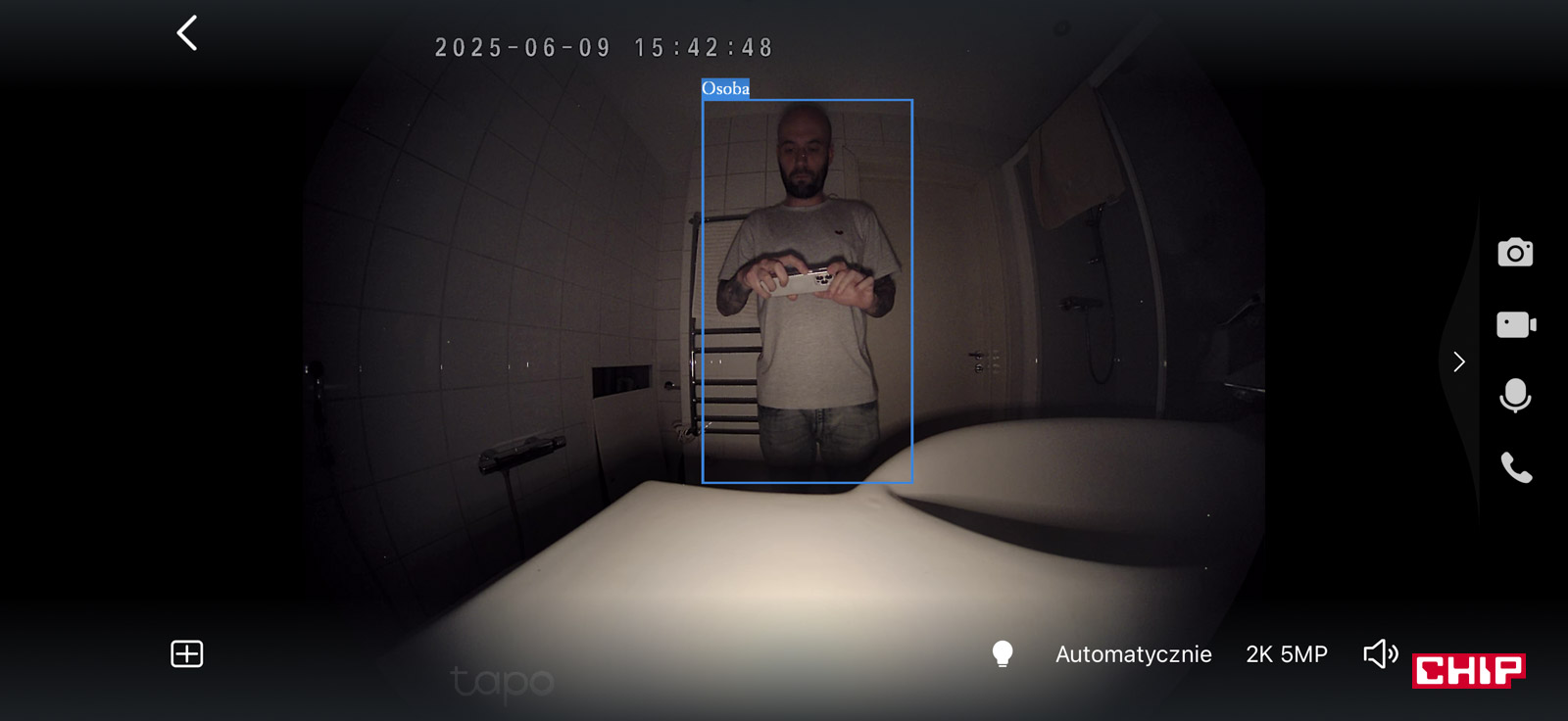 Kamera ma matrycę o rozdzielczości 5 Mpix i obiektyw z efektem rybiego oka. Na stronie internetowej producenta mamy informację o polu widzenia 160 stopni w poziomie i 140 stopni w pionie, na obudowie mamy z kolei informację o 180 stopniach. Kto ma rację? Nie wiem, ale ktoś mógłby to w TP-Linku ustalić. Niemniej obraz jest naprawdę bardzo szeroki. Jeśli zamontujemy TP-Link Tapo D235 na wysokości 120-140 cm (producent sugeruje 120 cm) to w zupełności wystarcza, aby widzieć całą sylwetkę osoby stojącej przed kamerą w odległości niecałych 50 cm.
