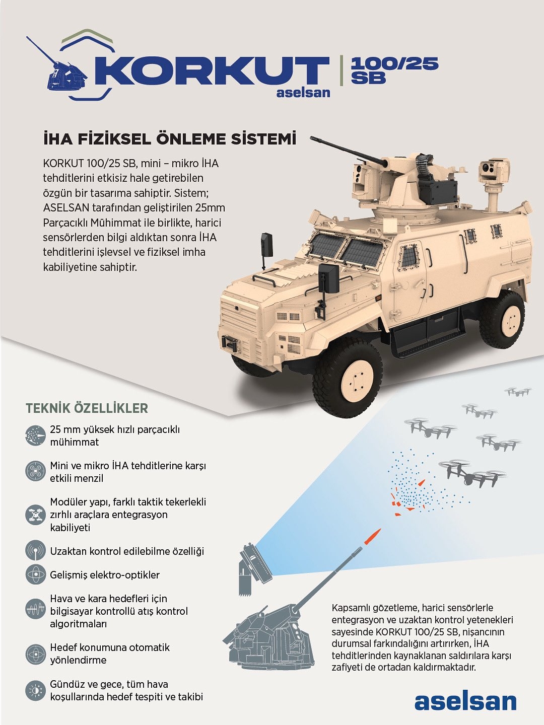 Zamiast posuwania się do walki elektronicznej czy wykorzystywania wysokoenergetycznej broni pokroju mikrofal, czy laserów, KORKUT 100/25 SB wykorzystuje szybkostrzelne działo automatyczne kal. 25 mm. To nie pełni jednak tak wielkiej roli, jak wykorzystywana w nim programowana amunicja odłamkowo-burzącą (Atom 25), która eksploduje w ściśle określonej odległości od celu. Dzięki niej turecki KORKUT 100/25 SB ma móc wykrywać, śledzić i niszczyć mikro- i mini-drony w każdych warunkach pogodowych i o każdej porze dnia, choć nie jest pierwszym tego typu sprzętem. Pamiętajmy bowiem, że KORKUT występował już w wydaniu z działem kalibru 35 mm, ale jego 25-mm wariant oferuje lżejszą i bardziej zwrotną odpowiedź, która ma być idealna na małe drony.