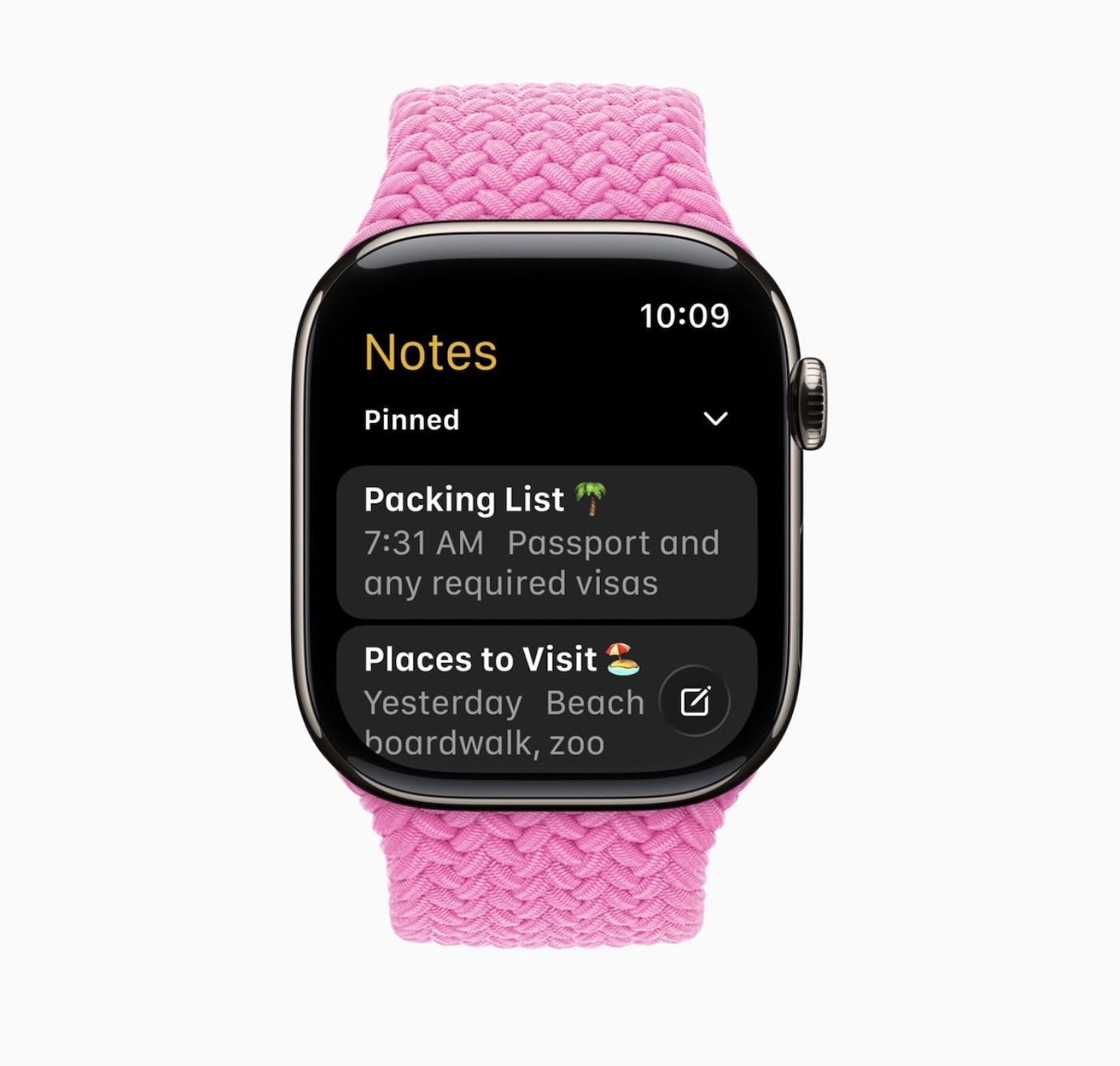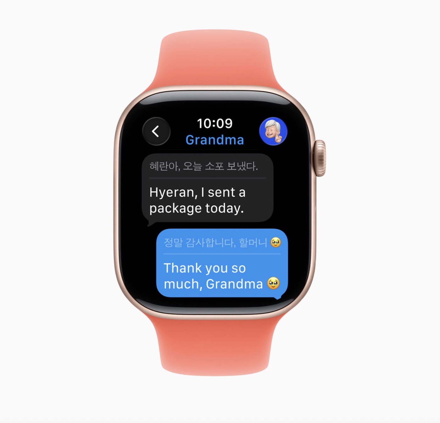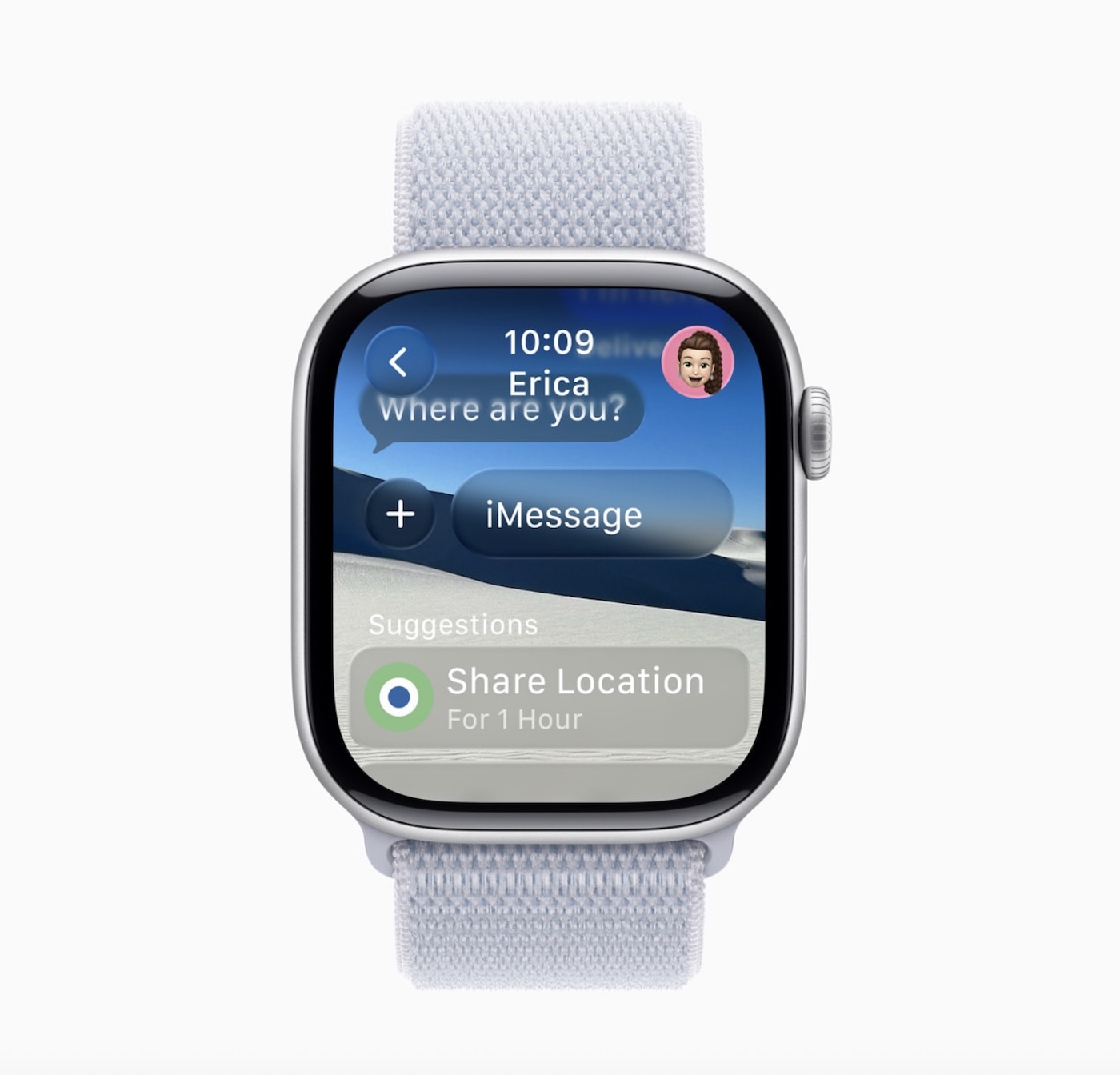 Dla użytkowników anglojęzycznych zegarek inteligentnie sugeruje akcje na podstawie kontekstu rozmowy, na przykład uruchomienie funkcji Check In, gdy znajomy prosi o informację o dotarciu do domu, lub użycie Apple Cash, gdy ktoś prosi o wkład w grupowy prezent. Rozmowy stały się też bardziej osobiste dzięki niestandardowym tłom, które synchronizują się z iPhone’em, oraz możliwości odpowiadania na ankiety bezpośrednio z zegarka. Inteligentne odpowiedzi także są teraz dokładniejsze dzięki ulepszonemu modelowi językowemu, który lepiej rozumie treść rozmowy.