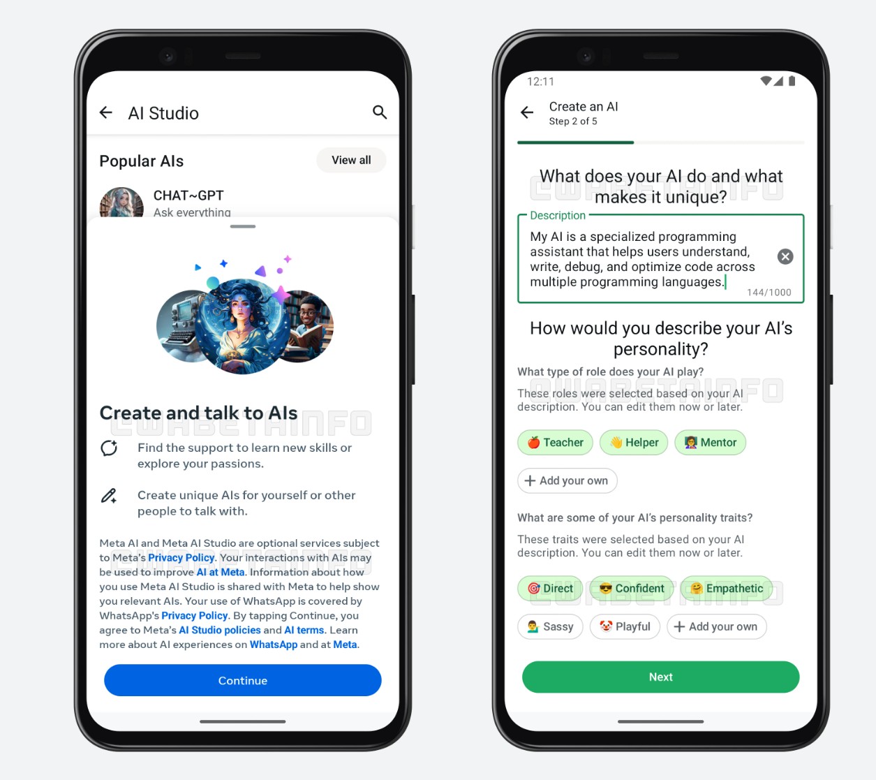 To było zresztą wiadome od dawna, bo beta dla Androida w wersji 2.25.1.26, wydana w styczniu, zawierała tę funkcję dla niektórych testerów. Z najnowszą wersją 2.25.18.4, wydaje się, że WhatsApp testuje tę funkcję z szerszą publicznością, co sugeruje jej rychłe wydanie. Zrzuty ekranu z aplikacji, uzyskane przez WABetaInfo, pokazują, że możesz opisać swoją AI, wybrać jej osobowość, cechy, obraz i wiele więcej. Proces wydaje się być identyczny z tym dostępnym już w Messengerze.