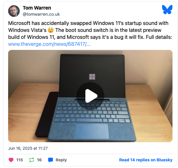 W wersji Dev Channel o numerze 26200.5651, wydanej 13 czerwca 2025 roku, Microsoft przypadkowo zamienił dźwięk uruchamiania Windows 11 na ikoniczny sygnał z Windows Vista. Microsoft szybko przyznał się do błędu i dodał go do listy znanych problemów: “Ten bug przynosi zachwycający powrót z przeszłości i będzie odtwarzał dźwięk uruchamiania Windows Vista zamiast Windows 11. Pracujemy nad poprawką”.