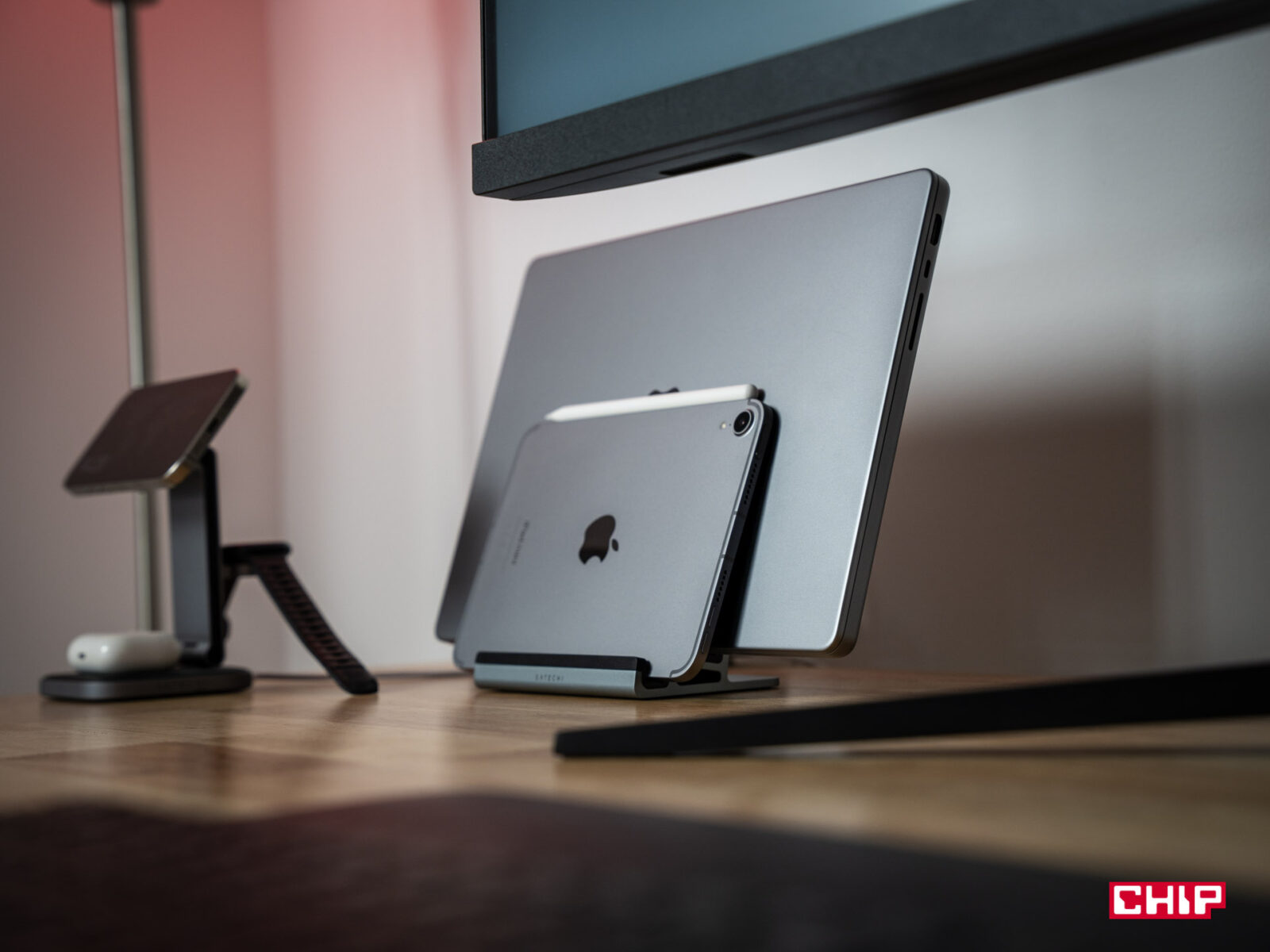 Poza stojakiem Twelve South chciałem dodatkowo coś, co pozwoli mi ewentualnie korzystać z MacBooka w trybie clamshell, a jednocześnie będzie hubem dla mojego iPada. Pionowy stojak Satechi okazał się dobrym wyborem. To solidny kawałek aluminium z dwiema szczelinami, które pozwalają przechowywać równocześnie dwa urządzenia — u mnie są to właśnie MacBook Pro i iPad mini. Wszystko stoi pionowo, nic się nie przewraca i, co równie ważne, zajmuje dużo mniej miejsca.