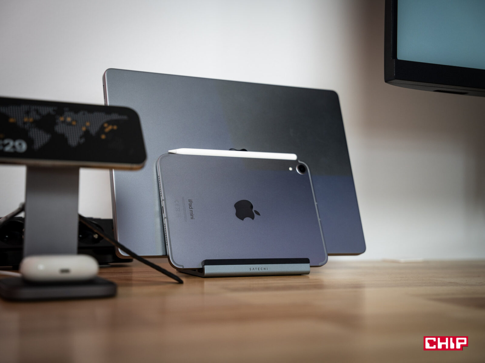 Wygląd? Typowo „apple’owski” — matowe aluminium w kolorze Space Gray bez zbędnych ozdobników, pasujące do reszty sprzętu. Nie rzuca się w oczy, ale też nie wygląda jak tani plastik. To detal, ale ważny, jeśli ktoś lubi mieć na biurku estetyczny porządek. Wewnętrzne krawędzie obu przegródek są wyłożone miękkim, gumowym materiałem, więc nie trzeba się martwić, że cokolwiek się porysuje; MacBooka odkładałem tam bez żadnego case’a (nie uznaję zresztą etui na laptopy) i nie ma żadnych rys. Całość, chociaż mała, jest zaskakująco ciężka — ale w tym przypadku to dobrze, bo nie ma strachu odłożyć do tego 14-calowego laptopa i nawet większego, 13-calowego iPada.
