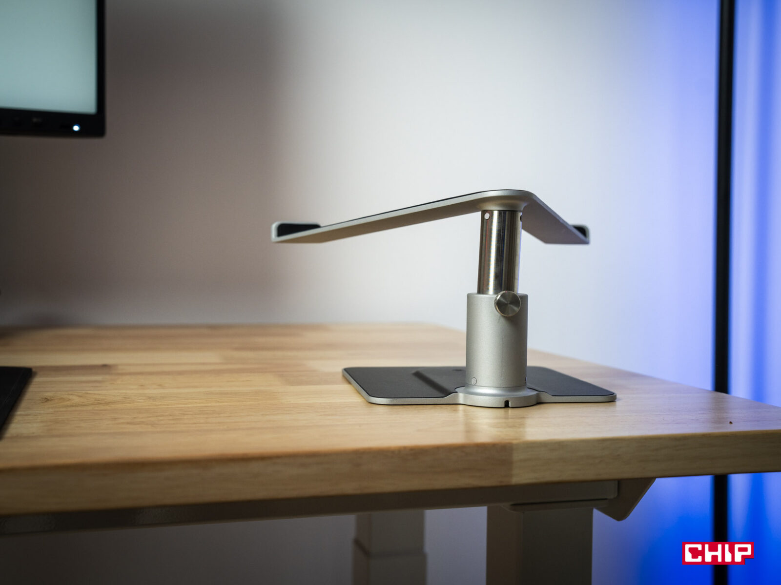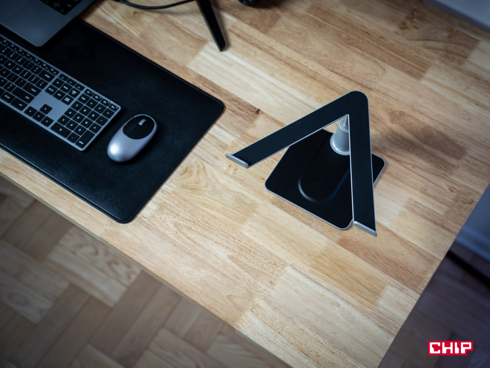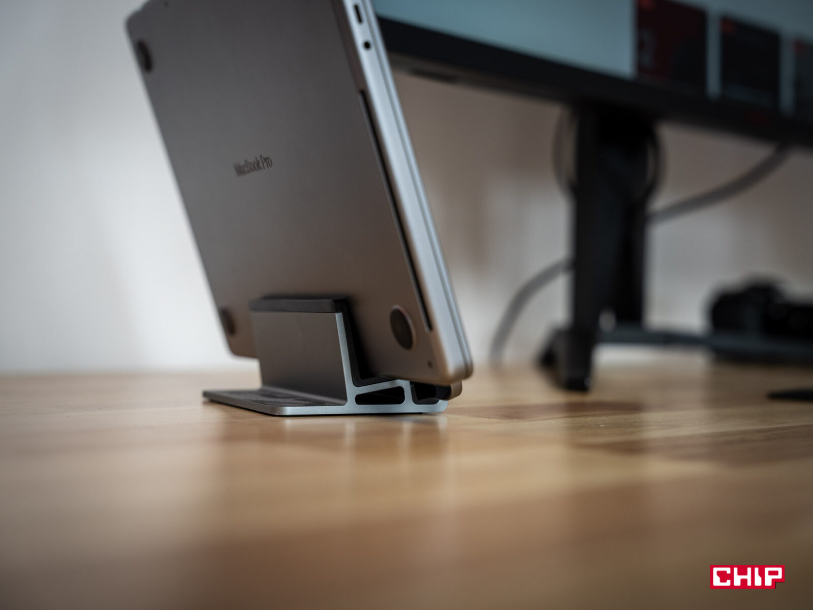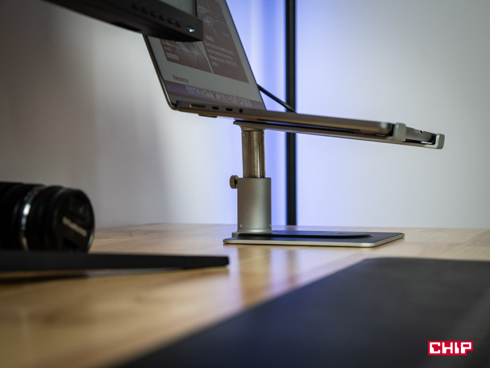 Na plus zaliczam coś, czego wcześniej się nie spodziewałem — aluminiowa konstrukcja stojaka i pionowe ustawienie MacBooka poprawiają cyrkulację powietrza wokół obudowy. Dzięki temu laptop mniej się nagrzewa w porównaniu do pracy na płaskiej powierzchni, co może przekładać się na cichszą pracą wentylatorów (szczególnie w modelach jeszcze na chipach Intela, bo te MacBooki lubiły często włączać wentylatory) i, co za tym idzie, większym komfortem użytkowania.