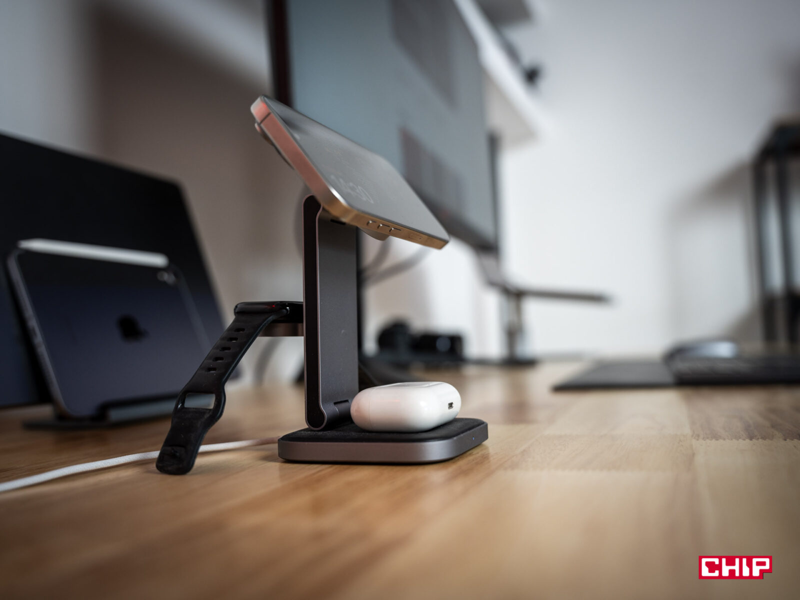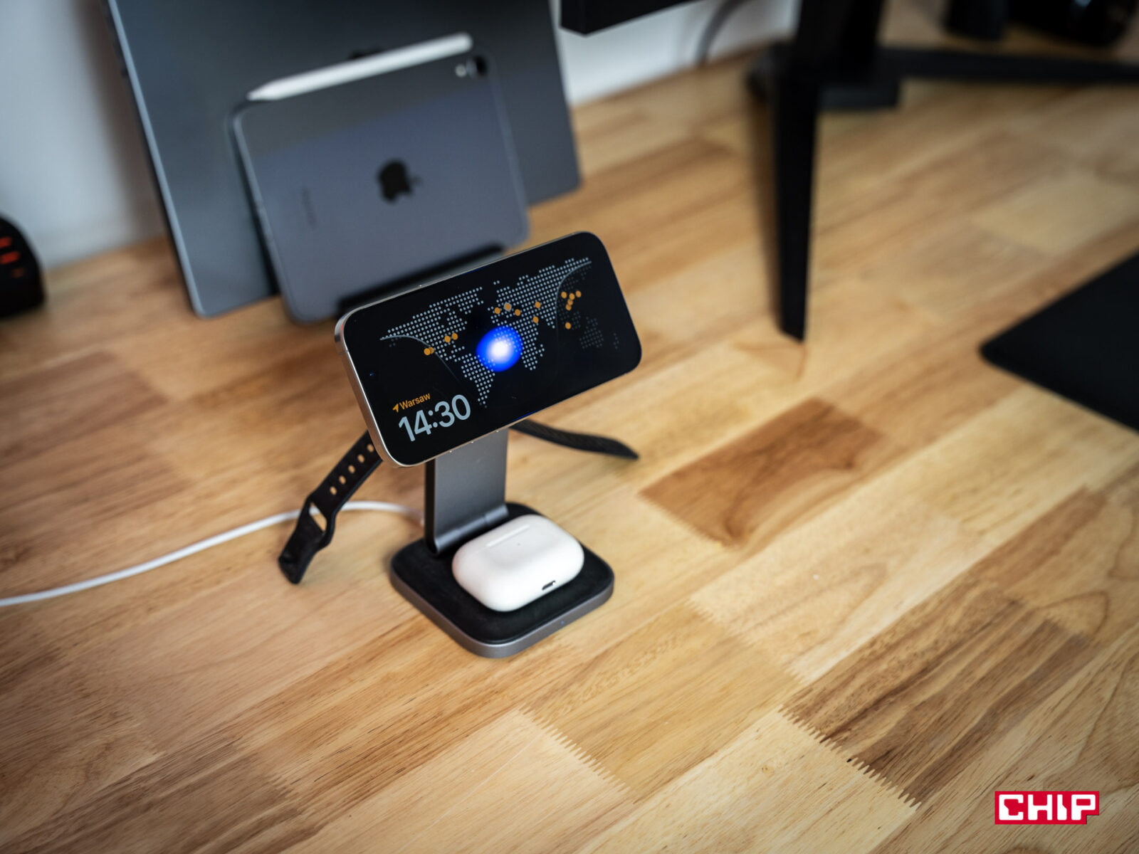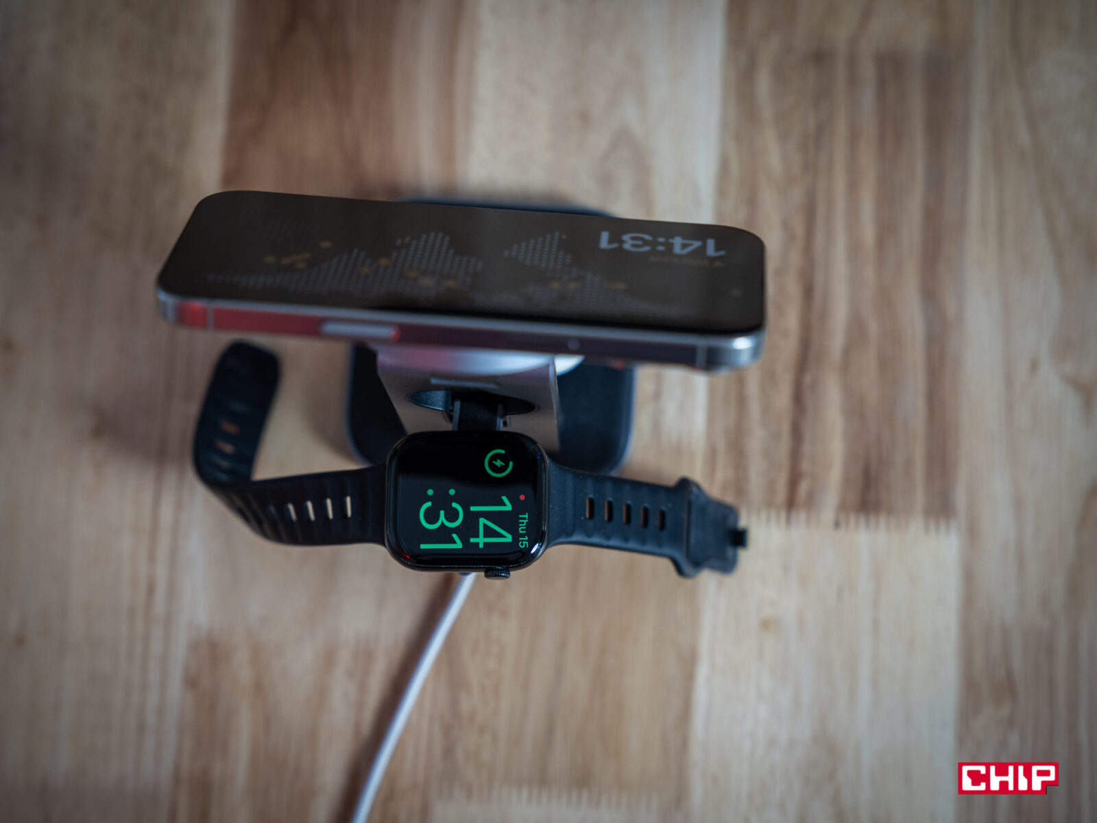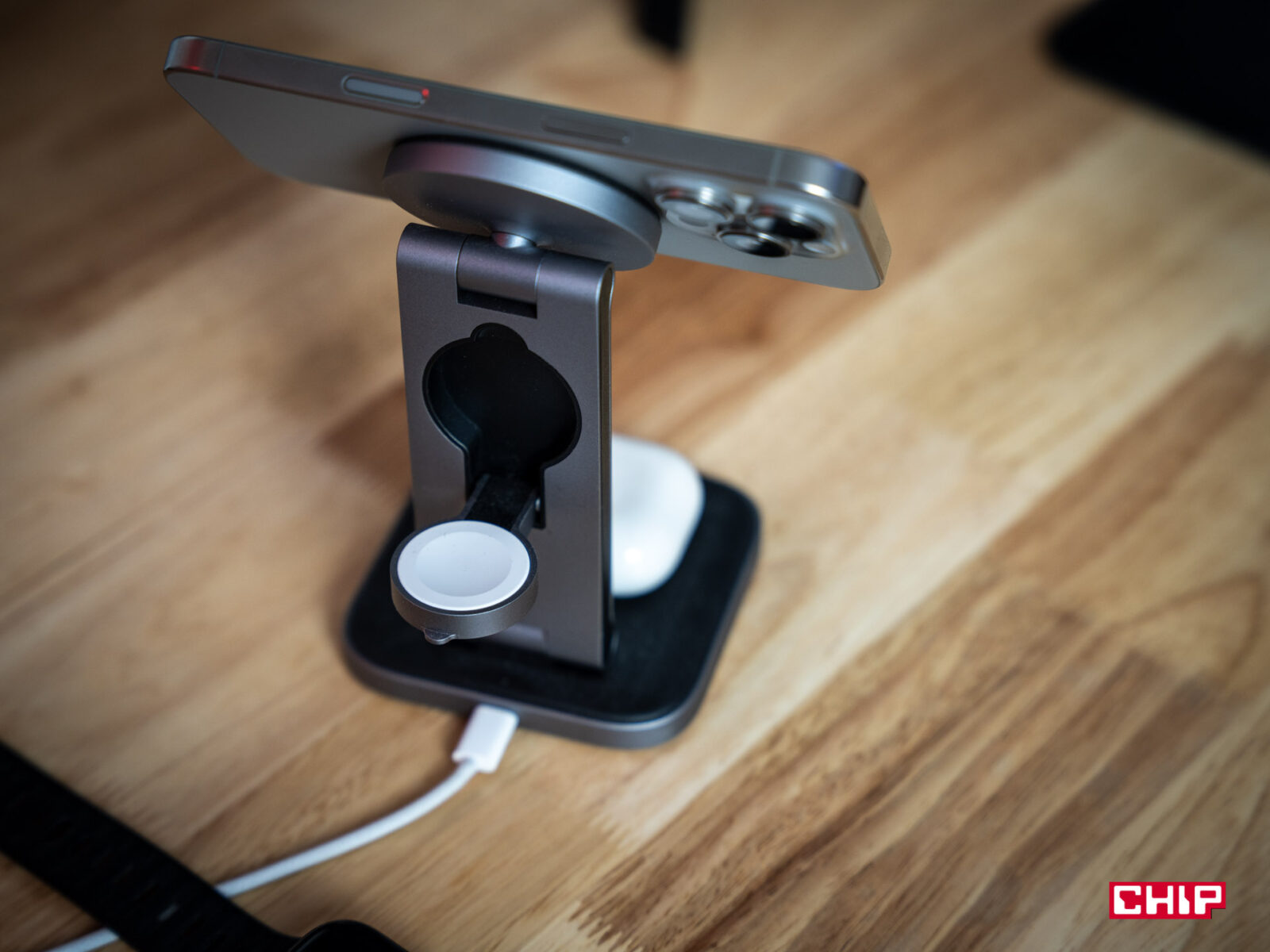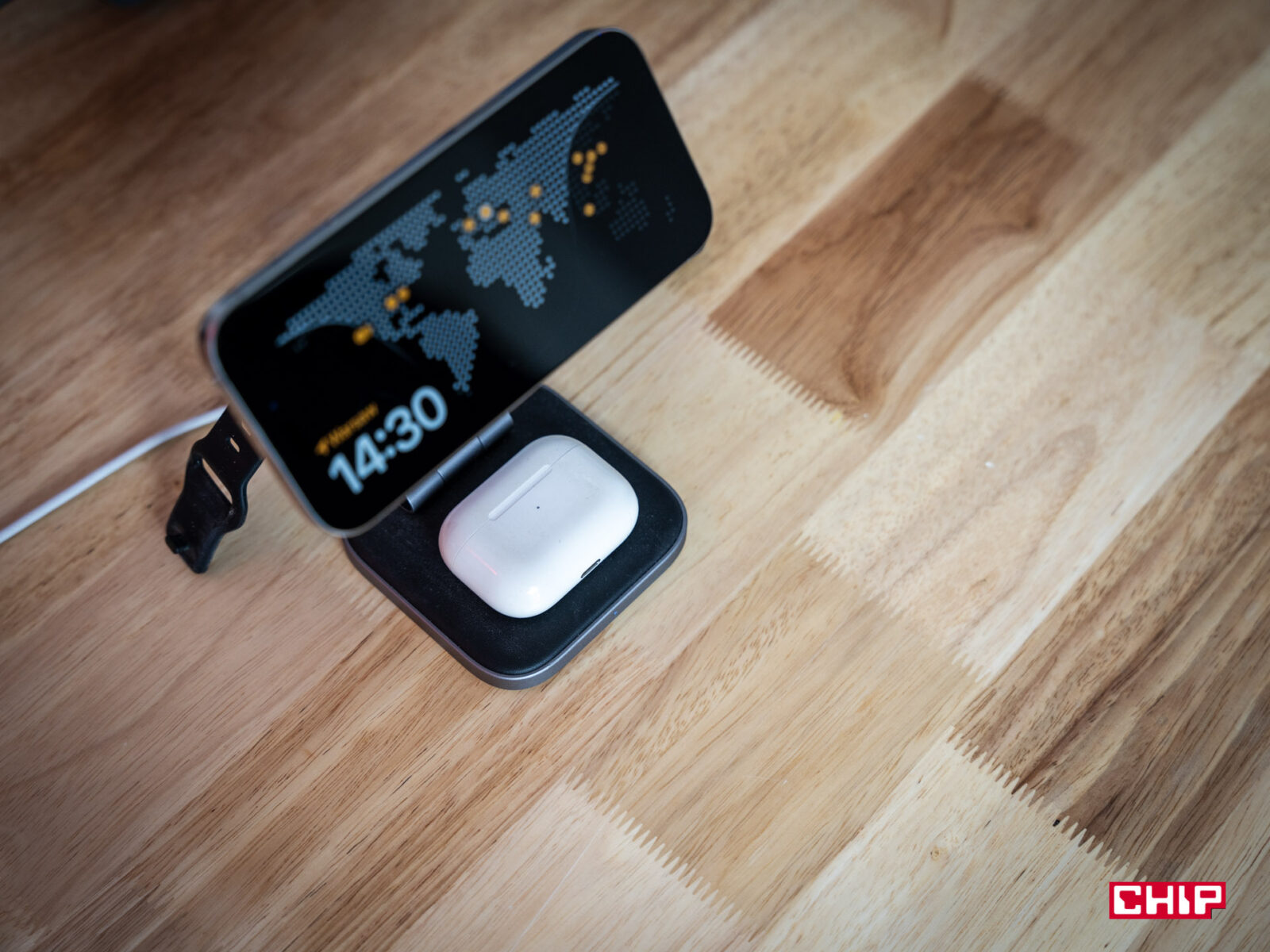 Magnetyczny uchwyt dla iPhone’a działa jak należy — telefon dosłownie „wskakuje” na swoje miejsce i od razu zaczyna się ładować. Można go ustawić zarówno w pionie, jak i w poziomie, co pozwala na bezproblemową współpracę z funkcją StandBy w iOS, pozwalając zamienić telefon w miniaturowy wyświetlacz biurkowy. Apple Watch również ładuje się bezproblemowo, a platforma dla AirPodsów działa bez zarzutu, choć ona jako jedyna nie jest magnetyczna; ale jest na tyle spora, że wątpliwe, żebyśmy źle ułożyli słuchawki.