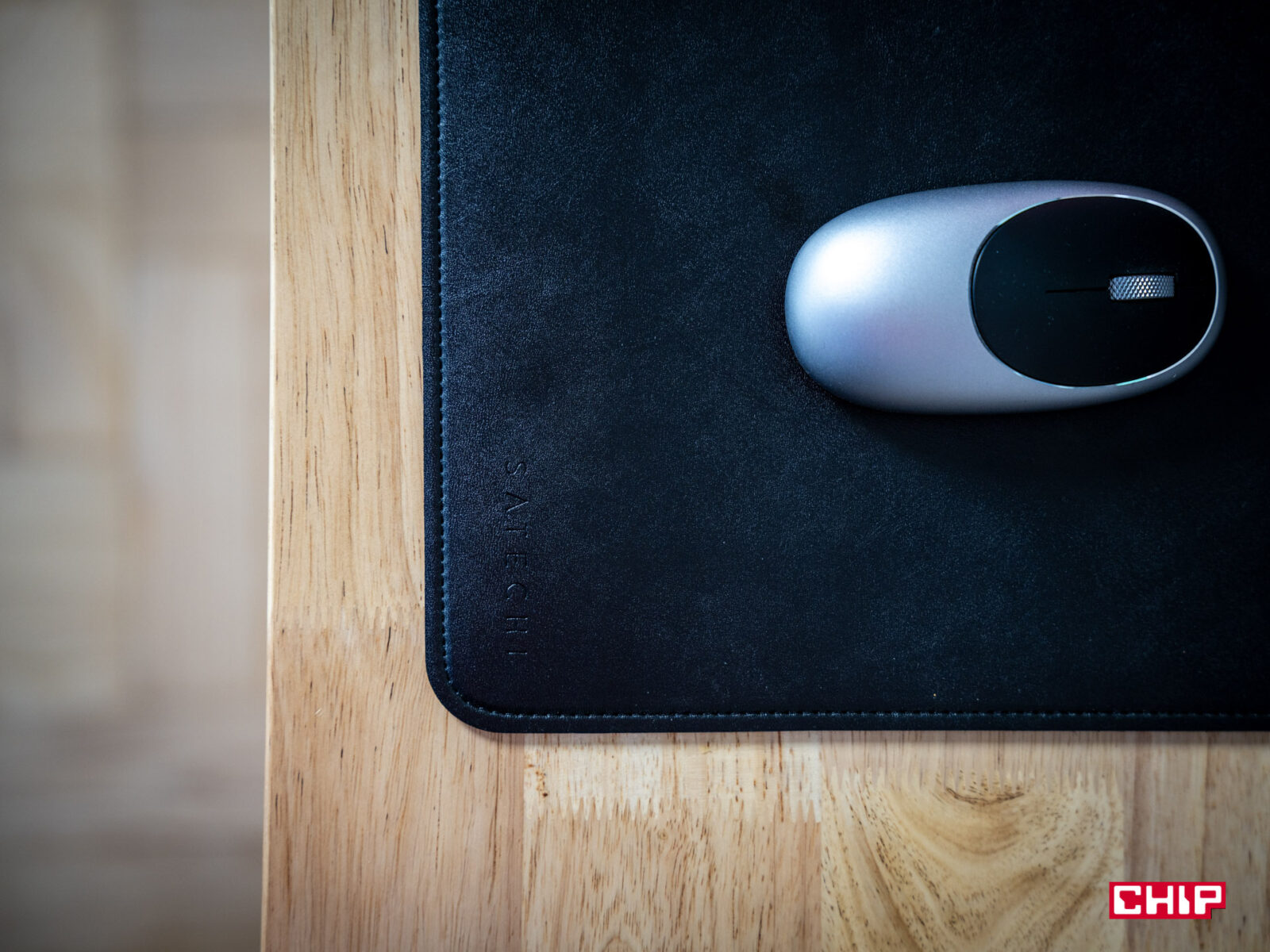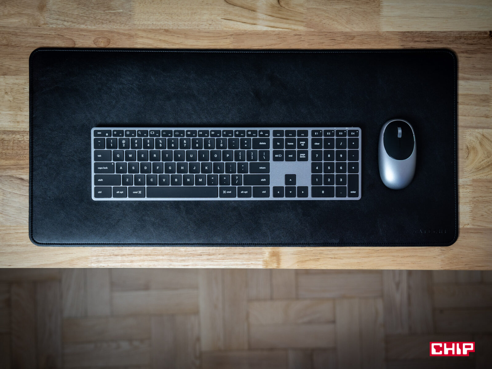 Na sam koniec został z pozoru drobiazg, ale w praktyce jeden z tych elementów, które zauważalnie wpływają na komfort pracy przy biurku. Razem z całą resztą akcesoriów przyjechała do mnie podkładka Satechi Premium Desk Mat w czarnej wersji kolorystycznej. Wykonana z poliuretanu przypominającego skórę, jest wodoodporna i łatwa do utrzymania w czystości. Rozlana kawa, okruchy czy ślady po kubku nie są problemem — wystarczy wilgotna ściereczka i wszystko wraca do porządku, a to jest istotne w kontekście utrzymania stanowiska w należytej czystości. Sama powierzchnia jest przyjemna w dotyku, nie za śliska, ale wystarczająco gładka, by myszka działała bez zarzutu.