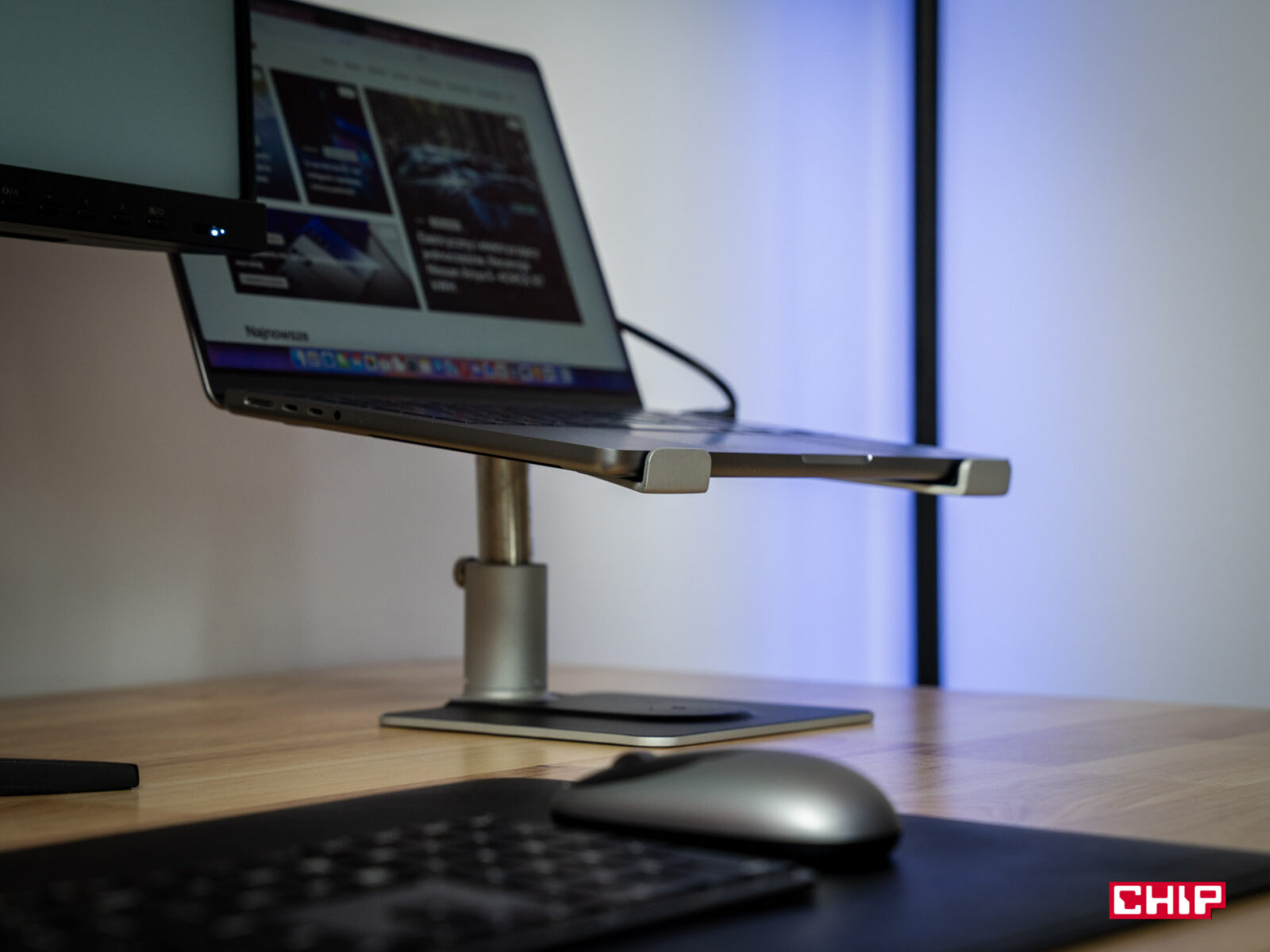 Zacząłem od podstaw. Dosłownie. Po długim czasie pracy przy biurku z ekranem laptopa ustawionym zdecydowanie zbyt nisko, kark dawał mi znać, że czas coś z tym zrobić. Garbienie się nad MacBookiem to może i klasyka gatunku, ale też szybka droga do fizjoterapeuty. Padło więc na podstawkę — konkretnie Twelve South HiRise Pro z MagSafe, bo wyglądała solidnie i miała wszystko, czego zdawałem się potrzebować. No i, nie oszukujmy się, dobrze komponuje się z estetyką Apple. Na pierwszy rzut oka wygląda trochę jak sprzęt od Starlinka albo jakaś kosmiczna konstrukcja, ale nie uznałbym tego za wadę. Wręcz przeciwnie.
