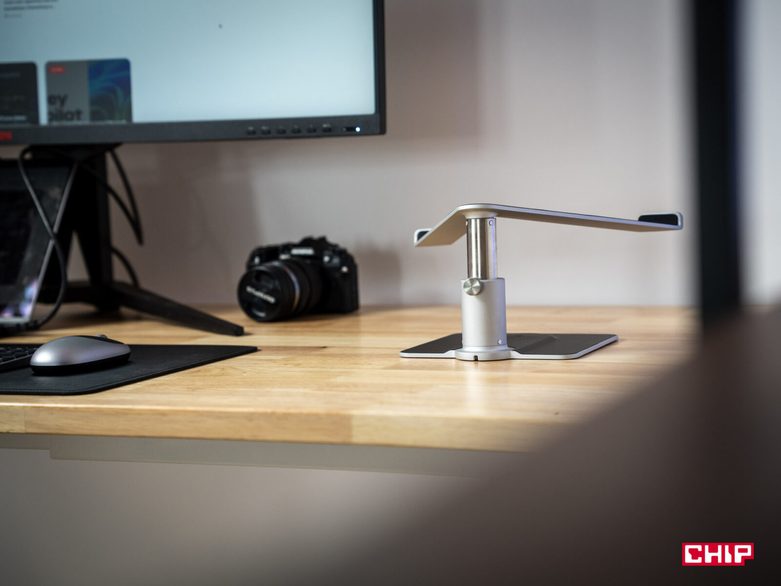 HiRise Pro unosi MacBooka nawet o 15 centymetrów i pozwala dostosować wysokość do naszych potrzeb. To szczególnie ważne, jeśli — tak jak ja — spędzacie godziny na pisaniu, montażu czy scrollowaniu źródeł. Od momentu, gdy ekran laptopa znalazł się na wysokości oczu, moje plecy i kark odpoczęły. Regulacja nie należy jednak do najlżejszych — trzeba użyć trochę siły, bo mechanizm stawia wyraźny opór i nie jest on najbardziej subtelny w historii. To nie tragedia, ale jeśli często zmieniamy ustawienia, może być irytujące. Na szczęście, raczej jest to podobny proces do ustawiania bocznych lusterek w samochodzie — ile razy sięgamy po tę opcję? Raz ustawimy i mamy spokój.
