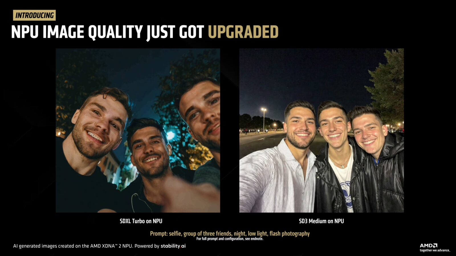 Grupa czerwonych chwali się, że pozwala to na lokalne generowanie wysokiej jakości obrazów AI na laptopach z pamięcią poniżej 32 GB, w formacie o wysokiej precyzji i bez nadmiernej kwantyzacji. Co więcej, dwuetapowy proces przetwarzania danych oparty na procesorze NPU AMD XDNA 2 podnosi rozdzielczość wyjściową obrazu z 2 MP (1024×1024) modelu SD 3 Medium do 4 MP (2048×2048), zapewniając obrazy o jakości druku, idealne do użytku mobilnego.