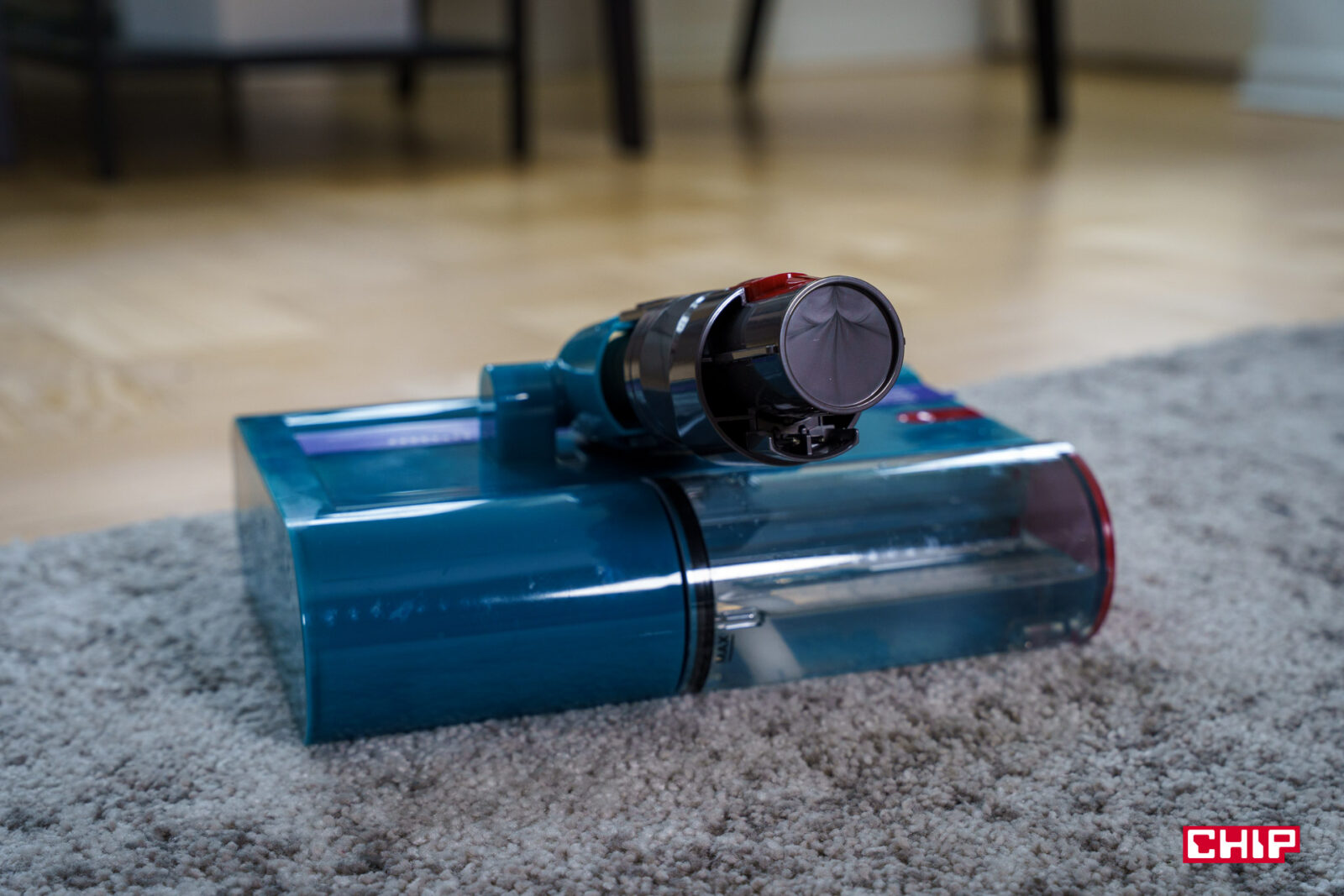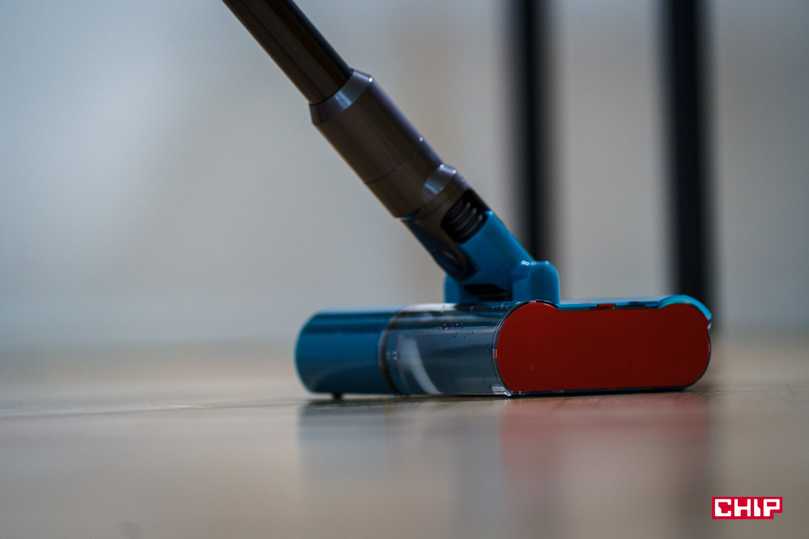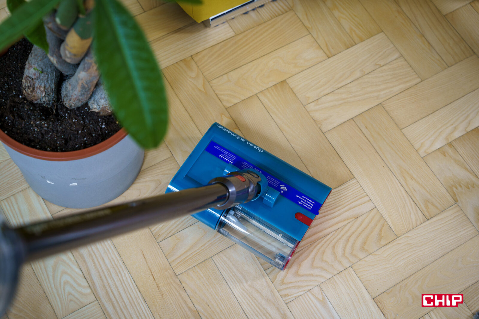 Największą nowością w V15s Detect Submarine jest — jak sama nazwa wskazuje — elektroszczotka Submarine, która umożliwia aktywne mycie podłóg twardych. Zbiornik na wodę o pojemności 300 ml pozwala na sprzątanie do 110 metrów kwadratowych, a osiem punktów rozprowadzania wody równomiernie nawilża wałek, zapewniając czyste podłogi bez smug. Technologia Extraction Plate, czyli płytka odsączająca nadmiar wody, to sprytne rozwiązanie, które zapobiega nadmiernemu zamoczeniu powierzchni, takich jak drewno, laminat czy płytki. W praktyce funkcja mokrego sprzątania sprawdza się znakomicie przy usuwaniu codziennych zabrudzeń — od błotnych śladów po butach w przedpokoju po rozlaną kawę w kuchni czy pastę do zębów w łazience. Ważne jednak, żeby te plamy umyć możliwie jak najszybciej, bo z bardziej zaschniętymi brudami mopująca końcówka może mieć już lekkie problemy. Odkurzacz jednak jest zwrotny, a elektroszczotka Submarine dobrze omija przeszkody i również sama jedzie do przodu, co ułatwia sprzątanie.