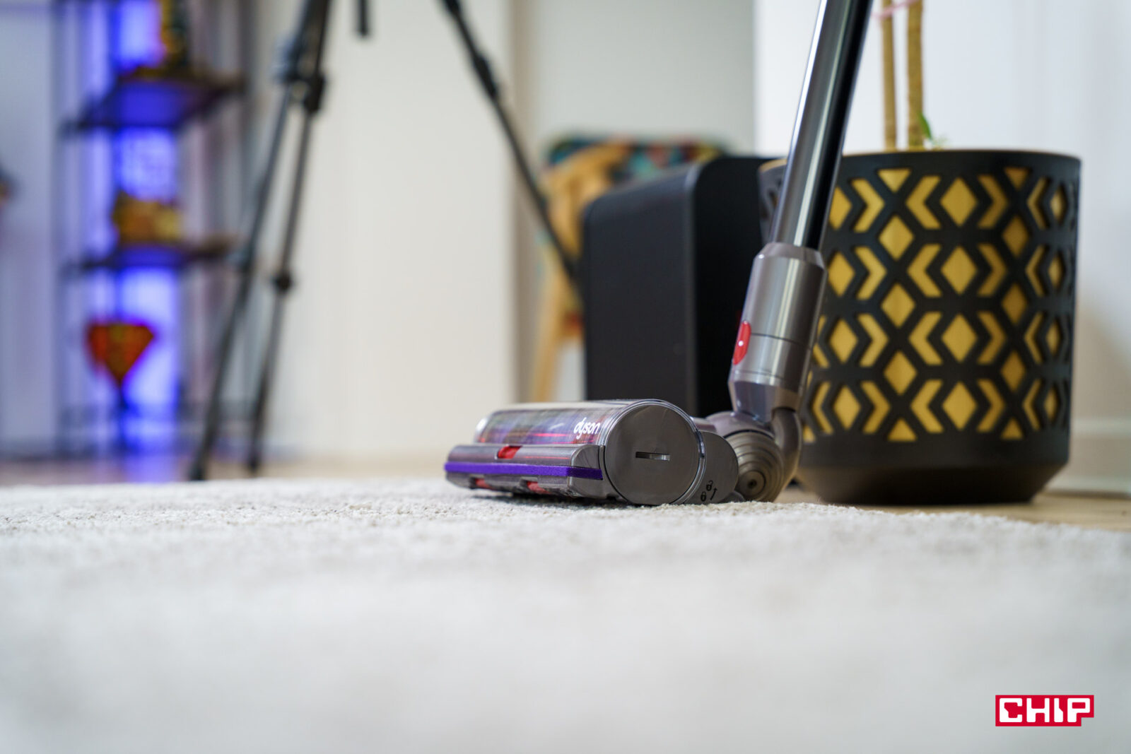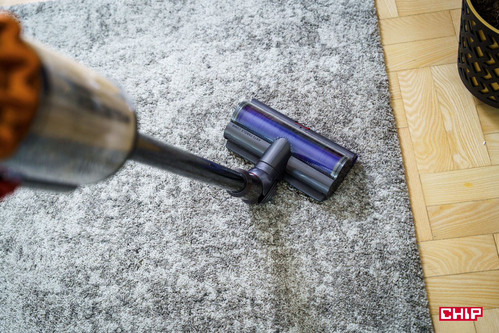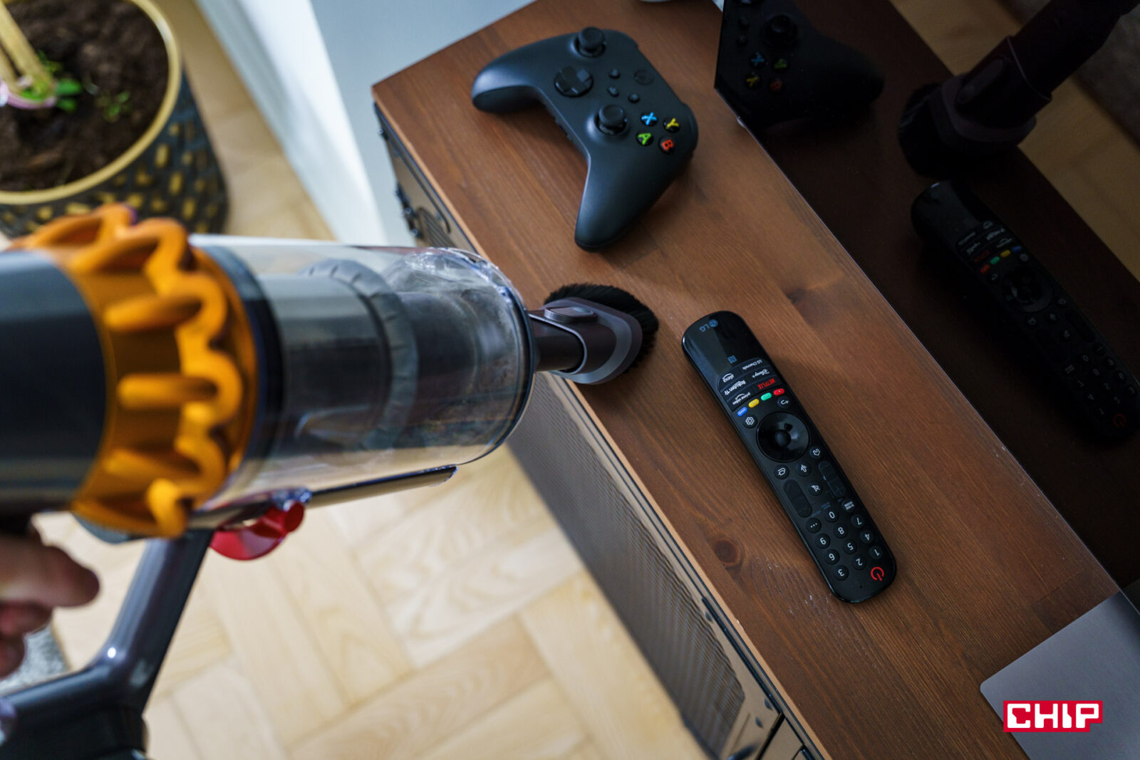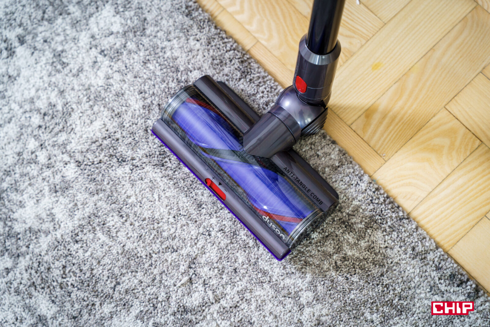 Największy problem mam jednak z elektroszczotką Digital Motorbar z technologią DLS (Dynamic Load Sensor), która w teorii automatycznie dostosowuje moc do rodzaju nawierzchni, lecz w praktyce… wypada to różnie. Ku mojemu zaskoczeniu, akcesorium poddawało się na dwóch dywanach w naszym biurze — a nie uznałbym ich włosia za wysokie, a raczej za niskie, maksymalnie średnie. Niezależnie, czy na odkurzaczu wybierałem tryb Auto czy Boost, ta końcówka finalnie i tak łapała zadyszkę. Radziła sobie bezproblemowo wyłącznie na wycieraczkach do butów, które praktycznie włosia nie mają. Dywany dało się odkurzyć, ale z użyciem sporej siły — więc tutaj największy minus, jaki zauważyłem podczas sprzątania z V15s Detect Submarine.