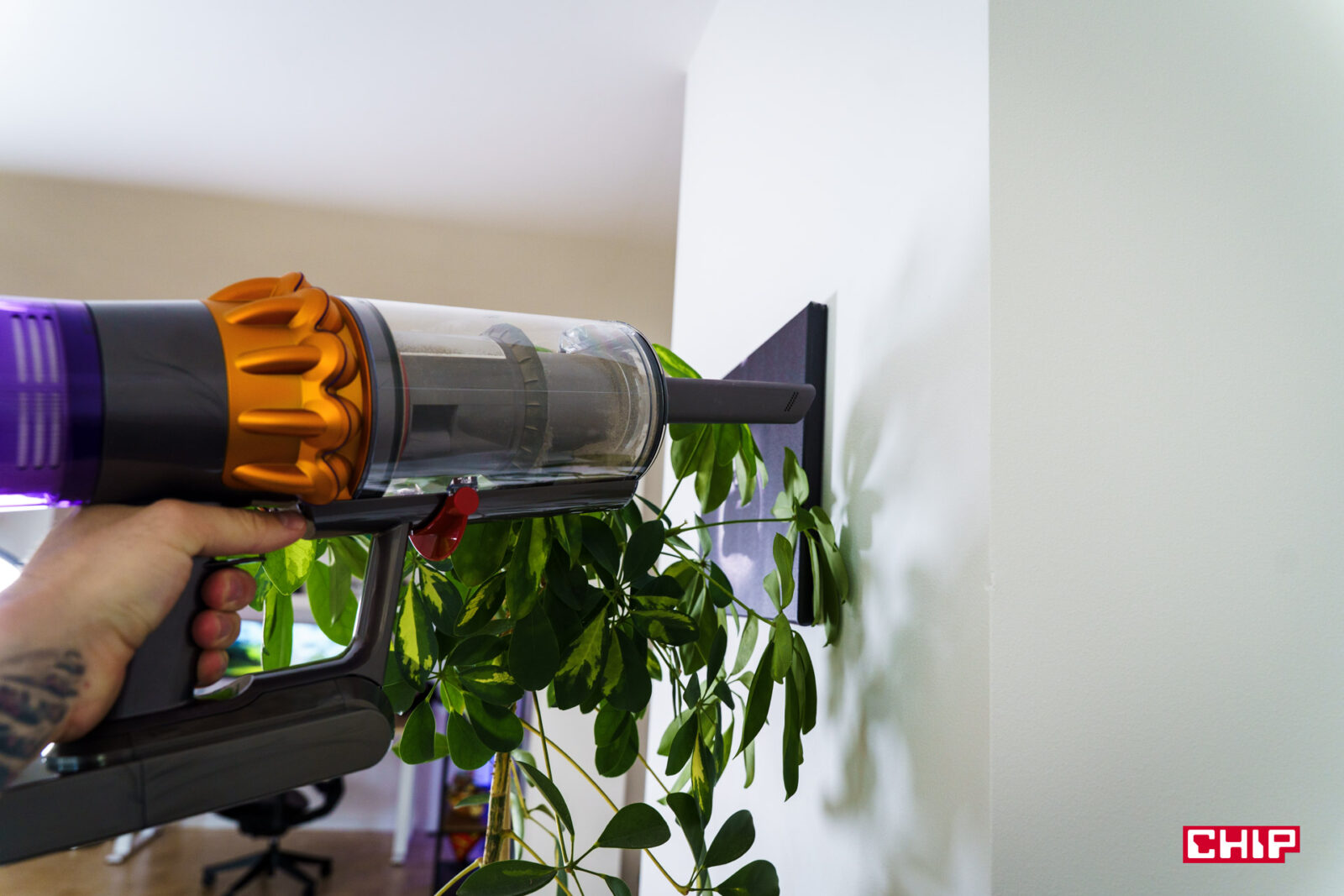 W zestawie mamy jeszcze ścienną stację dokującą, która choć może być dość praktyczna, to wymaga wiercenia w ścianie; co może być problematyczne, szczególnie w wynajmowanych mieszkaniach. „Stacja dokująca” ładuje również odkurzacz, ale wymaga odpowiedniego zawinięcia kabla i włożenia go w mały tunel, aby złącze akumulatora idealnie łączyło się z kablem przy odkładaniu w plastikową stację. Przyznajmy szczerze — nie jest to najlepsze z możliwych rozwiązań i bez dwóch zdań nie jest to coś, czego moglibyśmy oczekiwać po najwyższej półce na rynku odkurzaczy. Jest to również rozczarowujące pod tym względem, że propozycje konkurencji (na przykład Dreame czy Jimmy) w podobnych lub nawet niższych pieniądzach oferują pełne stacje dokujące, które przy okazji zajmują się suszeniem końcówek mopujących — a nie musimy ich ręcznie rozkładać, myć i suszyć, jak tutaj. Z całą pewnością da się w tej cenie dostać pełną stację z miejscami na wszystkie końcówki, w której wystarczy wygodnie odłożyć odkurzacz, by ten się ładował — bez żadnego wiercenia. Dyson niestety nie zdecydował się na takie rozwiązanie, bo i na przechowywanie wspomnianych końcówek musimy znaleźć miejsce sami — i naprawdę szkoda.