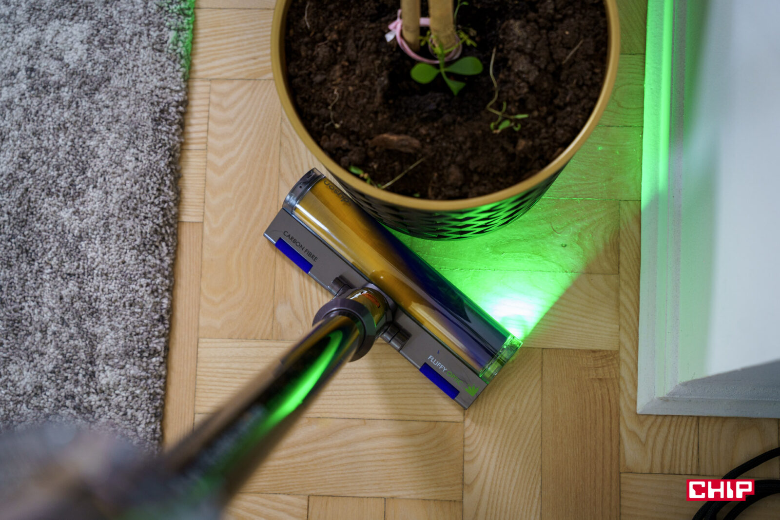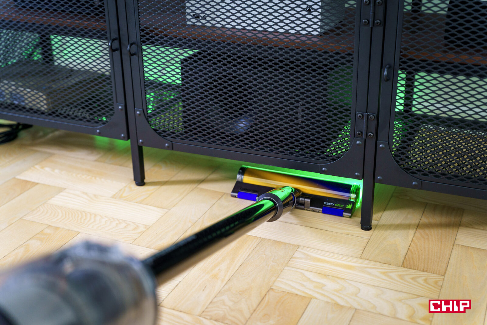 W praktyce odkurzacz radzi sobie znakomicie, lecz nie na wszystkich powierzchniach. Podświetlana końcówka Fluffy Optic bardzo przypadła mi do gustu i zielone światło idealnie wyciąga do pola widzenia nawet najmniejsze cząsteczki. Dyson twierdzi, że wiązka światła, która podświetla drobinki kurzu na podłogach twardych, ujawnia dwa razy więcej niewidocznych zanieczyszczeń niż poprzednia wersja (Laser Slim Fluffy). Muszę jednak przyznać, że to rozwiązanie faktycznie robi wrażenie i dla perfekcjonistów to prawdziwa gratka.