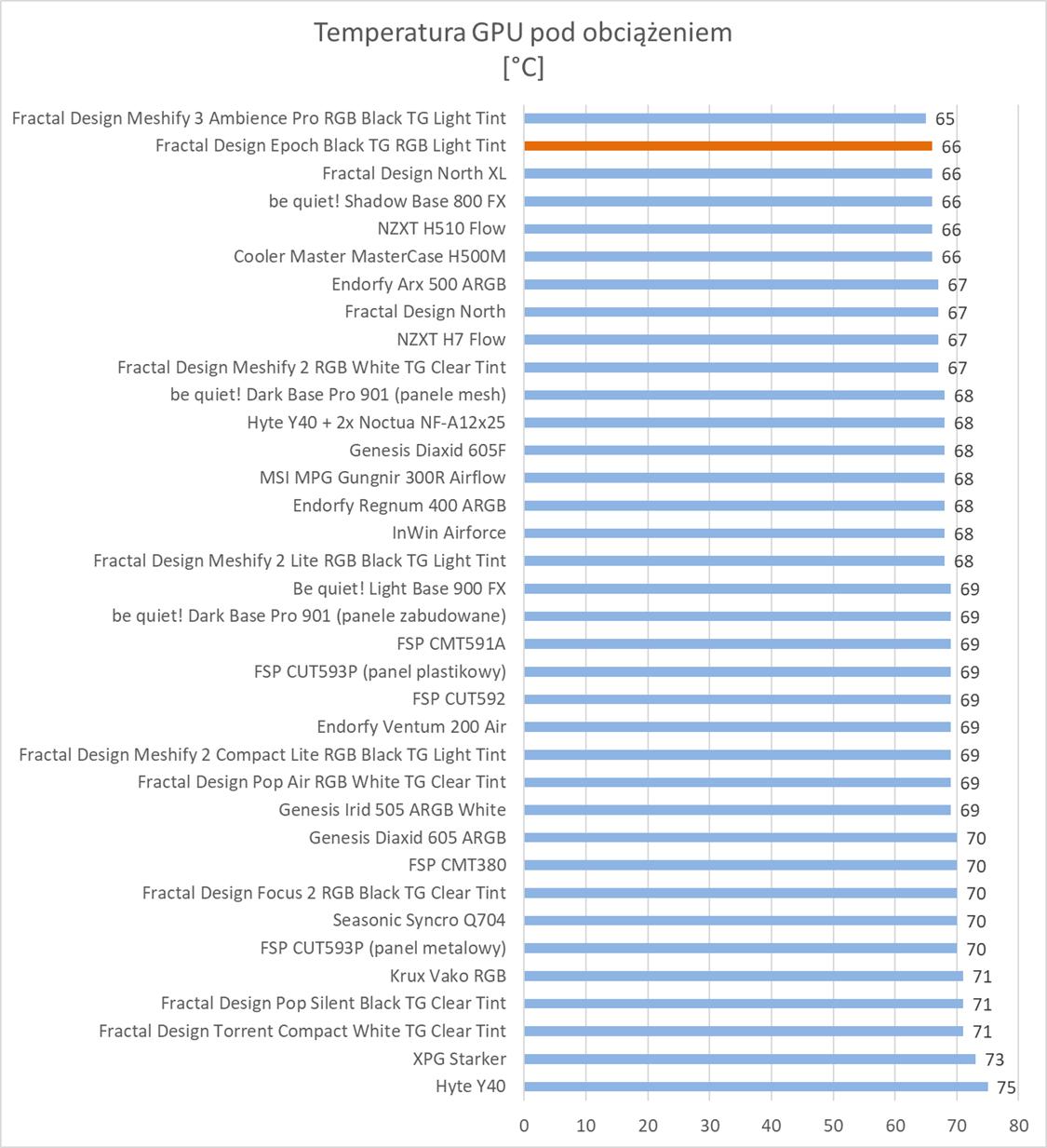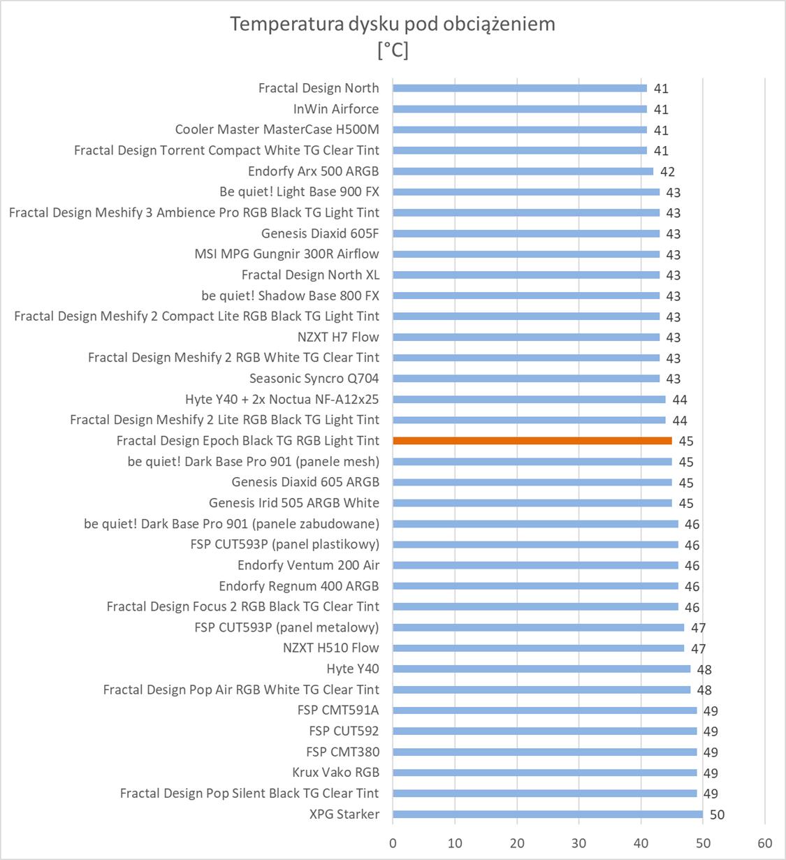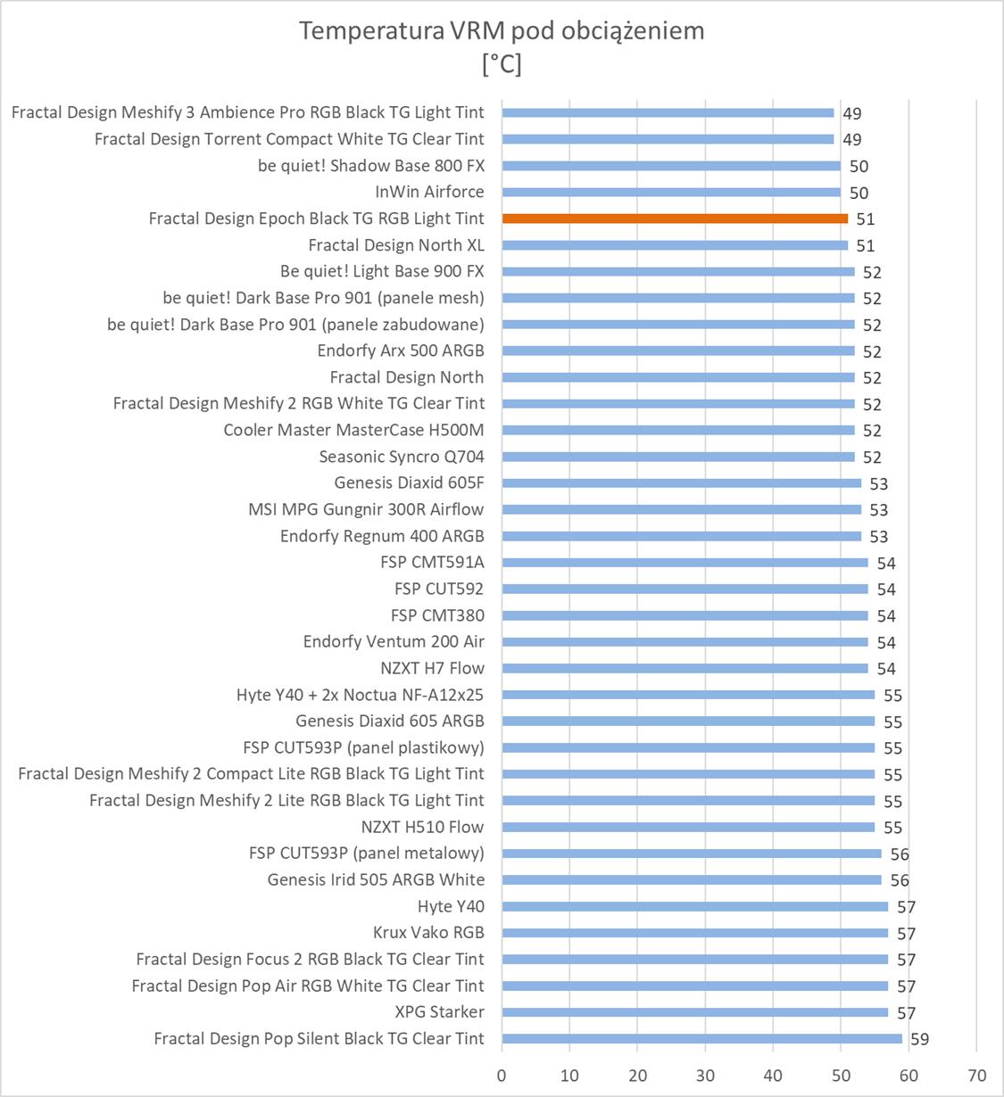 Temperatury podzespołów są naprawdę dobre. Obudowa wypada słabiej niż Meshify 3, ale wyniki bez wątpienia wskazują na odpowiednie chłodzenie podzespołów. Warto tutaj wyróżnić temperatury karty graficznej, które są jednymi z najniższych na wykresach. Pod względem głośności jest podobnie do wspomnianego modelu. Nie jest cicho, ale też jest znacznie lepiej niż w innych konstrukcjach. Głośność jest na pewno bardzo dobra biorąc pod uwagę, że wentylatory pracują z prędkością 2200 RPM.