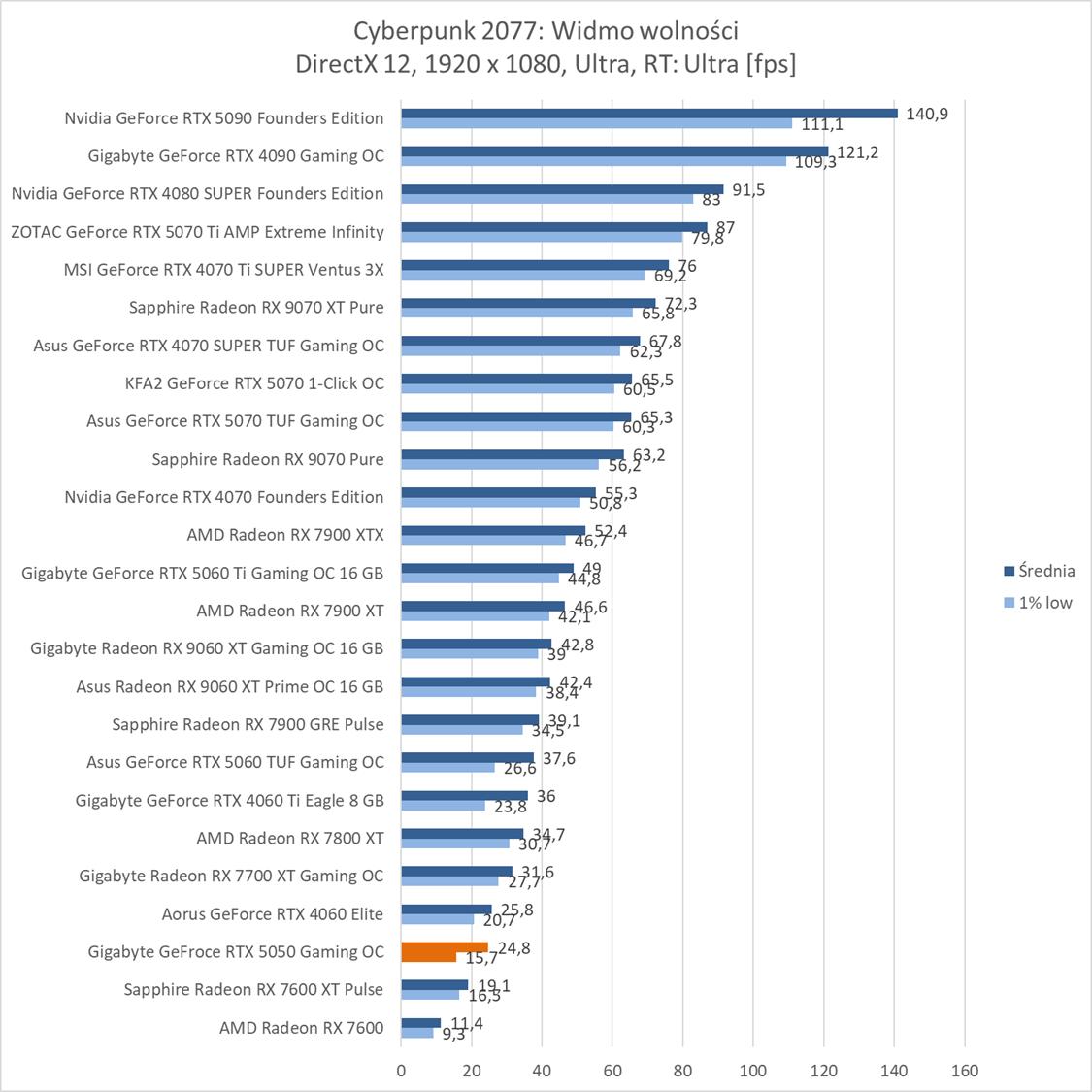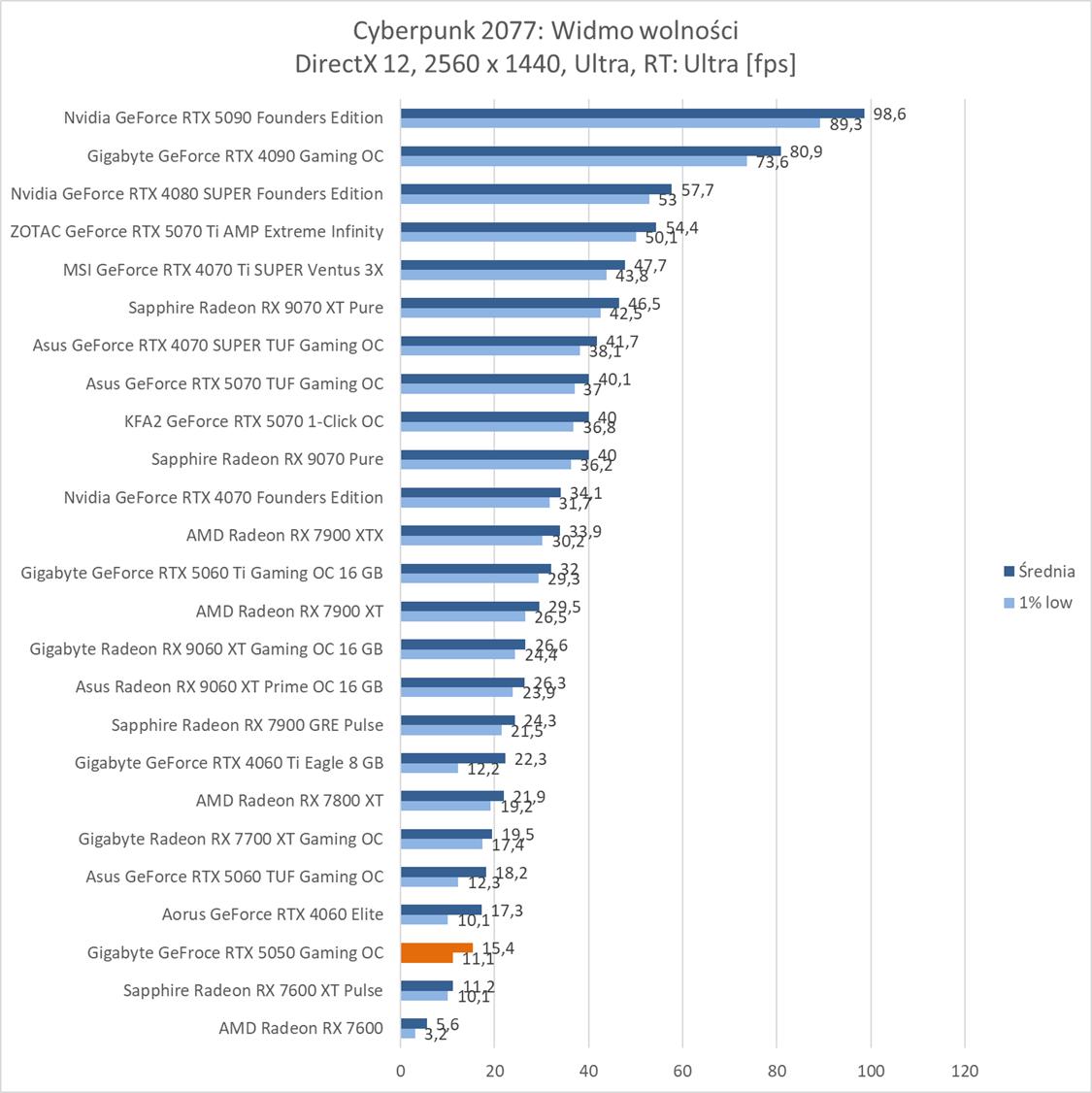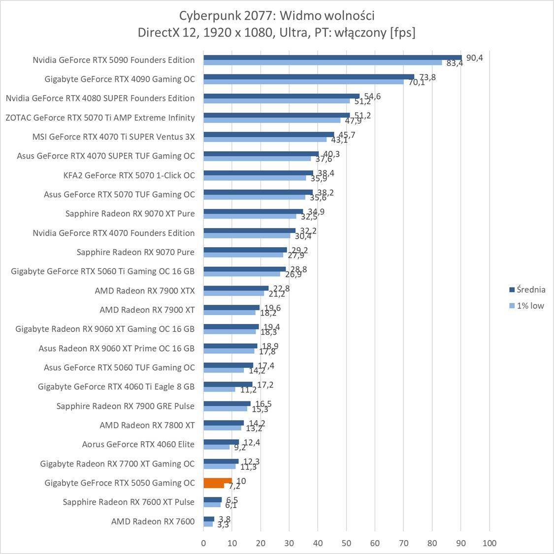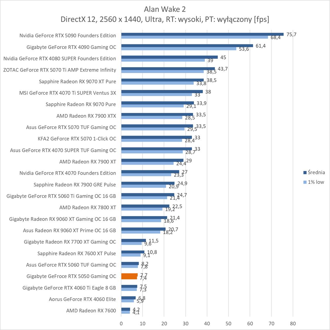 Natomiast sam RTX 5050 oferuje naprawdę niską wydajność. W samej rasteryzacji w Full HD mamy już 8 gier bez średnio 60 fps, w wyższych rozdzielczościach jest tylko gorzej. Przy ray tracingu nie ma co myśleć o płynnej rozgrywce – tutaj ratuje sytuację tylko DLSS 4. Przy path tracingu nawet generator klatek x4 nie zapewni płynnej rozgrywki – średnia jest na dobrym poziomie, ale 1% low jest niski, co nie pozwala na cieszenie się z gry. Wyniki są też znacznie niższe niż w przypadku RTX 5060, a najtańsze modele kupicie już za ok. 1250 zł, więc nawet w przypadku najtańszych modeli RTX 5050 ich zakup mija się z celem. Oczywiście tutaj zaznaczymy, że zdecydowanie lepiej jest i tak dozbierać do RX 9060 XT 16 GB.