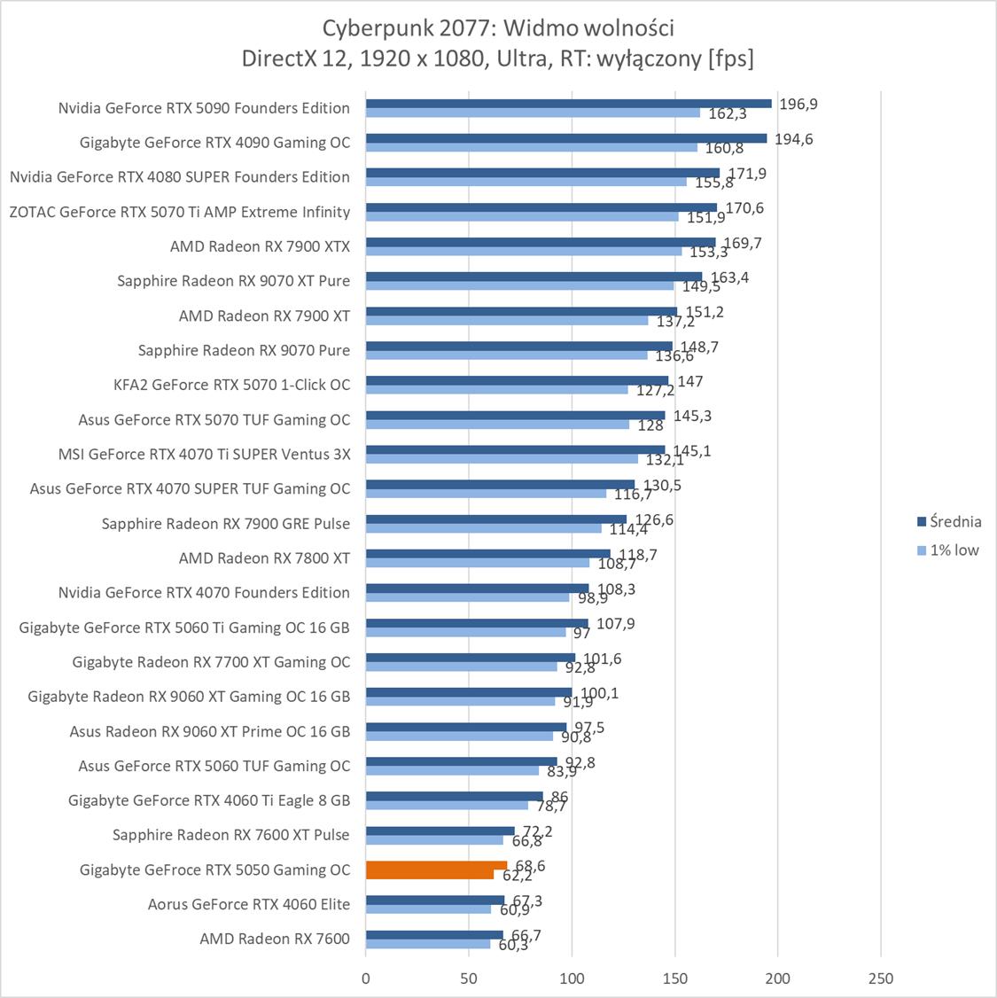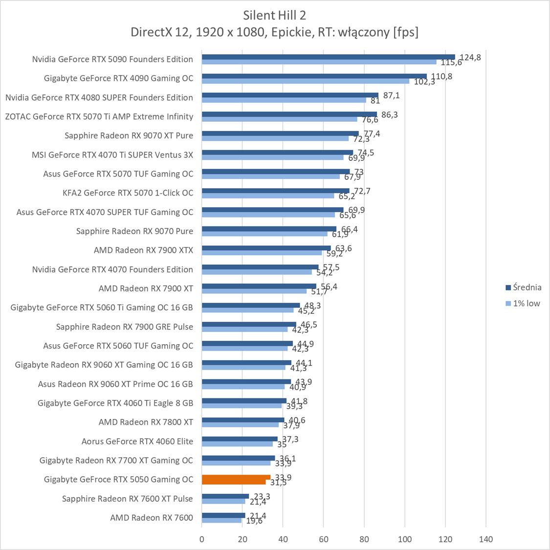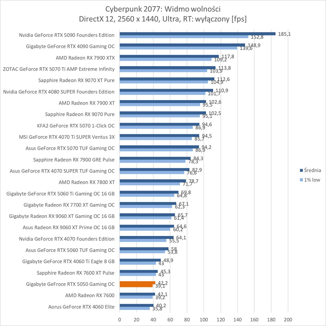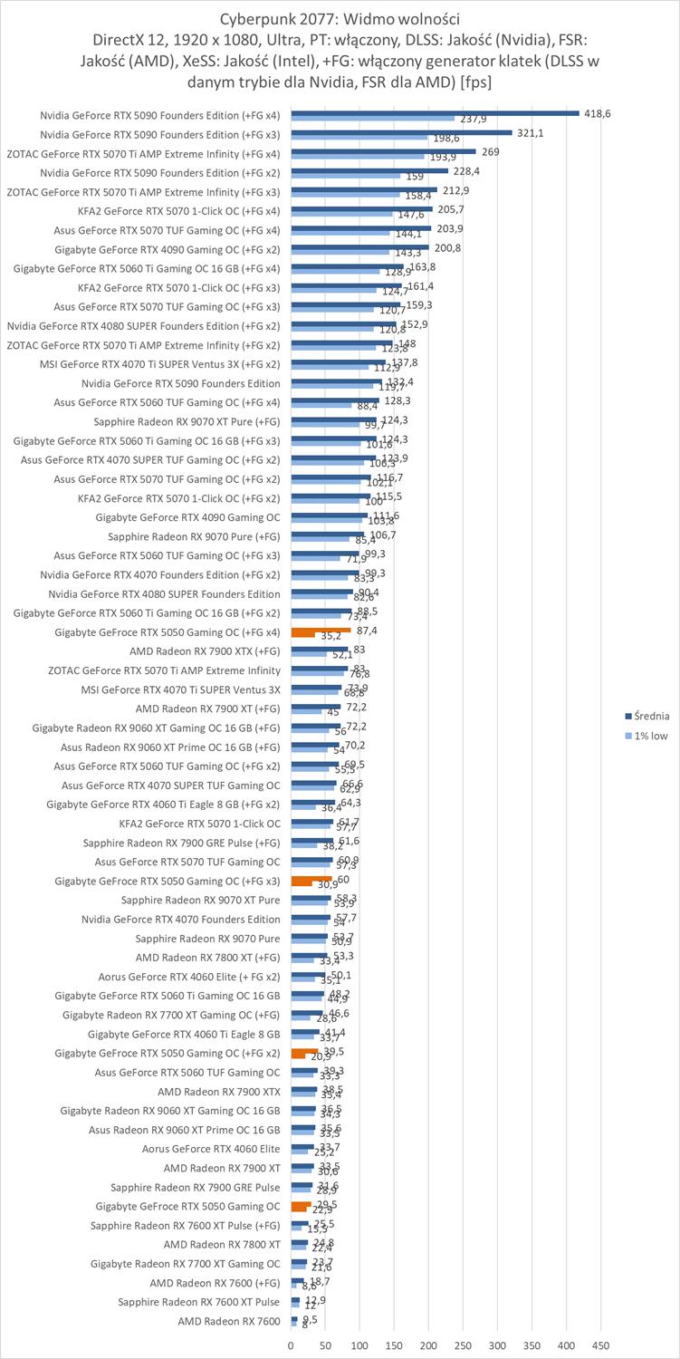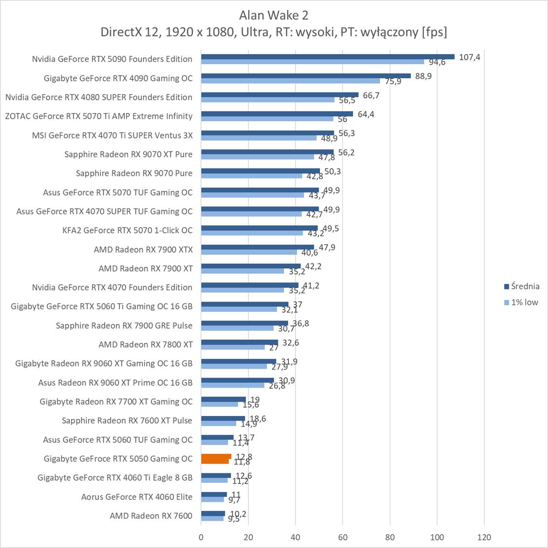 Natomiast sam RTX 5050 oferuje naprawdę niską wydajność. W samej rasteryzacji w Full HD mamy już 8 gier bez średnio 60 fps, w wyższych rozdzielczościach jest tylko gorzej. Przy ray tracingu nie ma co myśleć o płynnej rozgrywce – tutaj ratuje sytuację tylko DLSS 4. Przy path tracingu nawet generator klatek x4 nie zapewni płynnej rozgrywki – średnia jest na dobrym poziomie, ale 1% low jest niski, co nie pozwala na cieszenie się z gry. Wyniki są też znacznie niższe niż w przypadku RTX 5060, a najtańsze modele kupicie już za ok. 1250 zł, więc nawet w przypadku najtańszych modeli RTX 5050 ich zakup mija się z celem. Oczywiście tutaj zaznaczymy, że zdecydowanie lepiej jest i tak dozbierać do RX 9060 XT 16 GB.