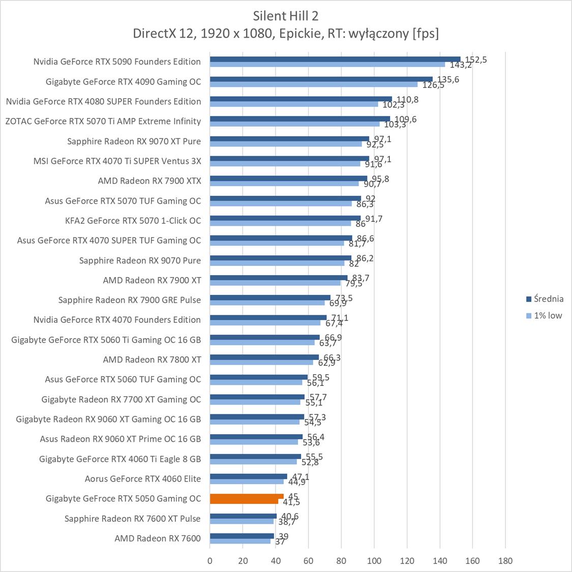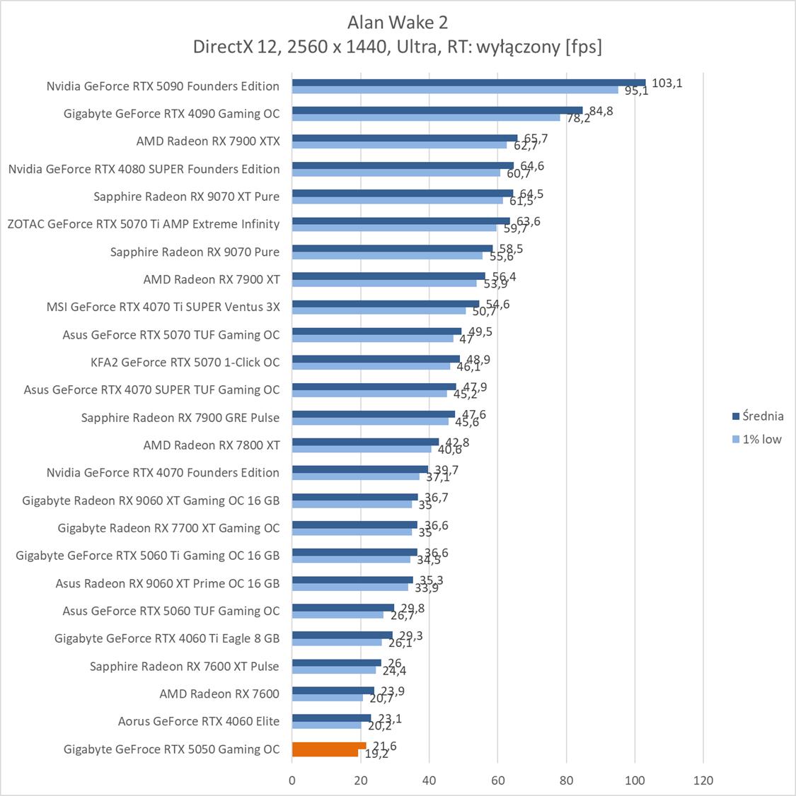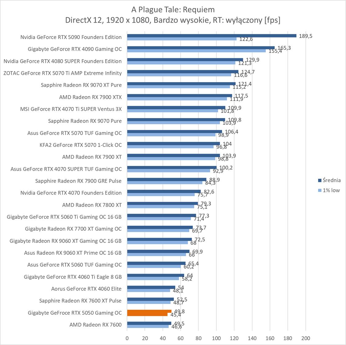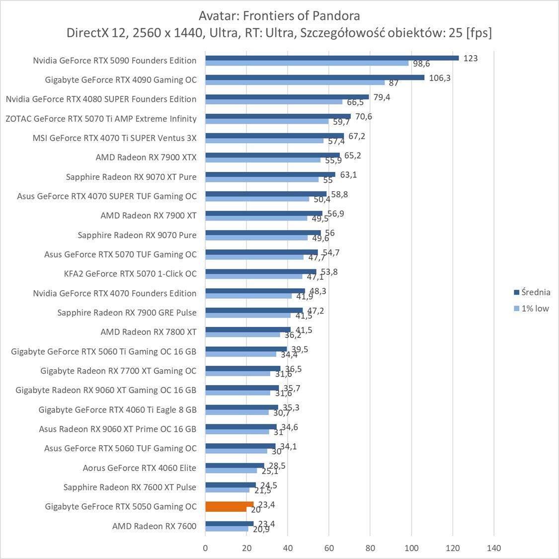 Natomiast sam RTX 5050 oferuje naprawdę niską wydajność. W samej rasteryzacji w Full HD mamy już 8 gier bez średnio 60 fps, w wyższych rozdzielczościach jest tylko gorzej. Przy ray tracingu nie ma co myśleć o płynnej rozgrywce – tutaj ratuje sytuację tylko DLSS 4. Przy path tracingu nawet generator klatek x4 nie zapewni płynnej rozgrywki – średnia jest na dobrym poziomie, ale 1% low jest niski, co nie pozwala na cieszenie się z gry. Wyniki są też znacznie niższe niż w przypadku RTX 5060, a najtańsze modele kupicie już za ok. 1250 zł, więc nawet w przypadku najtańszych modeli RTX 5050 ich zakup mija się z celem. Oczywiście tutaj zaznaczymy, że zdecydowanie lepiej jest i tak dozbierać do RX 9060 XT 16 GB.