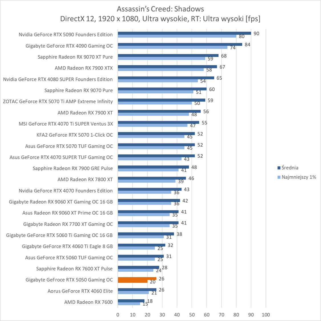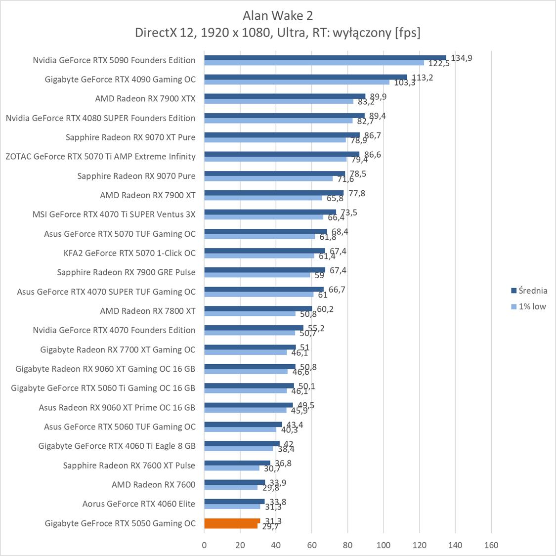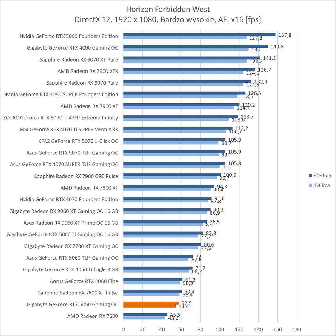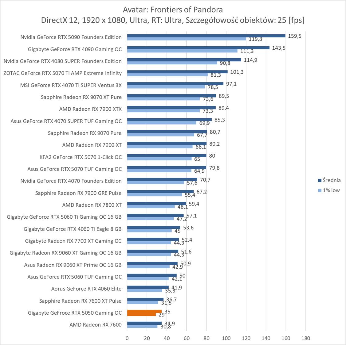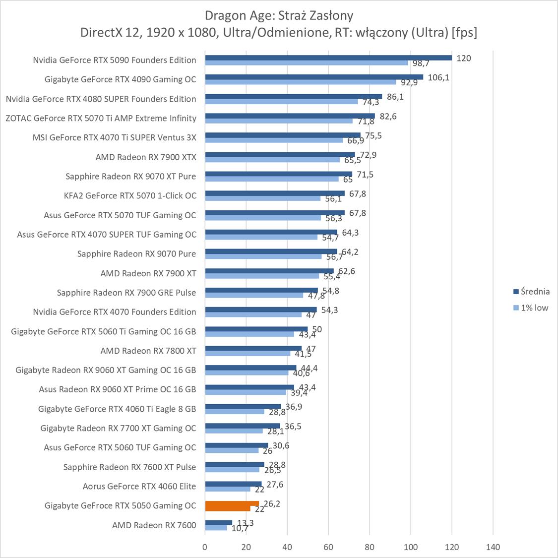 Natomiast sam RTX 5050 oferuje naprawdę niską wydajność. W samej rasteryzacji w Full HD mamy już 8 gier bez średnio 60 fps, w wyższych rozdzielczościach jest tylko gorzej. Przy ray tracingu nie ma co myśleć o płynnej rozgrywce – tutaj ratuje sytuację tylko DLSS 4. Przy path tracingu nawet generator klatek x4 nie zapewni płynnej rozgrywki – średnia jest na dobrym poziomie, ale 1% low jest niski, co nie pozwala na cieszenie się z gry. Wyniki są też znacznie niższe niż w przypadku RTX 5060, a najtańsze modele kupicie już za ok. 1250 zł, więc nawet w przypadku najtańszych modeli RTX 5050 ich zakup mija się z celem. Oczywiście tutaj zaznaczymy, że zdecydowanie lepiej jest i tak dozbierać do RX 9060 XT 16 GB.