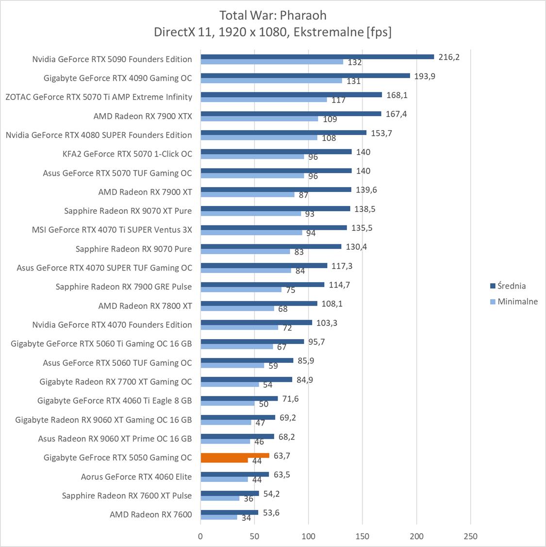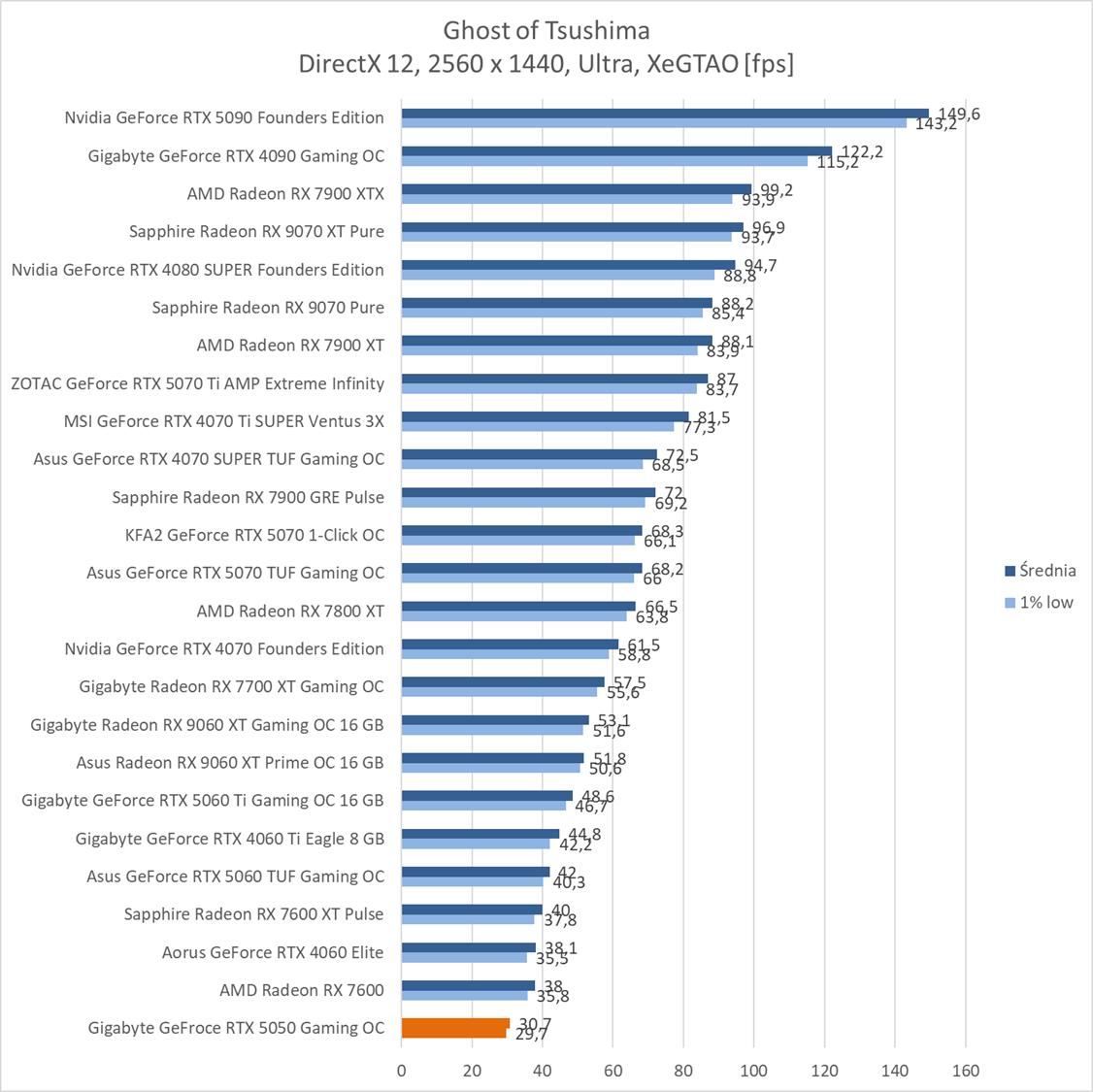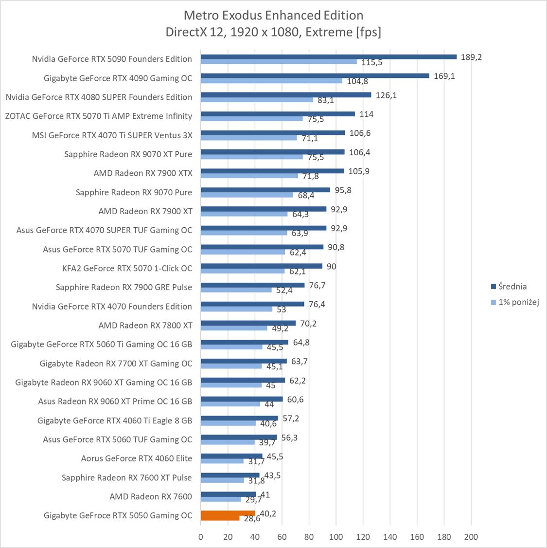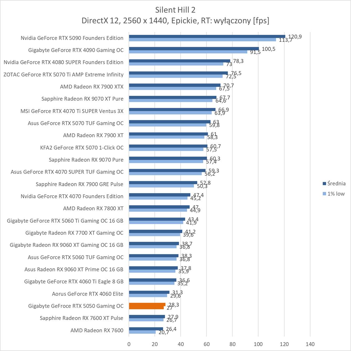 Natomiast sam RTX 5050 oferuje naprawdę niską wydajność. W samej rasteryzacji w Full HD mamy już 8 gier bez średnio 60 fps, w wyższych rozdzielczościach jest tylko gorzej. Przy ray tracingu nie ma co myśleć o płynnej rozgrywce – tutaj ratuje sytuację tylko DLSS 4. Przy path tracingu nawet generator klatek x4 nie zapewni płynnej rozgrywki – średnia jest na dobrym poziomie, ale 1% low jest niski, co nie pozwala na cieszenie się z gry. Wyniki są też znacznie niższe niż w przypadku RTX 5060, a najtańsze modele kupicie już za ok. 1250 zł, więc nawet w przypadku najtańszych modeli RTX 5050 ich zakup mija się z celem. Oczywiście tutaj zaznaczymy, że zdecydowanie lepiej jest i tak dozbierać do RX 9060 XT 16 GB.