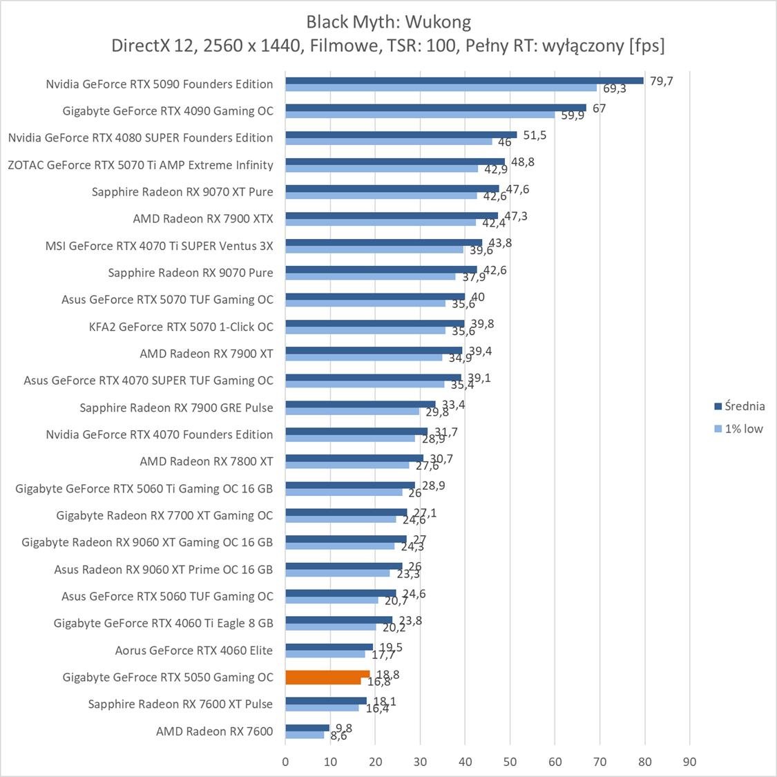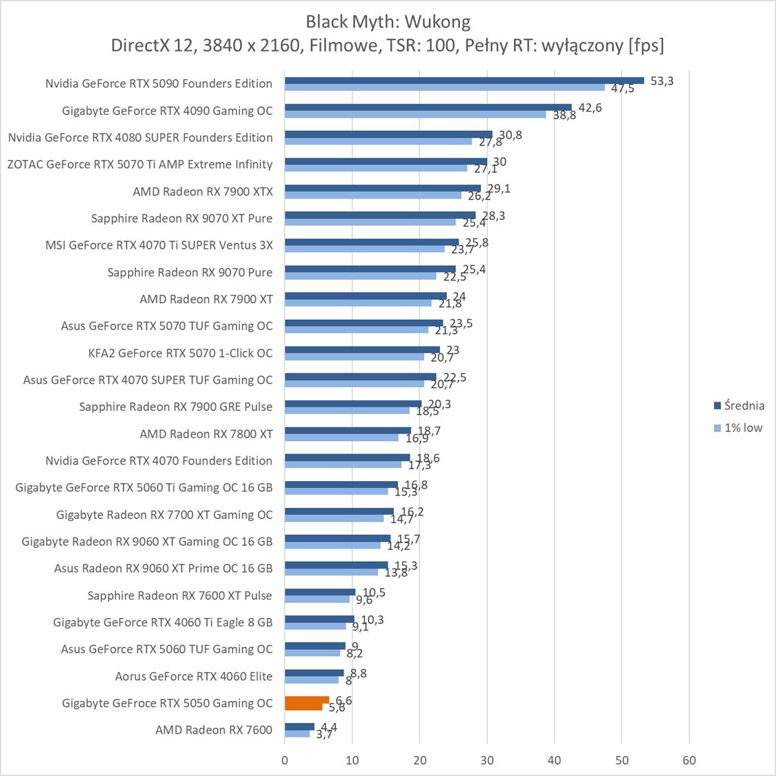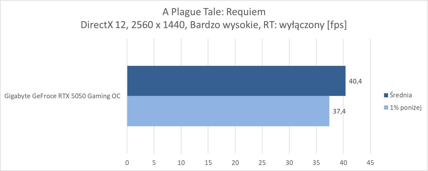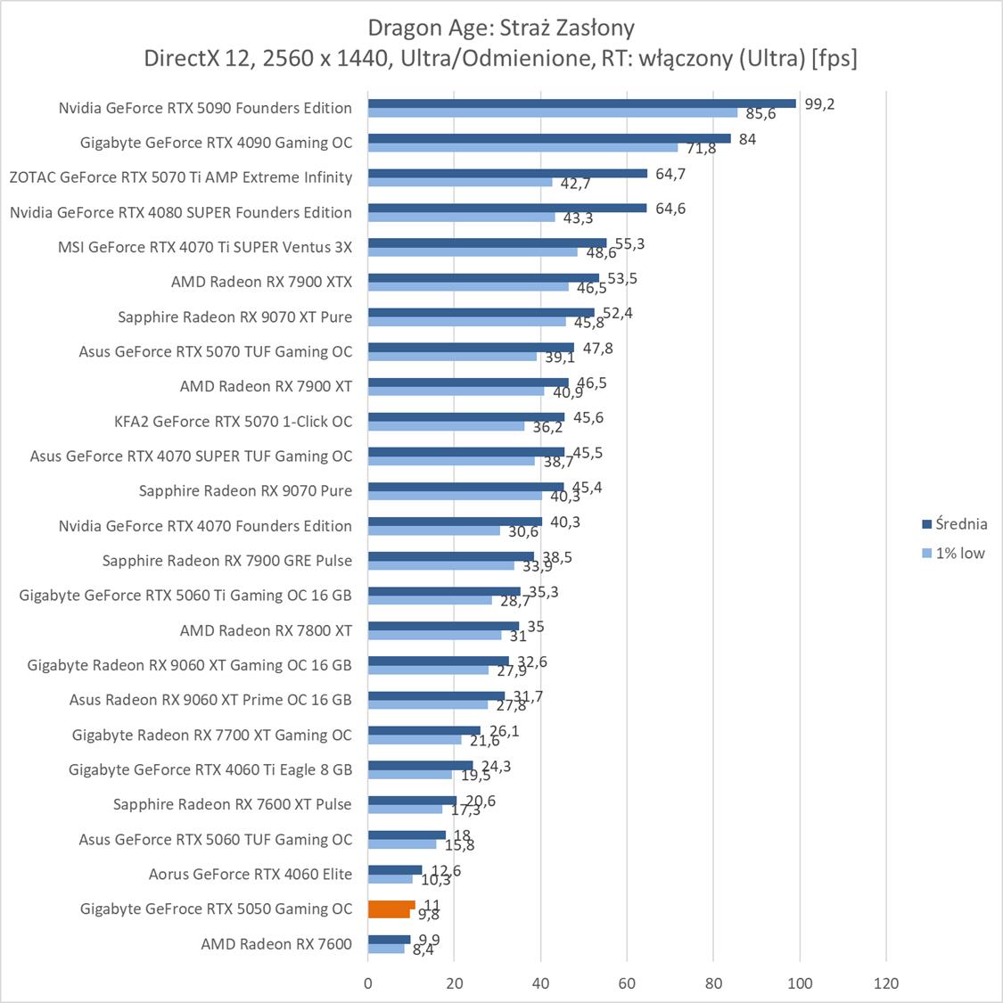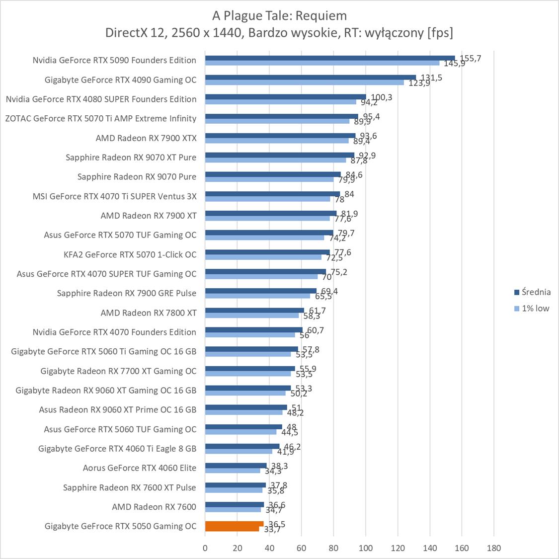 Już w pierwszej rozdzielczości aż w 8 grach mamy poniżej 60 fps. Część gier jak Dragon Age czy Wukong będą niegrywalne. Widać więc od razu, że RTX 5050 oferuje naprawdę niską wydajność.