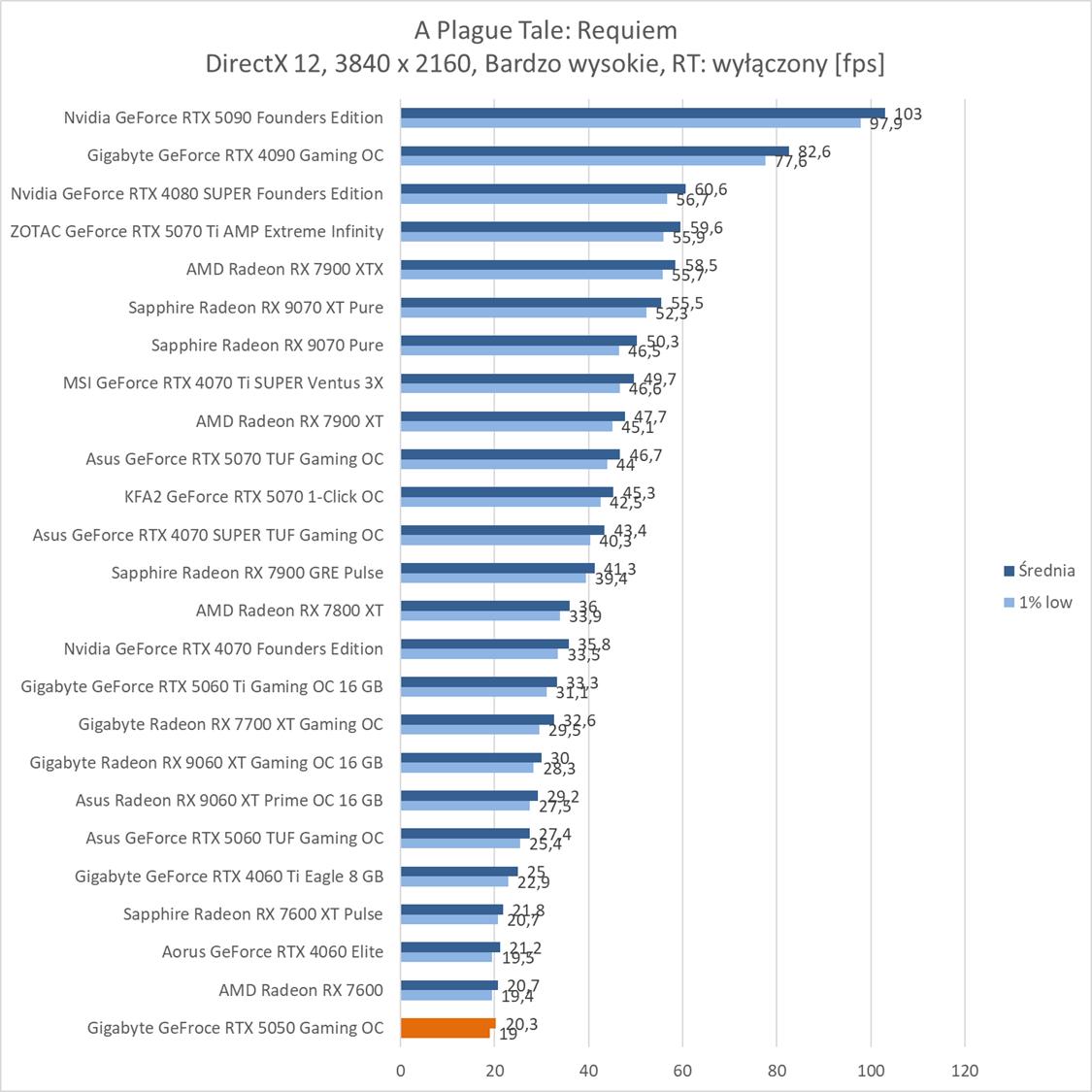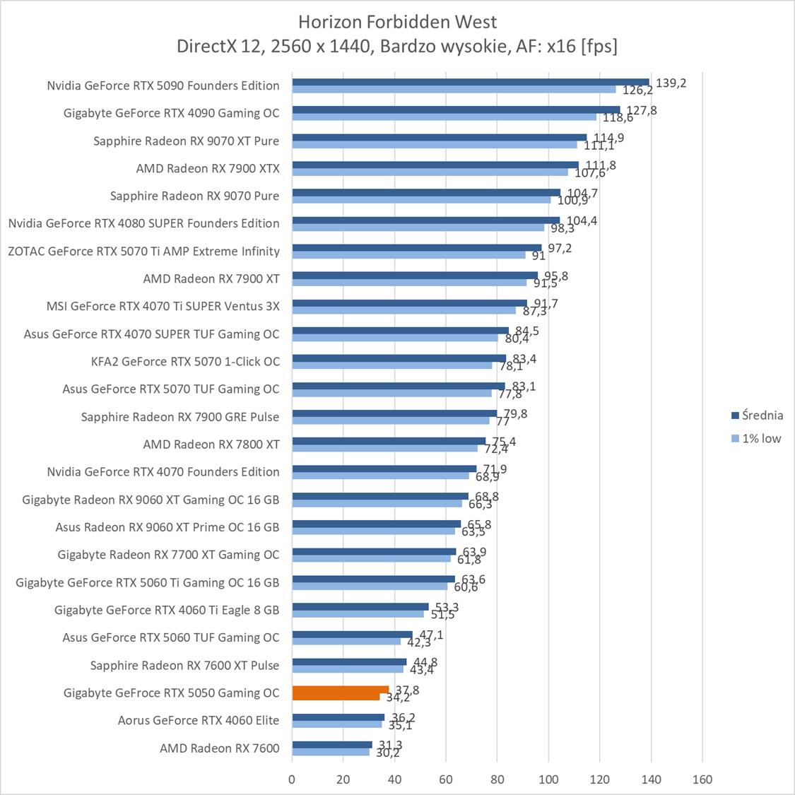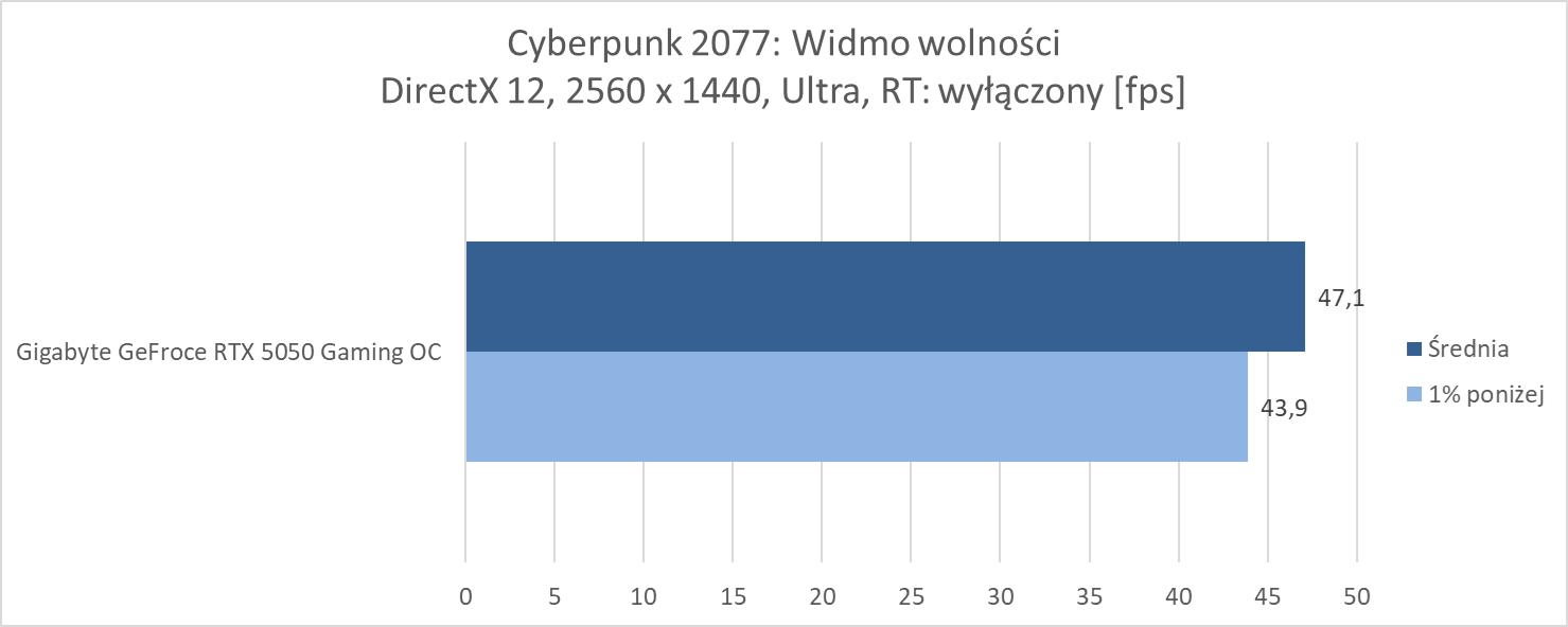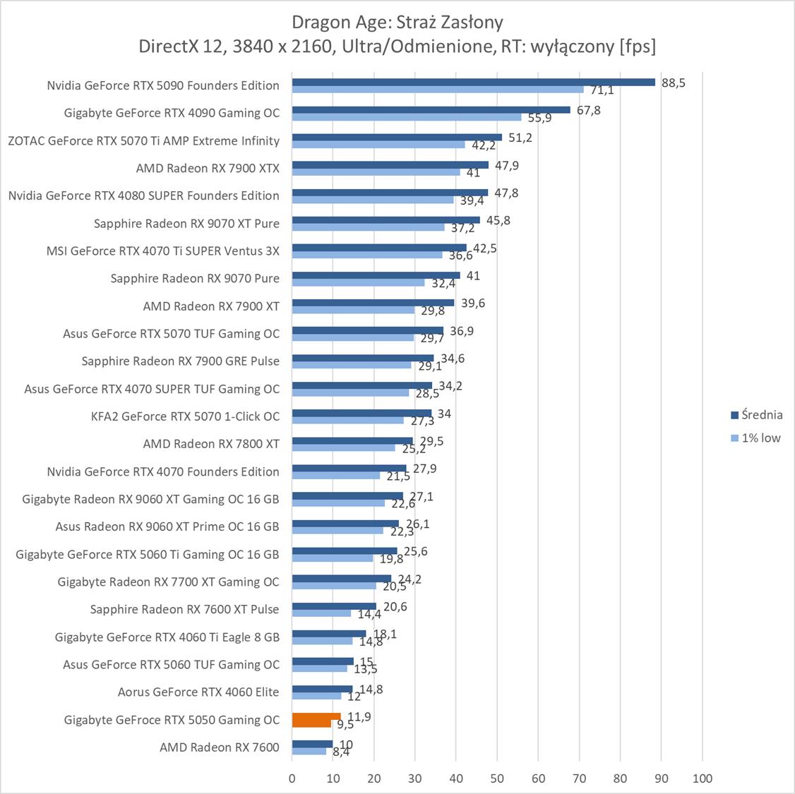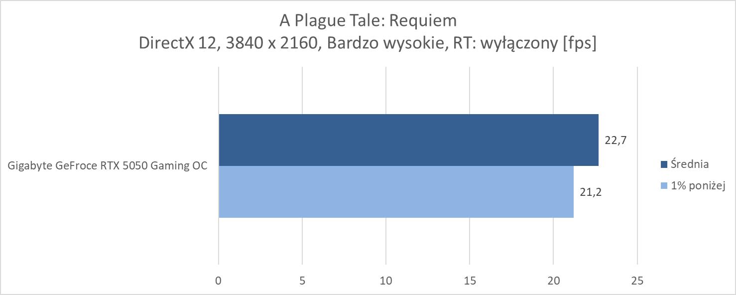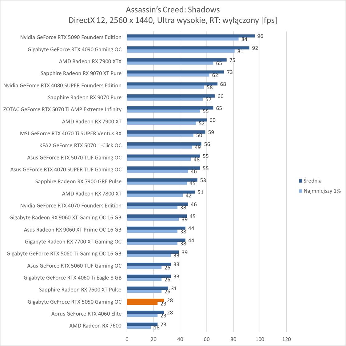 Już w pierwszej rozdzielczości aż w 8 grach mamy poniżej 60 fps. Część gier jak Dragon Age czy Wukong będą niegrywalne. Widać więc od razu, że RTX 5050 oferuje naprawdę niską wydajność.