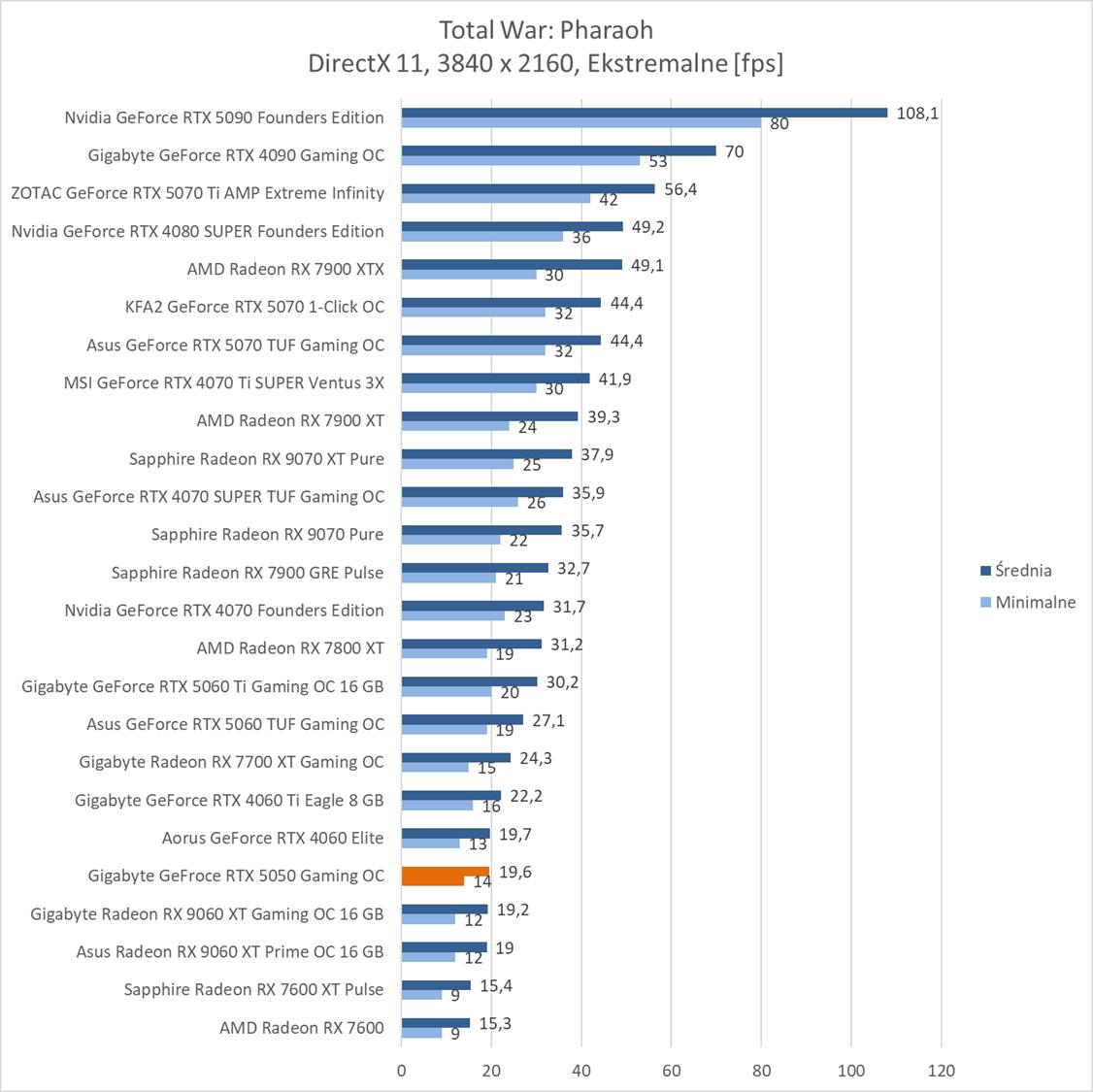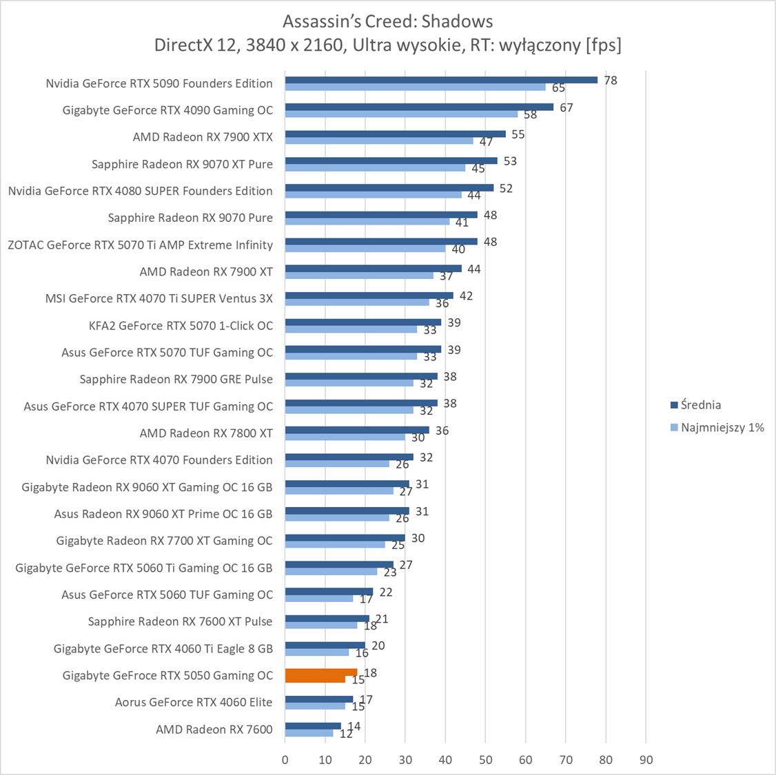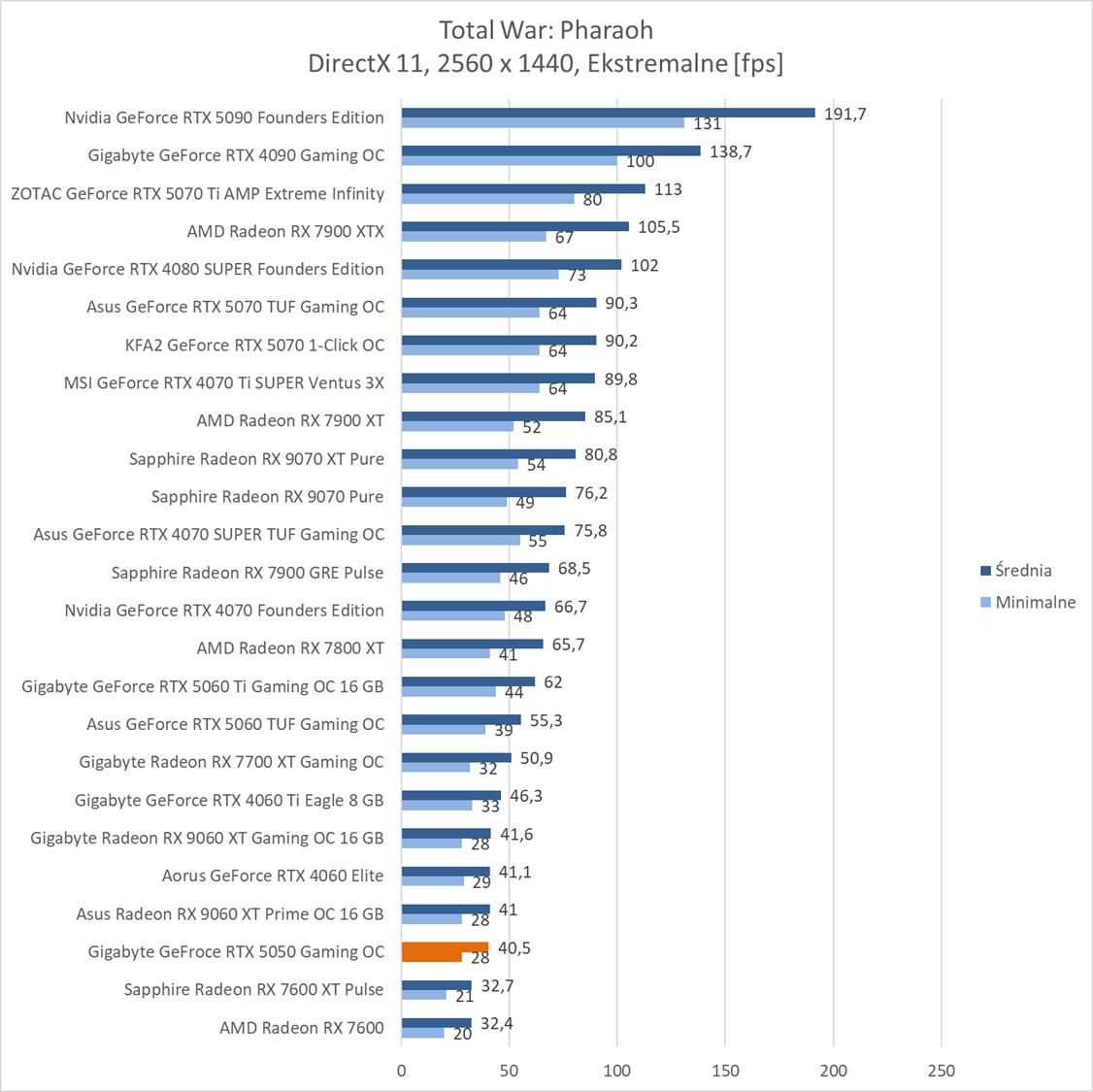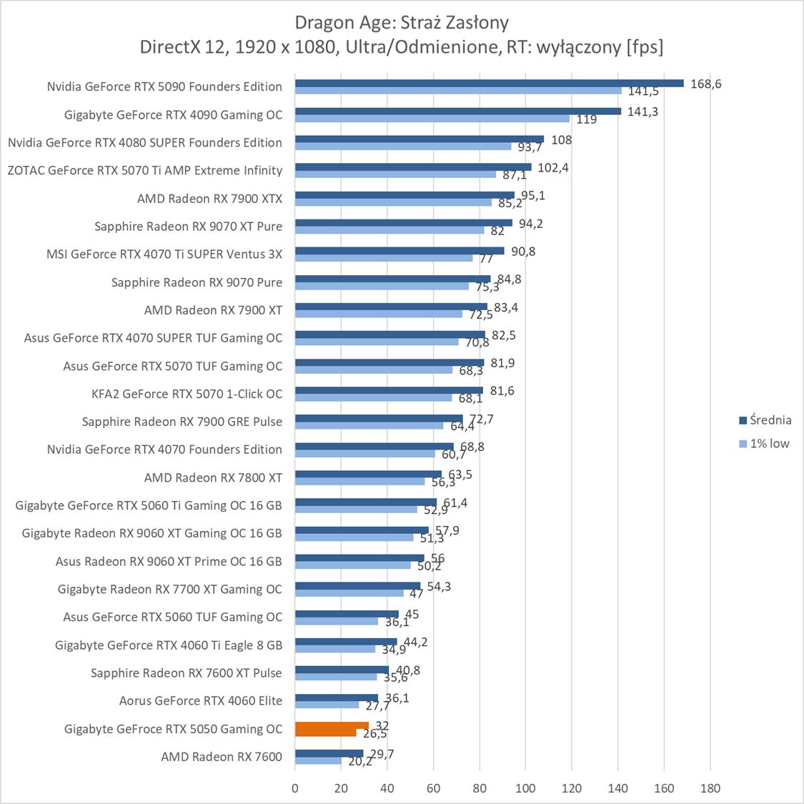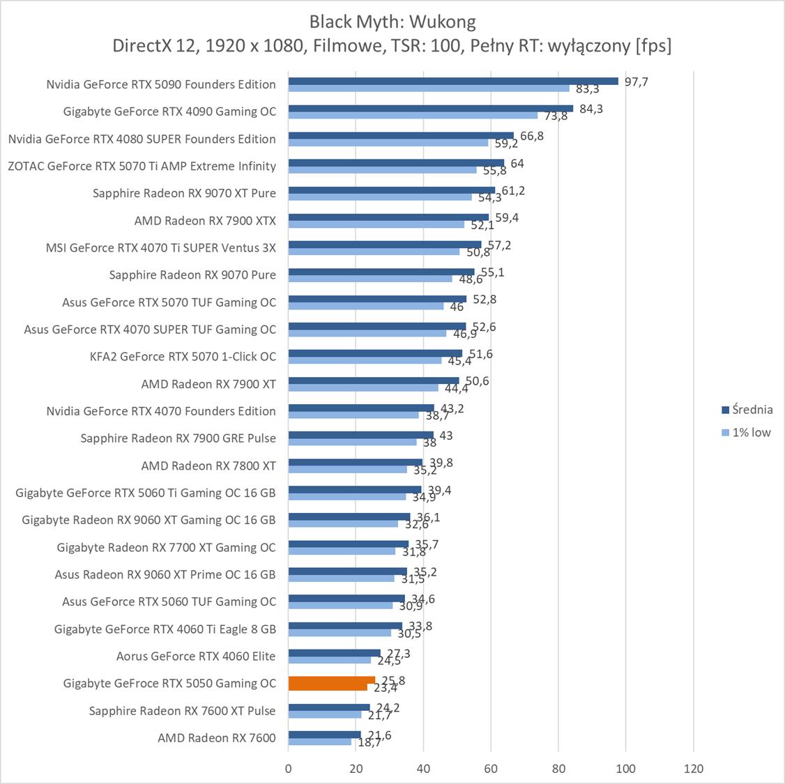 Już w pierwszej rozdzielczości aż w 8 grach mamy poniżej 60 fps. Część gier jak Dragon Age czy Wukong będą niegrywalne. Widać więc od razu, że RTX 5050 oferuje naprawdę niską wydajność.