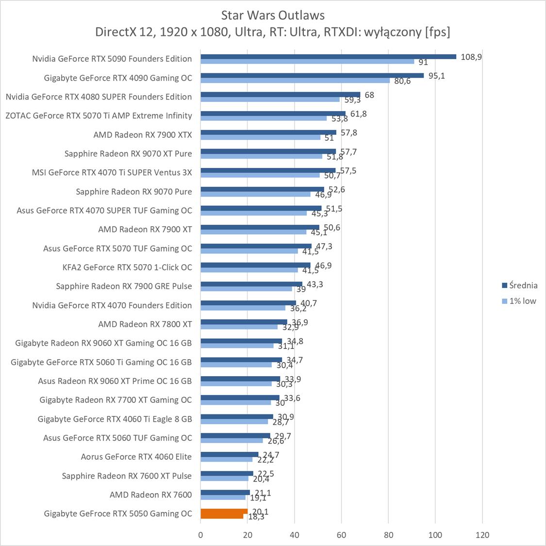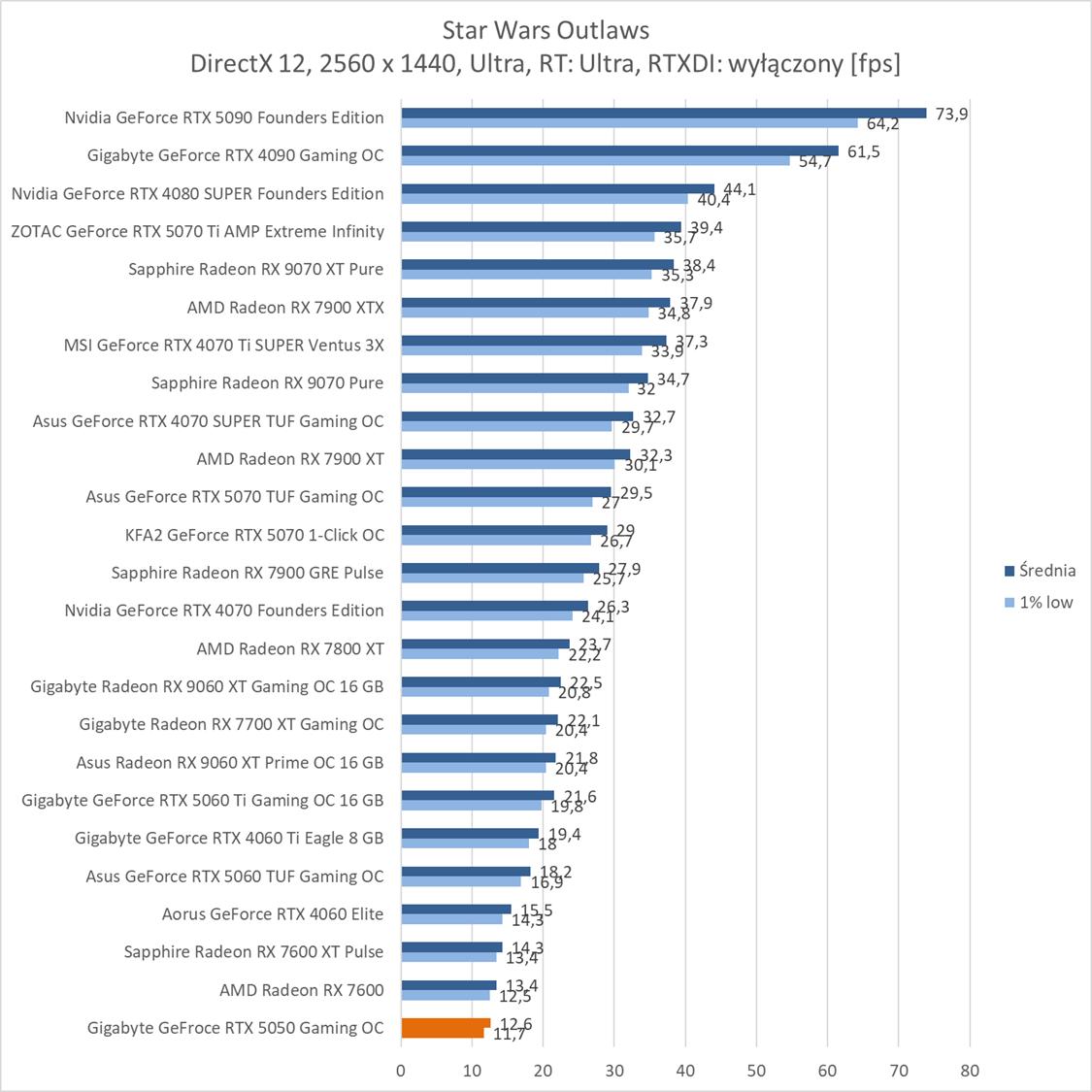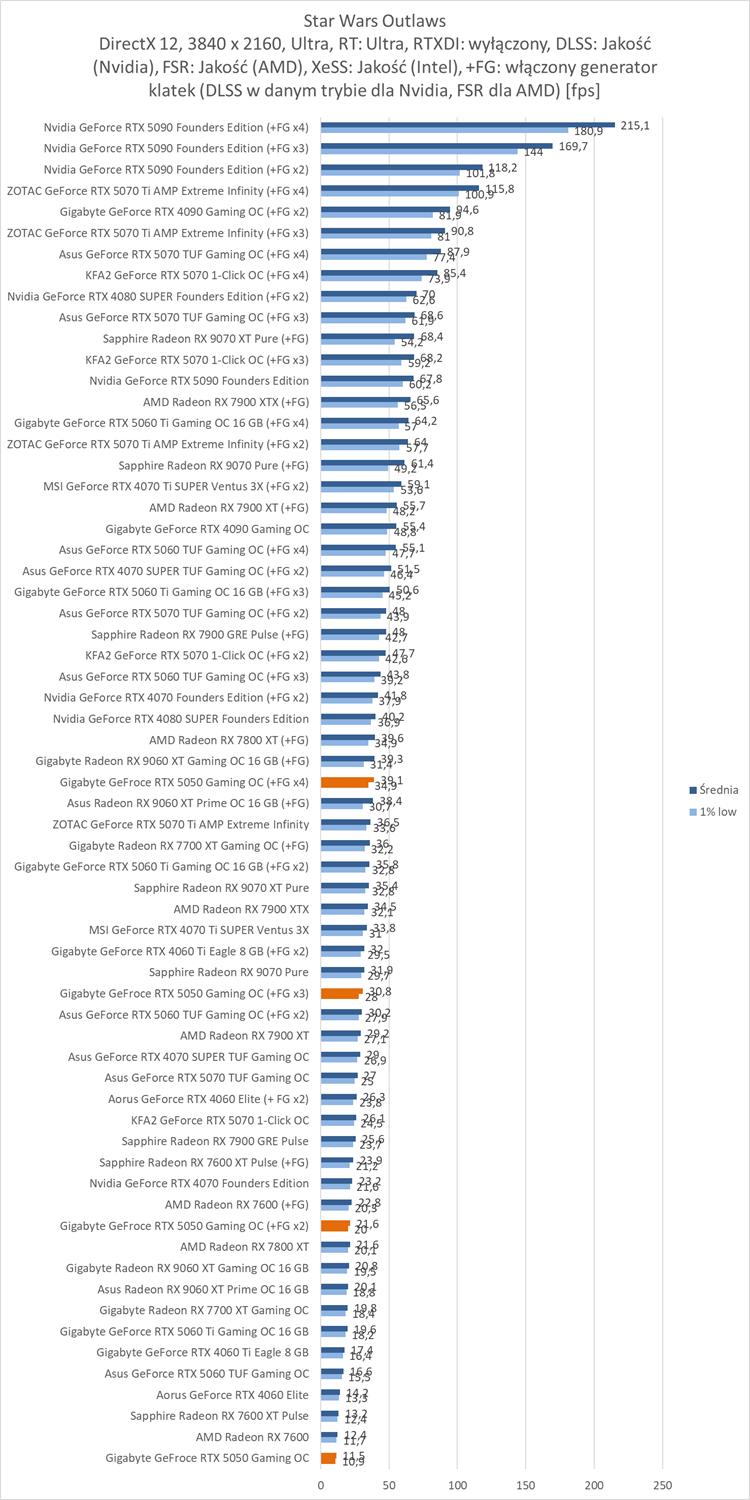 RTX 5050 wspiera DLSS 4 i średnia w Cyberpunku z generatorem x4 jest nawet wysoka, ale 1% low pozostaje niski i przy takim wyniku niestety nie ma zbytnio mowy o płynnej rozgrywce. Inaczej jest w Star Wars Outlaws, gdzie już przyjemnie sobie pogracie.