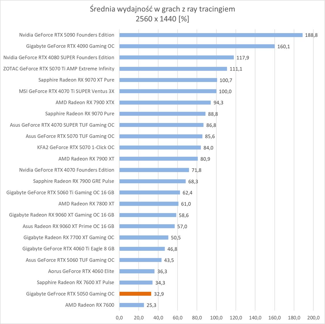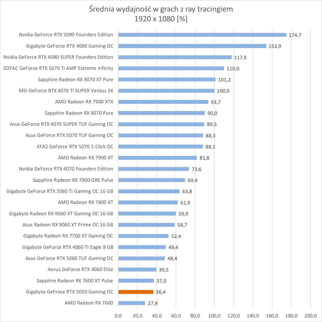 W przypadku gier z ray tracingiem karta plasuje się pomiędzy 7600 XT a 7600. Przewaga nad 7600 wynosi ok. 30,5% i 30%. Przewaga RTX 4060 to kolejno ok. 8,5% i 10,3%. Ponownie też warto zwrócić uwagę na znacznie wyższe wyniki RTX 5060. Tutaj wyższy model ma przewagę ok. 33% oraz 32,2%.