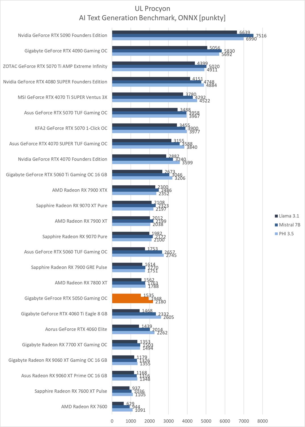W programach jedynie przy generowaniu tekstu przy LLama 3.1 jest trochę wyższy wynik niż nawet w przypadku RTX 4060 Ti. W pozostałych testach wyniki są niższe niż RTX 4060.