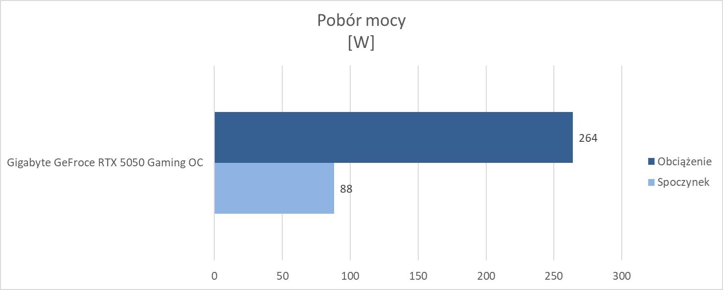 Pobór mocy pod obciążeniem jest najniższy spośród testowanych grafik. Natomiast jest on już bliskie RTX 4060.