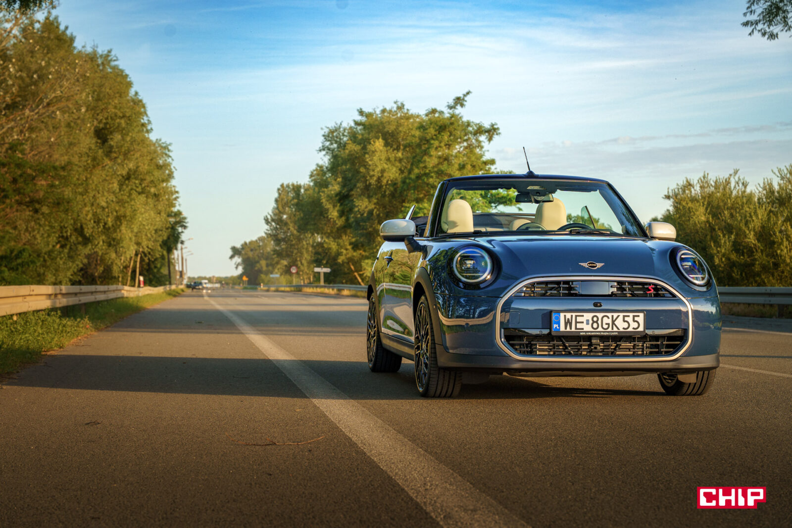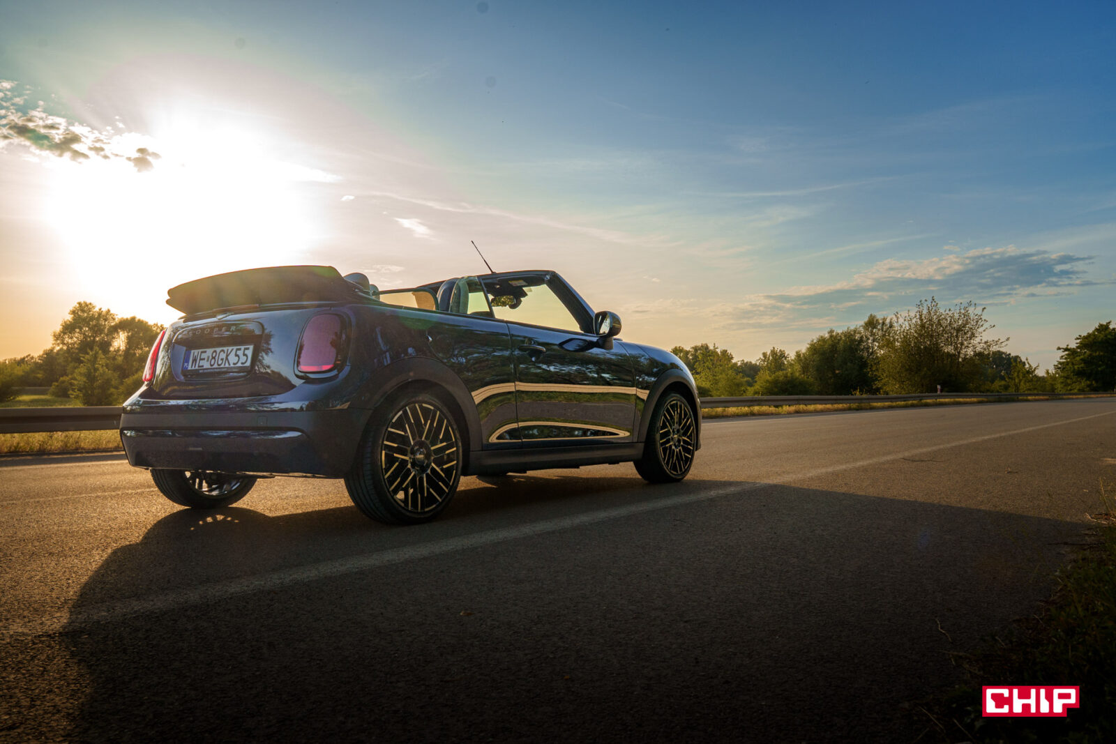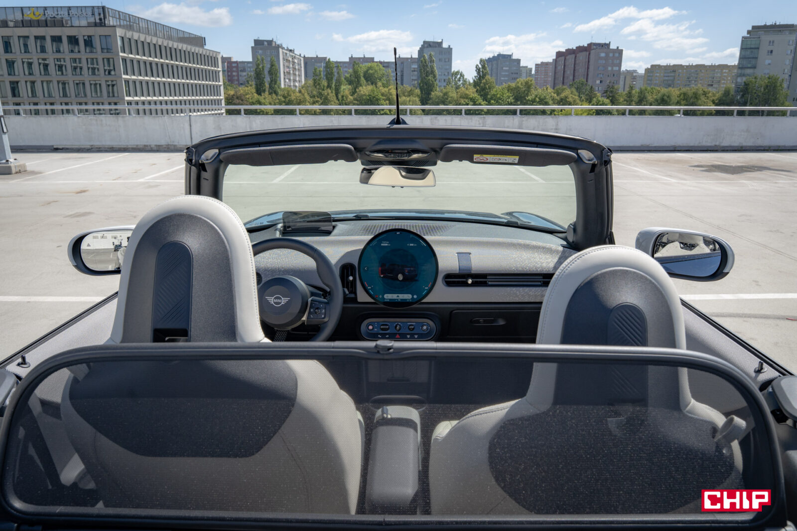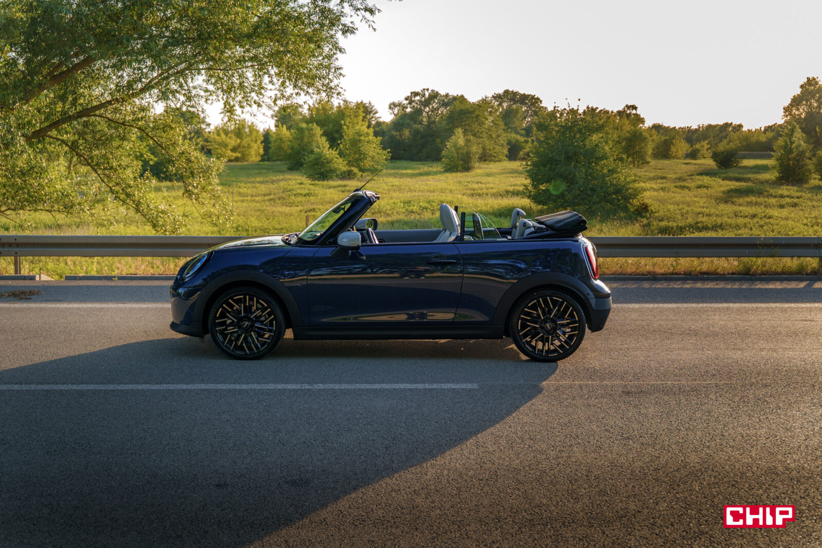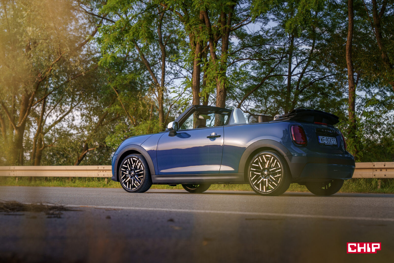 Okrągłe reflektory LED, subtelny grill i tylne lampy z motywem Union Jack są wierne DNA MINI, ale otwarty dach dodaje mu niepowtarzalnego charakteru. Wymiary (3,86 m długości, 1,73 m szerokości) są niemal identyczne jak w SE, ale sylwetka wydaje się bardziej swobodna.