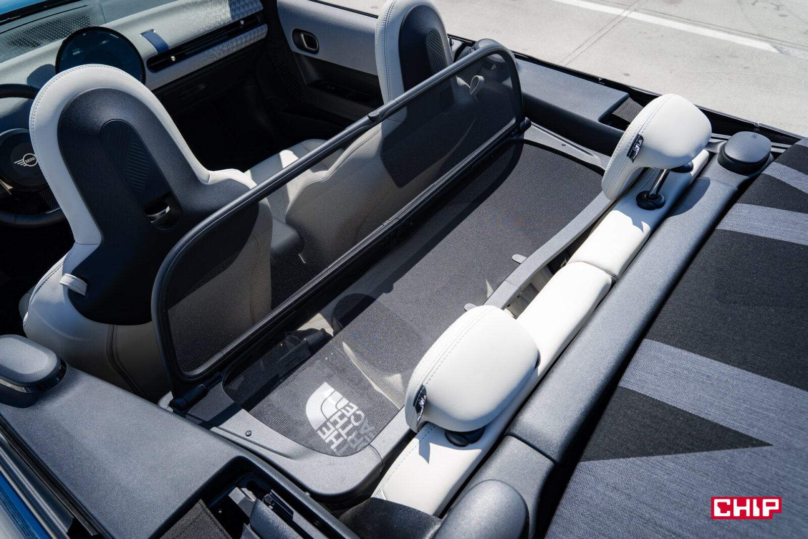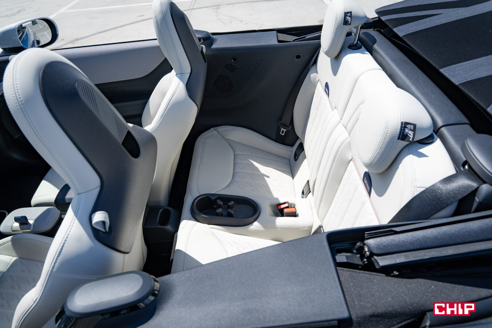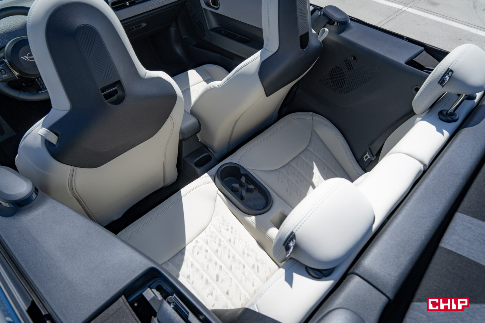 Na przekór doświadczeniom z fotela kierowcy, z tyłu układ również jest inny, ale całkowicie w drugą stronę. W elektrycznym MINI Cooperze, siedzenia z tyłu nie wyglądały ani trochę atrakcyjnie — samochód jasno nimi wskazywał, że to mało użyteczna ławeczka i raczej nie ma opcji, żeby ktoś tam wsiadł. Fotele nie wyglądały zachęcająco, a i środkowy tunel rozciągnięty na całą długość samochodu dodatkowo odbierał miejsca na nogi. W kabriolecie, o ironio, sytuacja była skrajnie inna. Z tyłu znajdziemy pełnoprawne, dobrze wyglądające i wygodne fotele, nawet z cup holderem po środku. Aż ma ochotę się wsiąść do tyłu…