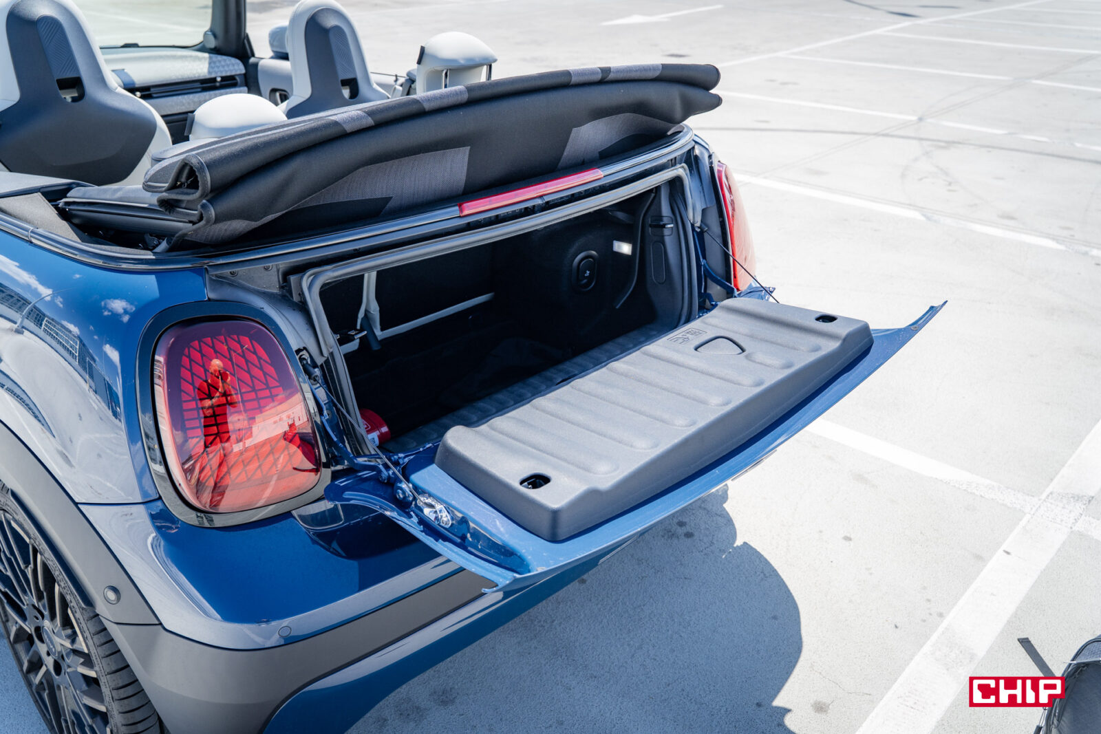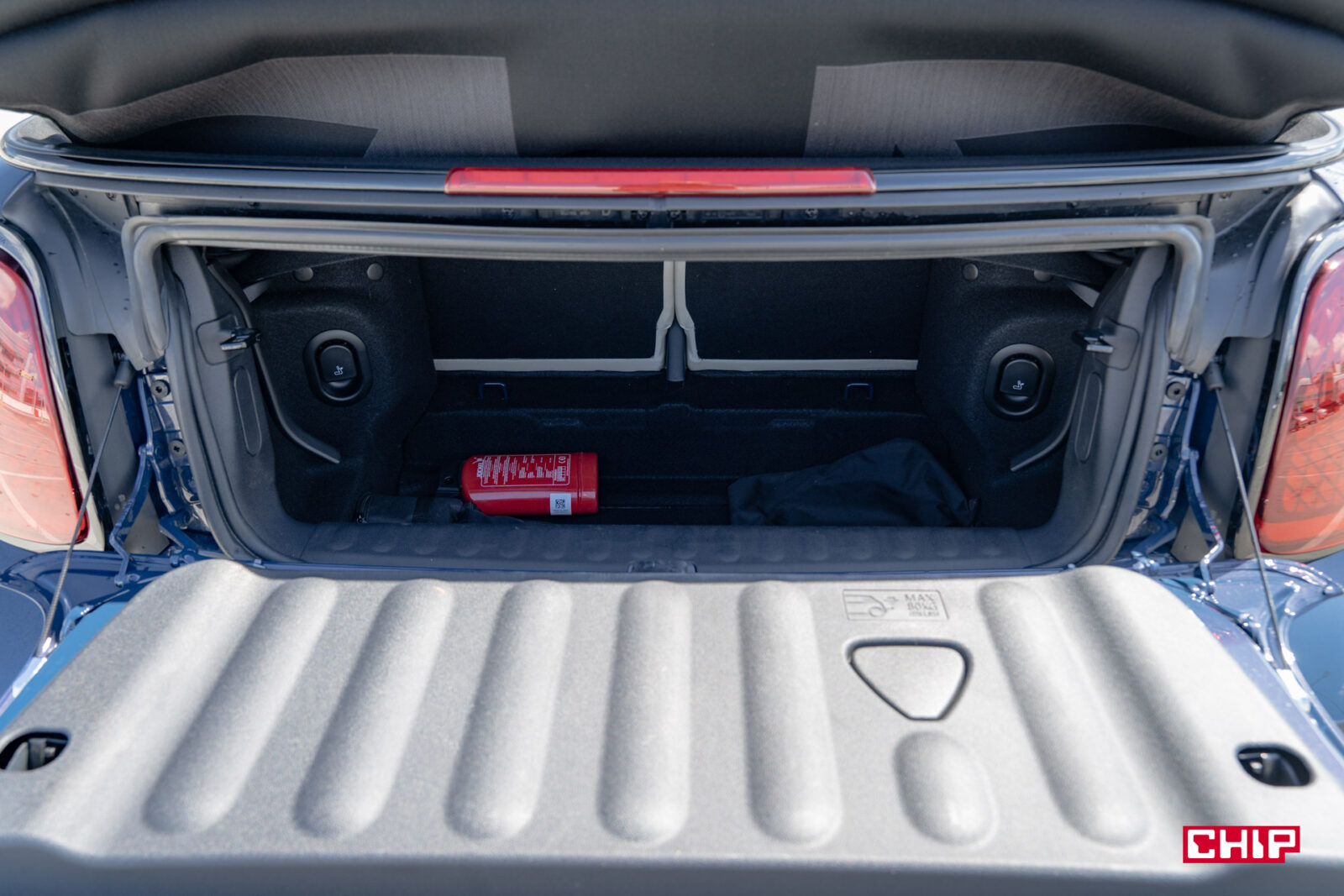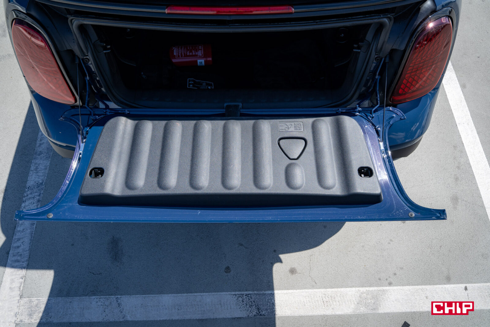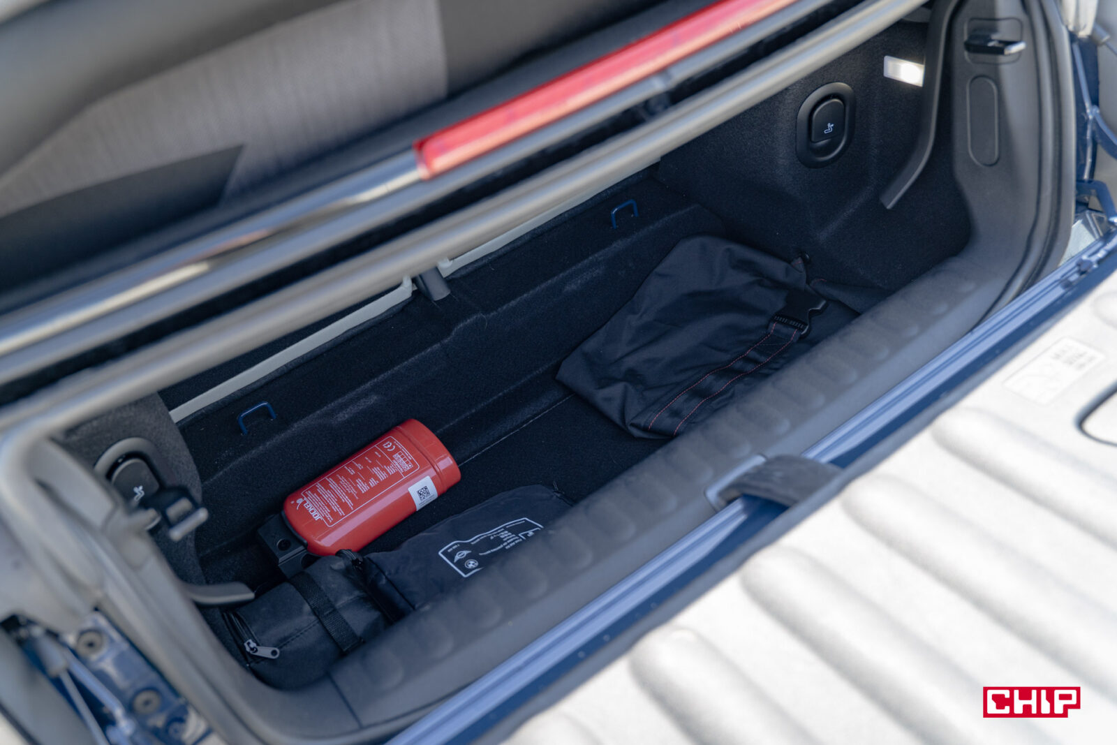 Z bagażnikiem sytuacja jest niewiele lepsza. Ten w modelu SE oferuje zaledwie 211 litrów pojemności, która po złożeniu siedzeń rośnie do około 731 litrów. Dwie duże torby z zakupami i kabel do ładowania samochodu praktycznie wypełniają całą dostępną przestrzeń przy złożonych fotelach. Co jednak ciekawe, to fakt, że takie wartości wydają się luksusem w porównaniu do tego, co czeka nas w Cabrio — bo tam bagażnik ma pojemność zaledwie 160 litrów. No i trzeba pamiętać, że jeśli macie osłonę przeciwwiatrową i chcecie ją akurat zdjąć, żeby chociaż jedna osoba czy torba z zakupami zmieściła się do tyłu, to musicie schować ją do bagażnika, tym samym odbierając sobie lwią część przestrzeni bagażowej. O dłuższej wyprawie (mimo spalinowego silnika) nie ma więc co marzyć, a nawet wyjazd do marketu na zakupy może nie zakończyć się sukcesem. To już jest typowo lifestylowy samochód.