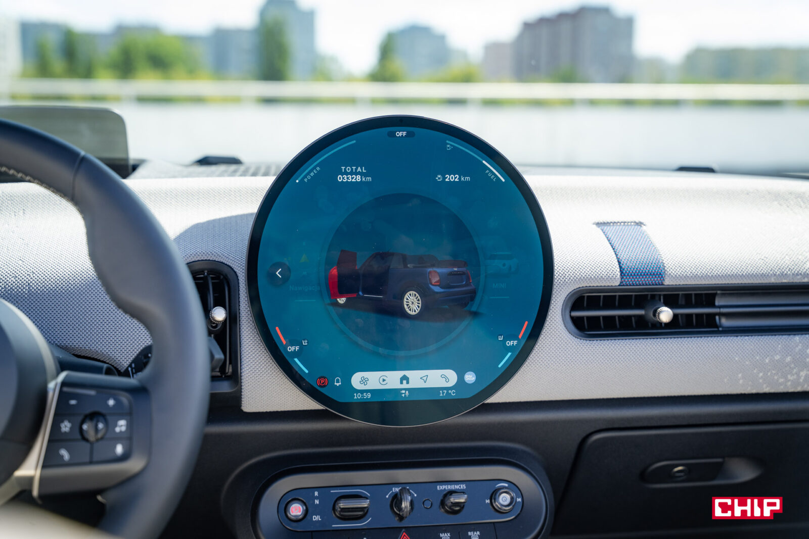 Środek MINI Coopera kontynuuje ekscentryczną stylistykę. Jak wspominałem, centralnym elementem wnętrza jest okrągły wyświetlacz OLED o przekątnej 9,5 cala — to nawiązanie do klasycznych zegarów MINI, jednak teraz w nowoczesnej, efektownej formie. System MINI Operating System 9 wyróżnia się przejrzystością i intuicyjną obsługą, a wyraziste kolory oraz wysoka rozdzielczość zapewniają wysoki komfort użytkowania. Wyposażenie obejmuje wiele rozrywkowych i przydatnych opcji, jak planowanie ładowania, gry AirConsole (na przykład UNO czy Overcooked) czy możliwość skreczowania utworów na Spotify poprzez poruszanie płytą, która pokrywa wtedy całą powierzchnię ekranu.