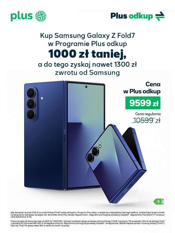 Dla osób, które zdecydują się na zakup topowego modelu Galaxy Z Fold 7 5G 16 GB/1 TB, Plus przygotował specjalną zachętę. Korzystając z Programu Plus Odkup, można zyskać dodatkowy bonus w wysokości 1000 zł. Program ten umożliwia odsprzedaż starego telefonu, a uzyskaną z wyceny kwotę przeznaczyć na pokrycie części kosztów nowego smartfona lub opłat abonamentowych. Co więcej, niezależnie od wersji pamięciowej, wszystkie nowe składane smartfony Galaxy Z Fold 7 objęte są promocją Samsunga, w ramach której można otrzymać zwrot gotówki nawet do 1300 zł, w zależności od wybranego modelu i konfiguracji.