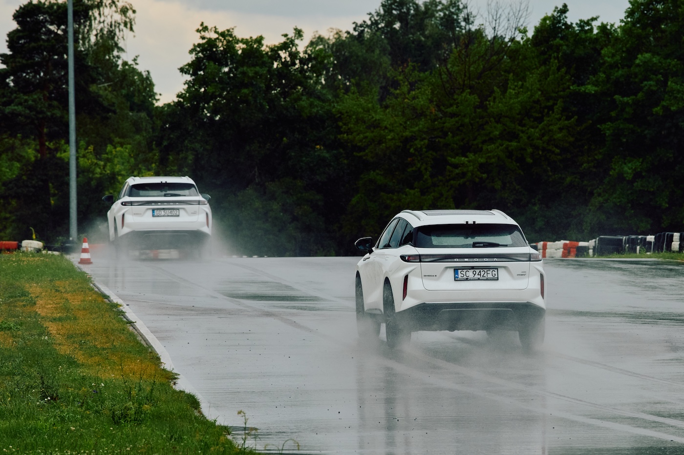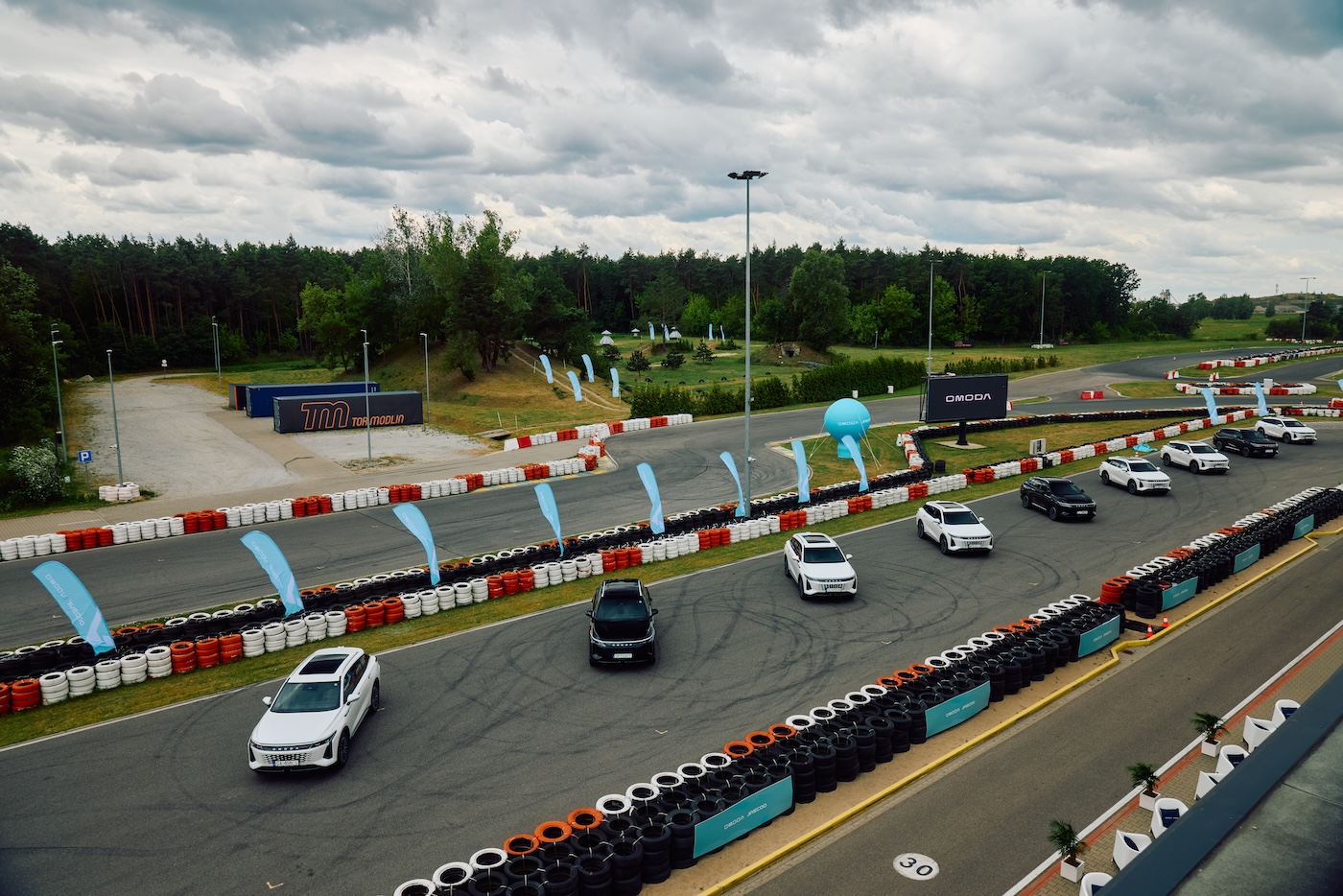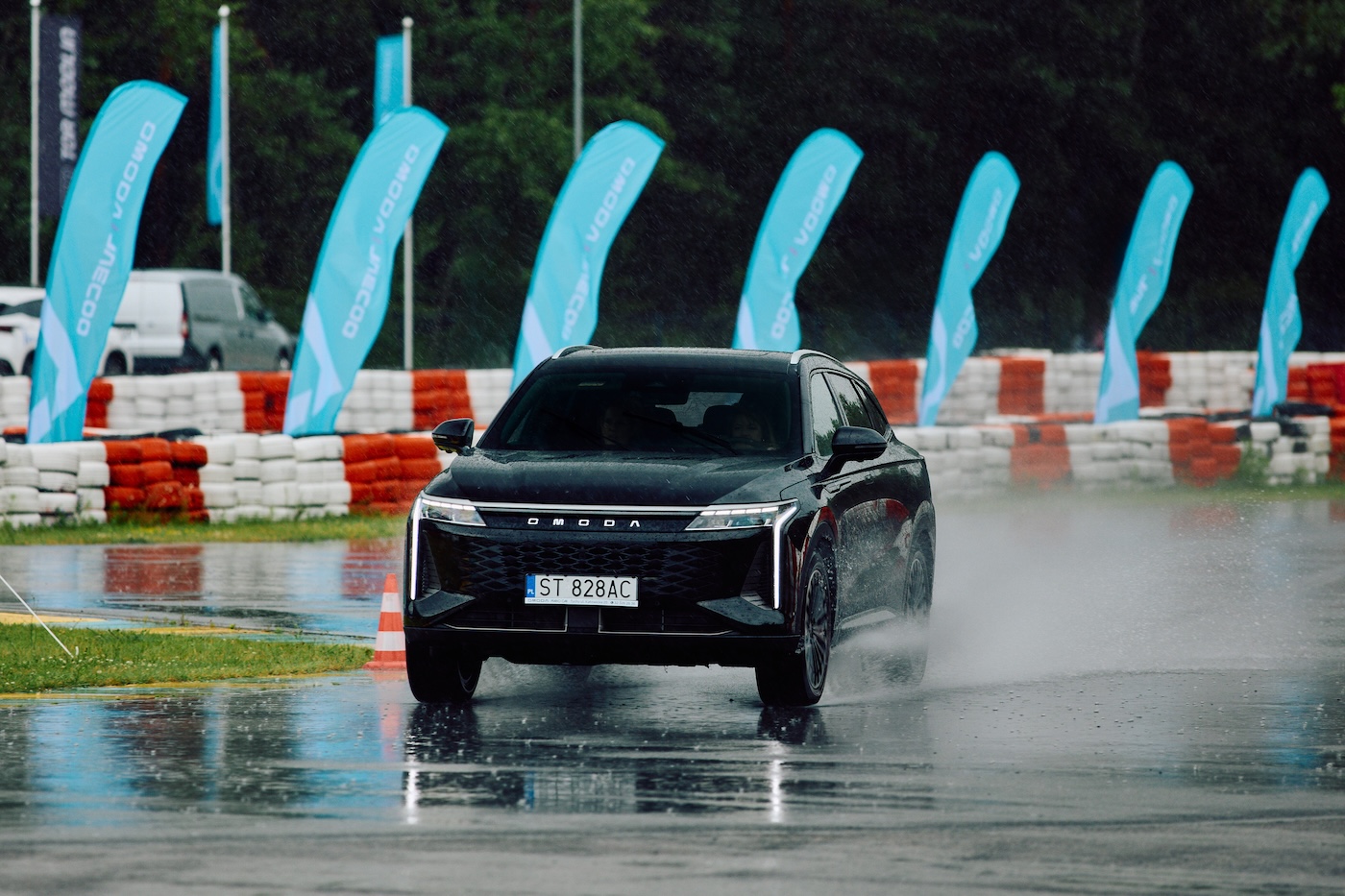 Podczas jazd testowych na torze asfaltowym Omoda 9 pokazała, że oprócz komfortu, potrafi też odnaleźć się w dynamicznych warunkach. Podczas próby szybkiego slalomu pozytywnie wypadło zawieszenie CDC — w trybie Sport samochód zachowywał stabilność, a reakcje na zmianę kierunku były płynne i przewidywalne, choć zdecydowanie nie jest to żwawy samochód rajdowy. Co jednak było bardziej odczuwalne, to fakt, że przy mocniejszym skręcie nawet w prędkości około 20 km/h opony bardzo głośno śpiewały. To wynika z „gum”, które dostajemy z samochodem, oraz mógł na to wpłynąć nagrzany asfalt; chociaż nie był to najcieplejszy dzień w roku, a standardowe około 30 stopni pod koniec czerwca.