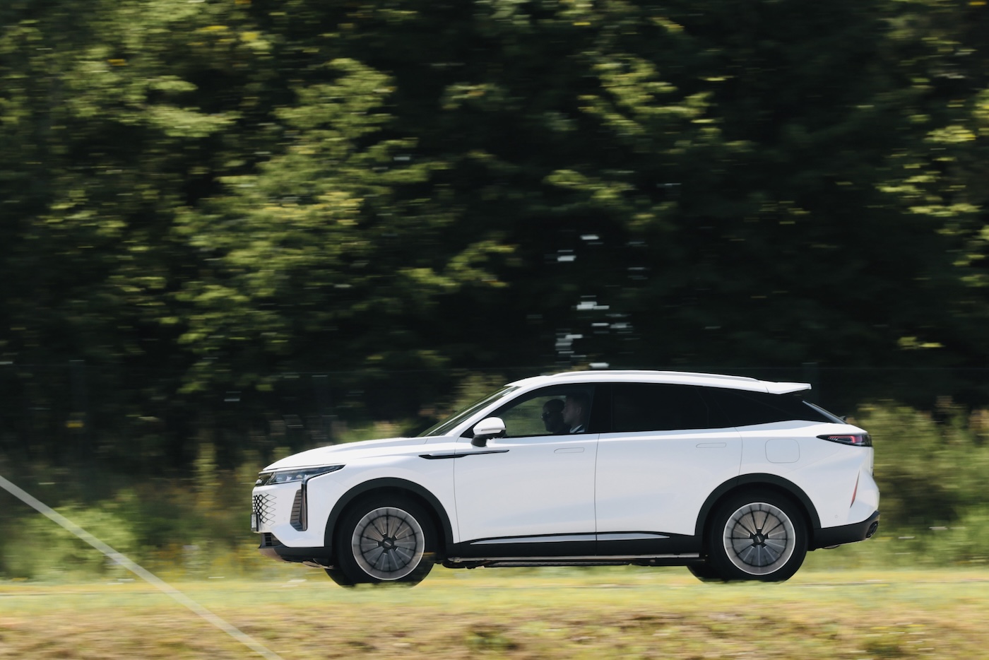 Mierząc 4775 mm długości, 1920 mm szerokości (z lusterkami) i 1671 mm wysokości, z rozstawem osi 2800 mm i ważąc 2195 kg, auto plasuje się w środku segmentu D-SUV. Dynamicznie opadająca tylna szyba, długa maska i mocno pochylona przednia szyba (podgrzewana, co docenimy zimą) nadają mu sportowy, zadziorny wygląd. Współczynnik oporu powietrza na poziomie 0,308 świadczy o dopracowanej aerodynamice, a wysuwane klamki, 20-calowe felgi z oponami Michelin e-Primacy i dynamicznymi kierunkowskazami oraz animacją powitalną dodają nowoczesnego sznytu. Chińczycy przyzwyczaili nas do przepychu i wysokich standardów gadżeciarstwa w rozsądnych pieniądzach — i tutaj rozczarowania nie będzie.