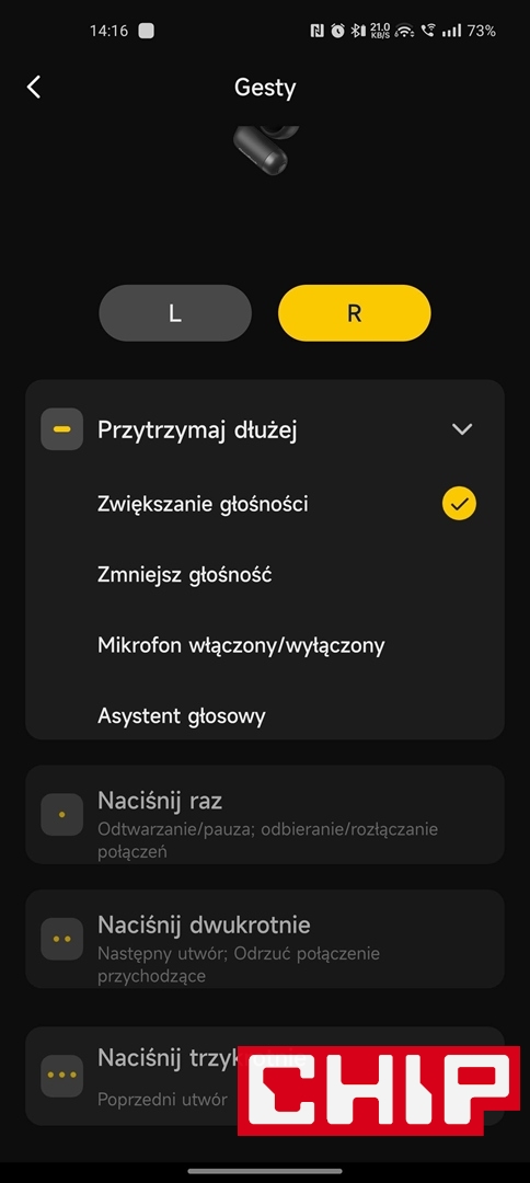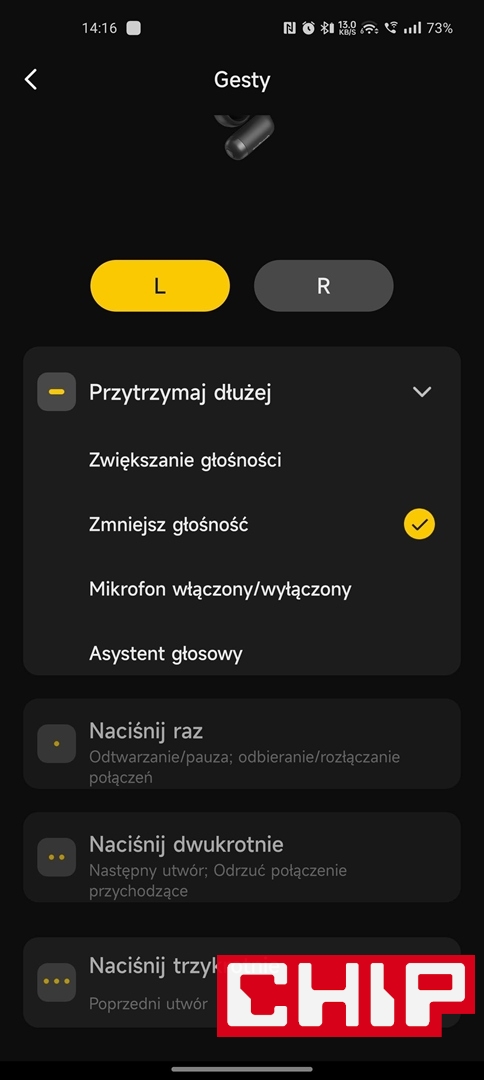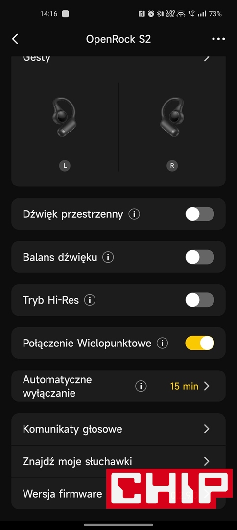 W słuchawkach znalazł się dynamiczny przetwornik 12 mm, połączony z komorą BassDirect, która ma wzmocnić tony niskie bez konieczności wkładania słuchawki do ucha. Wedle producenta możemy liczyć na moc wyjściową rzędu nawet 30 mW, poziom głośności na poziomie ponad 94 dB SPL, obsługę kodeków LDAC, AAC i SBC, a do tego wsparcie algorytmu LISO 2.0, który to odpowiada za dynamiczne balansowanie tonów niskich i wysokich. Co ciekawe, w aplikacji nie znajdziecie opcji co do tego algorytmu, ale za to możecie w niej: