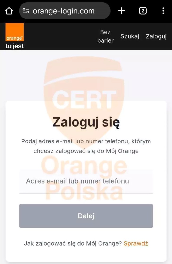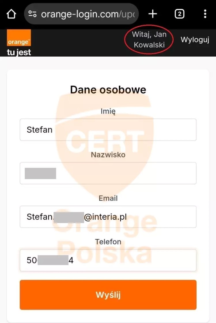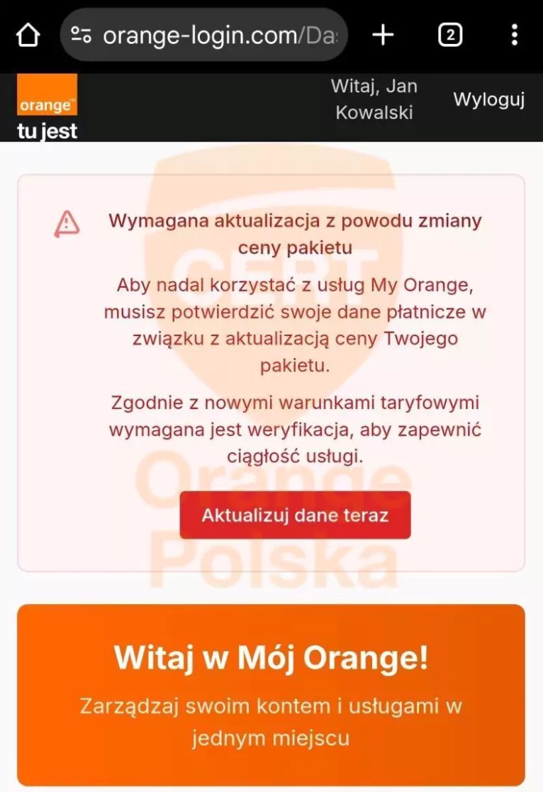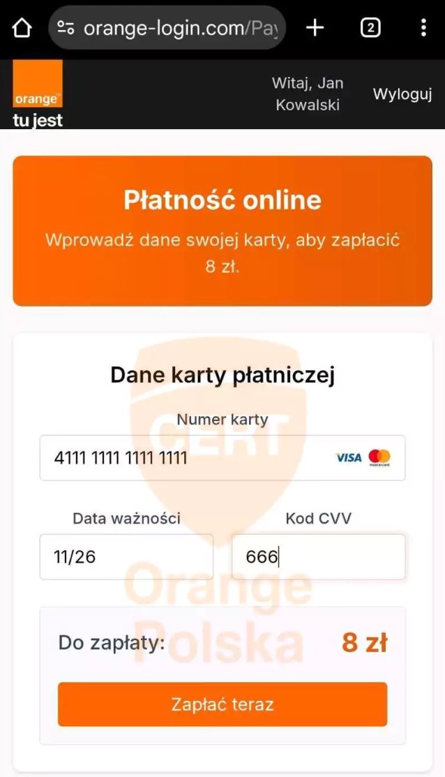 Po kliknięciu w link z fałszywego SMS-a, użytkownik trafia na stronę, która wizualnie może przypominać witrynę logowania do serwisów Orange Polska. Co ciekawe, po wpisaniu numeru telefonu system może wyświetlić fikcyjne dane osobowe, takie jak „Jan Kowalski” i nawet jeśli później podamy właściwe dane, wciąż tym Kowalskim pozostaniemy.