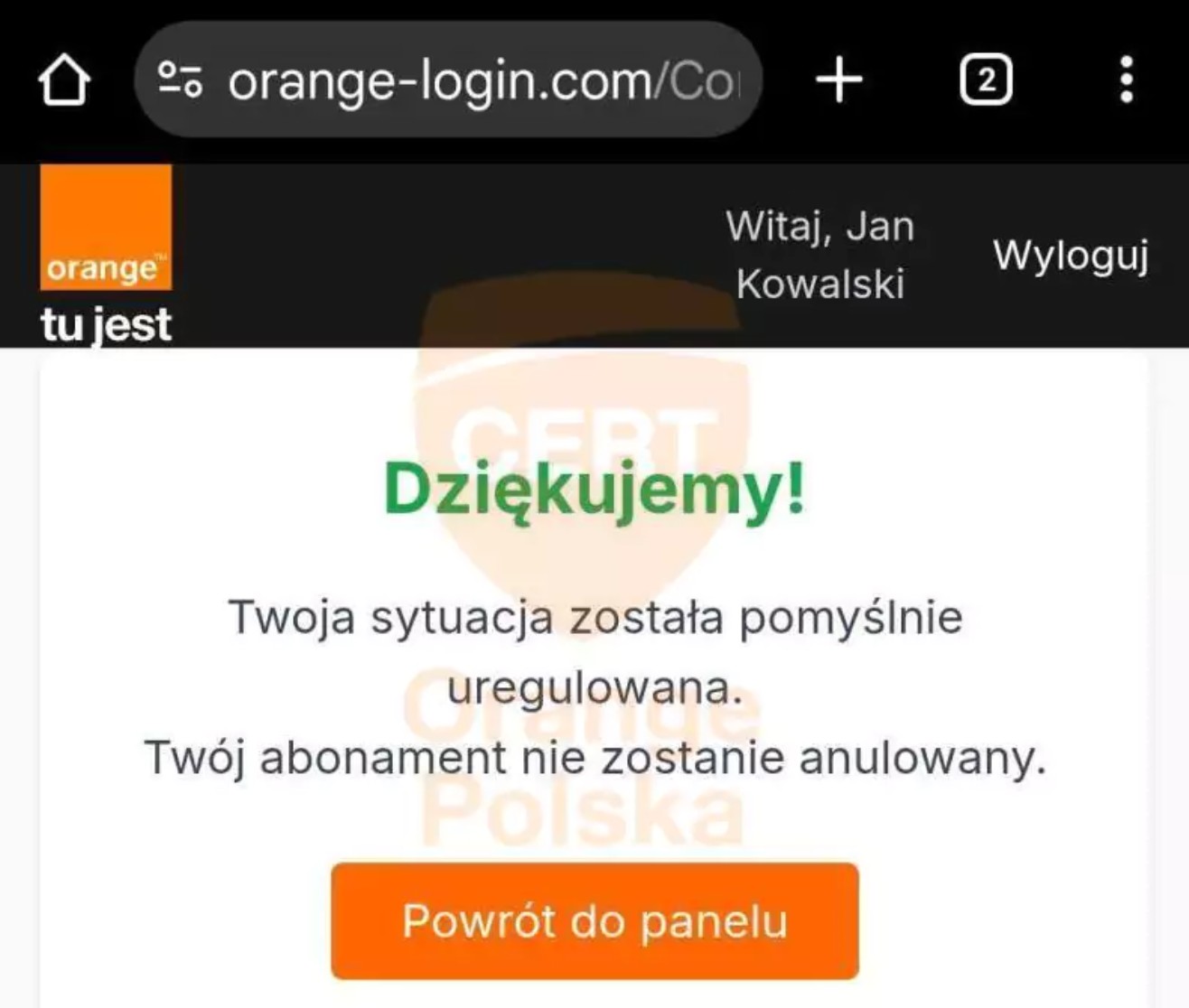 W analizowanym przypadku testowym, przytaczanym przez CERT Orange Polska, po podaniu danych karty, pojawiła się informacja o konieczności odczekania 20 sekund, po których zażądano podania kodu PIN z SMS-a. Co symptomatyczne dla tego typu oszustw, pomimo podania poprawnego numeru telefonu, SMS z PIN-em nie dotarł. Próba wpisania losowego czterocyfrowego kodu zakończyła się komunikatem o błędzie i informacją, że PIN powinien liczyć 6 cyfr. Po wpisaniu losowego sześciocyfrowego ciągu, strona wyświetliła komunikat: „Sytuacja została pomyślnie uregulowana!”, po czym przekierowała na prawdziwą stronę Orange.pl. To typowy zabieg mający na celu uśpienie czujności ofiary i skłonienie jej do uwierzenia, że „problem” został rozwiązany.