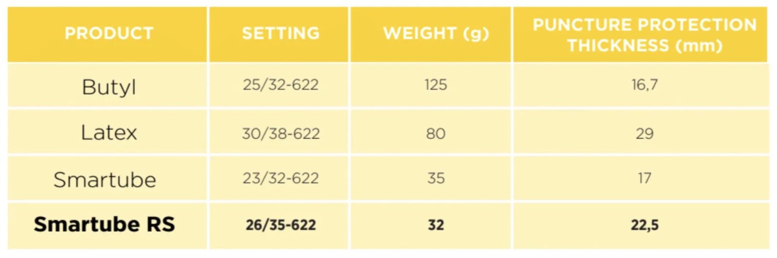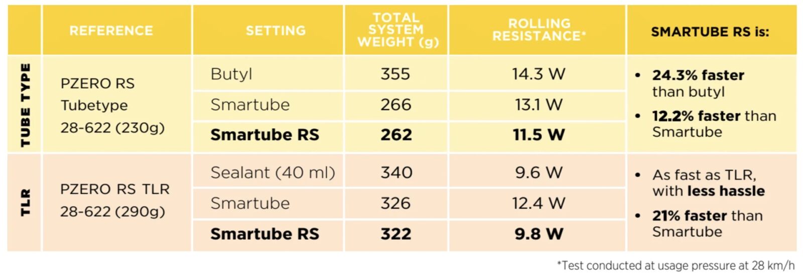 Dętka wspiera opony o szerokości od 26 do 35 mm, co pokrywa się z rosnącą popularnością szerszych opon szosowych. Testy na hamowniach pokazują, że w połączeniu z nowymi oponami Pirelli P Zero Race RS, zestaw z dętką Smartube RS jest tylko o 0,2 W wolniejszy pod względem oporu toczenia od odpowiednika bezdętkowego, choć jest przy tym lżejszy. Dla porównania – opona P Zero Race RS w rozmiarze 28 mm waży ok. 230 gramów, co w połączeniu z dętką Smartube RS (33 gramy) daje razem 263 gramów. Tymczasem bezdętkowa konfiguracja opony TLR (290 g) z uszczelniaczem (~30 g) i lekkim wentylem (~8 g) to razem około 328 g, co oznacza oszczędność rzędu nawet 65 gramów na kole na korzyść zestawu z dętką.