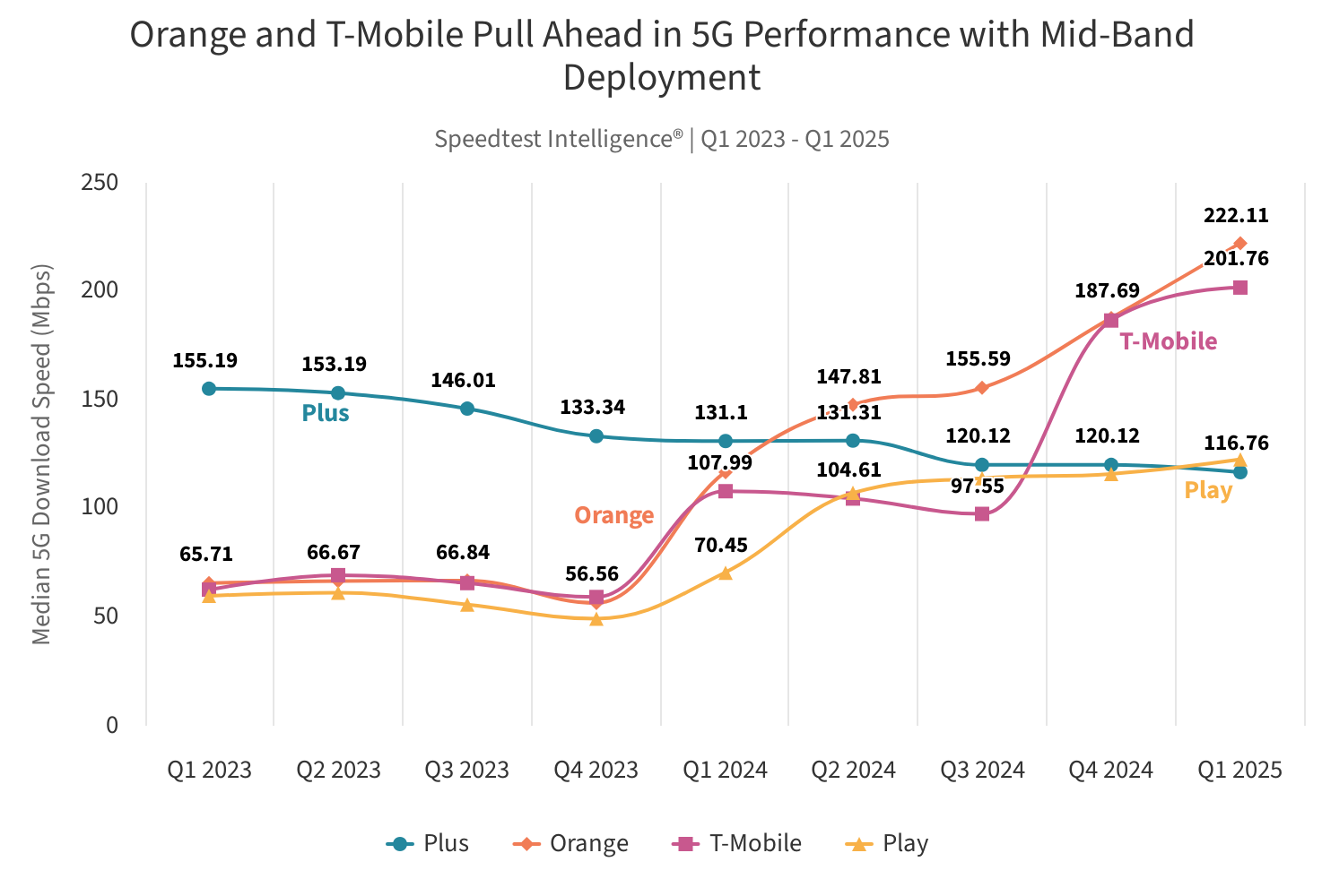 Między I kwartałem 2024, a I kwartałem 2025 roku mediana prędkości wzrosła w Play o 72%, o 86% w T-Mobile i aż o 90% w Orange.