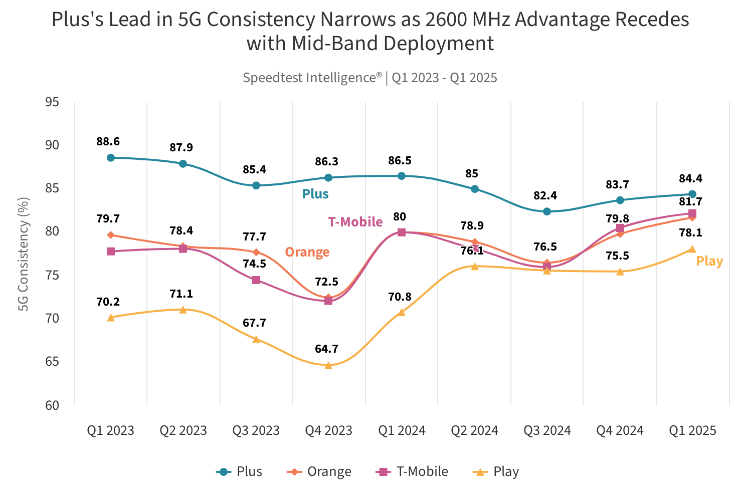 Co warto zaznaczyć, pomimo tego, że Plus zaczął tracić względem konkurentów na prędkości pobierania danych, tak mógł pochwalić się lepszym pokryciem sieci 5G. Mówiąc inaczej – sieć Orange i T-Mobile była wyraźnie szybsza, ale na mniejszym obszarze. Plus był wolniejszy, ale prędkość rozkładała się bardziej równomiernie na terenie całego kraju. To właśnie pod względem spójności sieci Plus pozostawał liderem aż do końca 2025 roku.