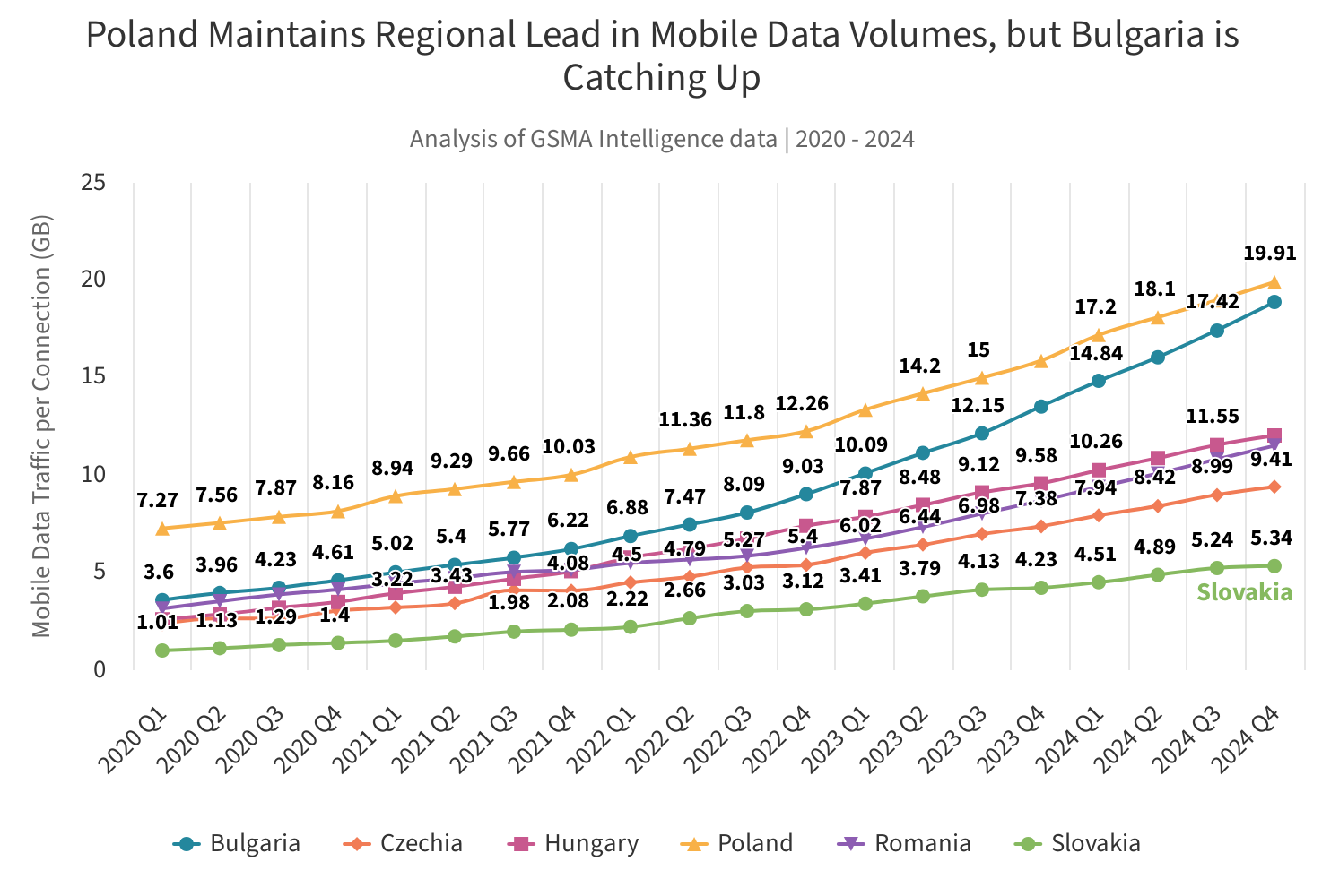 Czy sieć 5G była nam potrzebna? Zdecydowanie, bo na tle naszych sąsiadów Polacy przesyłają najwięcej danych w sieciach mobilnych. Tak było już w 2020 roku, a z roku na rok te wartości rosną i na koniec 2024 roku nadal pozostawaliśmy pod tym względem liderem. Średnia ilość przesyłanych danych wzrosła w tym czasie z 7,27 do 18,89 GB miesięcznie.